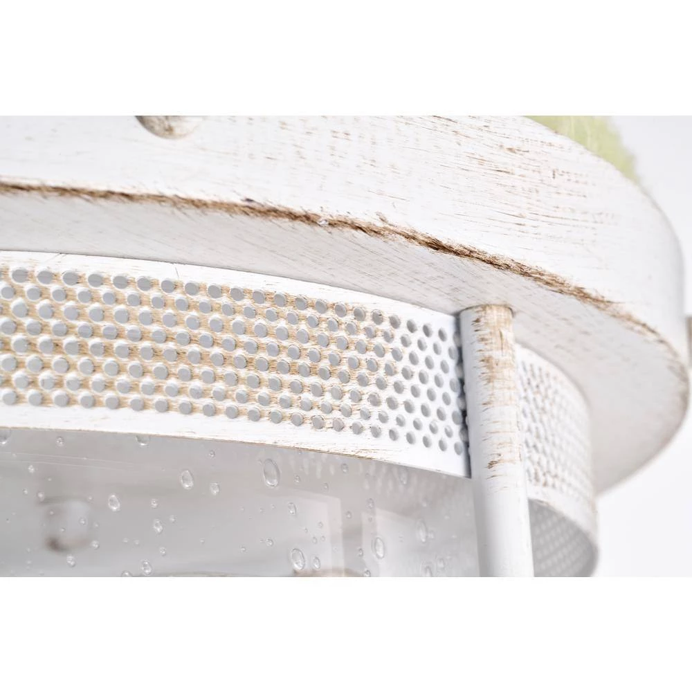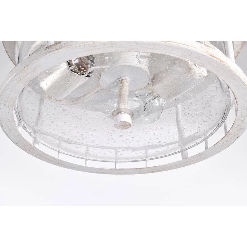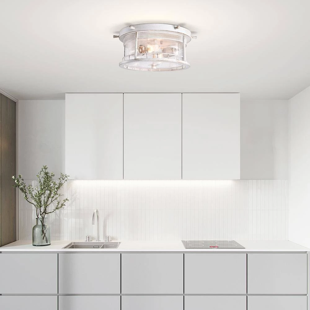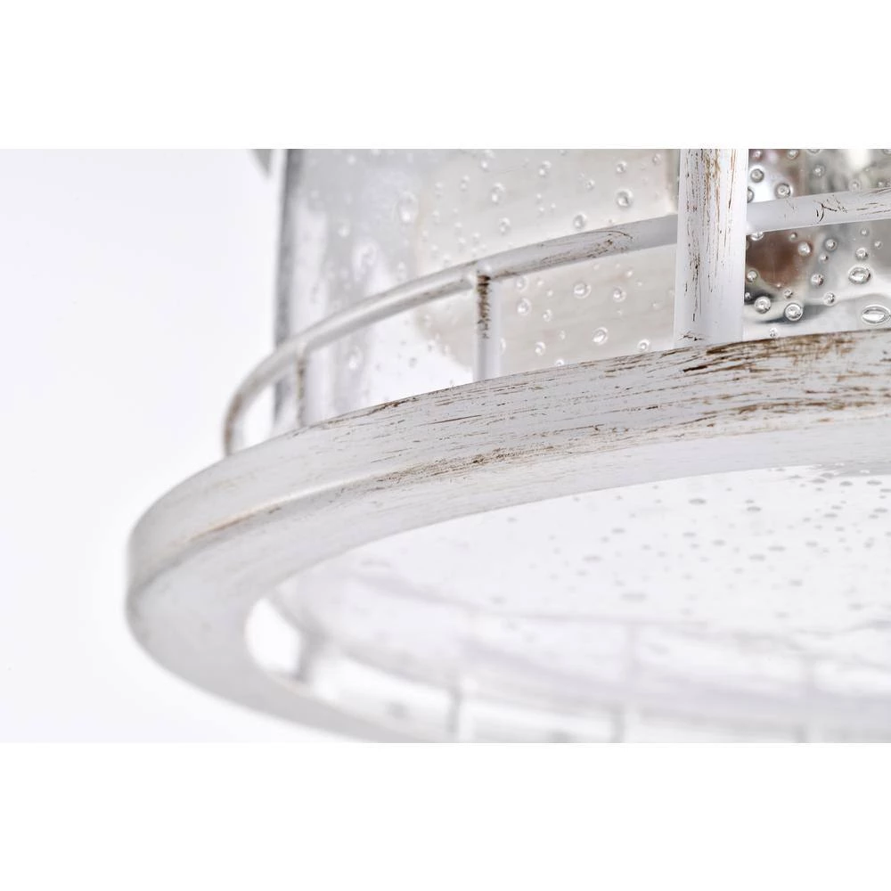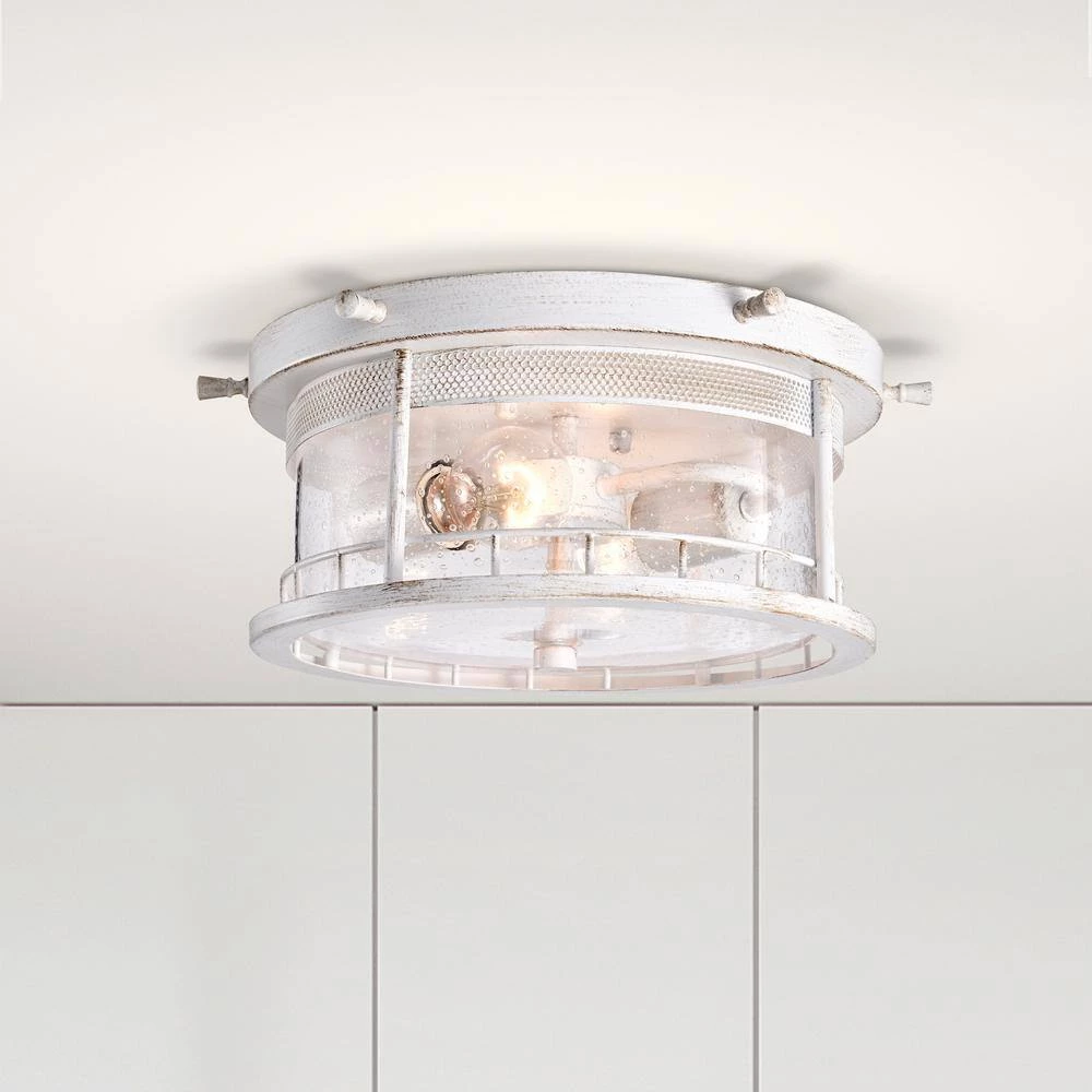 Add a modern farmhouse feel to your entryway, hallway, dining room or living room with this 2 light flush mount. This flush mount ceiling light features a classic drum silhouette with an elegant seeded glass shade and antique white wood hardware. At 14 in. in diameter, this light is perfect for brightening up smaller spaces or lower ceilings. The design of this chandelier alone will illuminate the home with farmhouse decor.