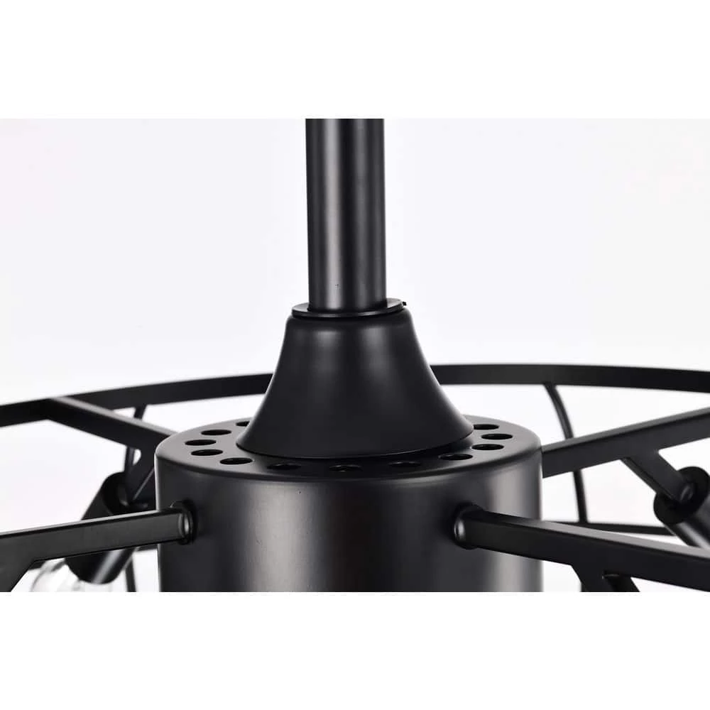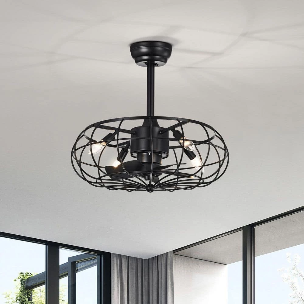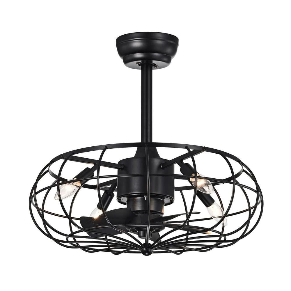 Form and function combine to create this versatile modern ceiling fan. The matte black cage surround the four candelabra bulbs (not included) that bathe the home in light. The reversible motor may be adjusted between 3 different speeds with the remote control for added customization and convenience. This industrial style ceiling fan will greatly enhance the style of the living room or bedroom. Use 1 or both of the 5 in. or 10 in. down rod included to create a customized hanging height.