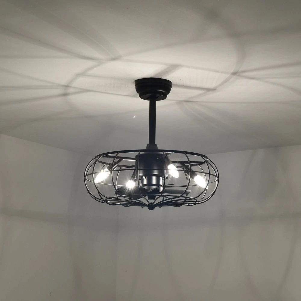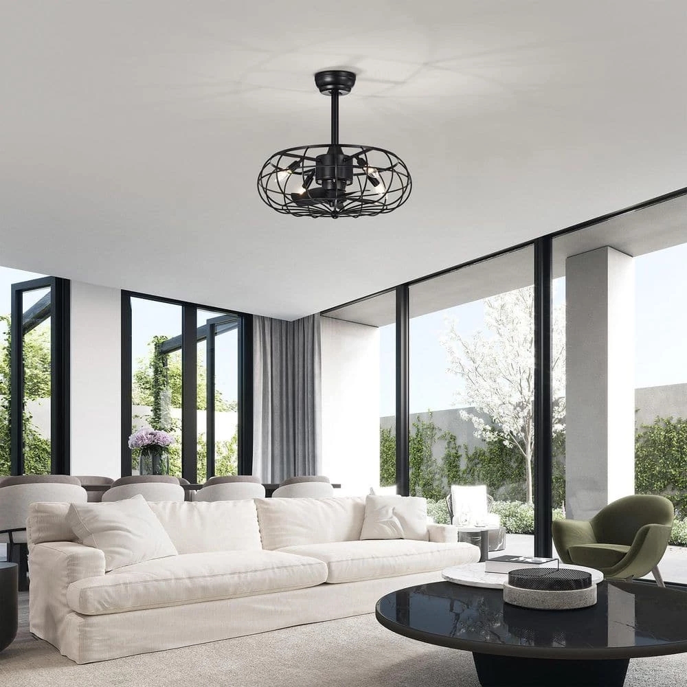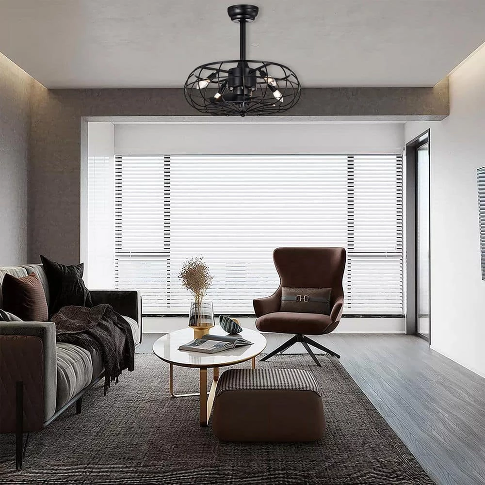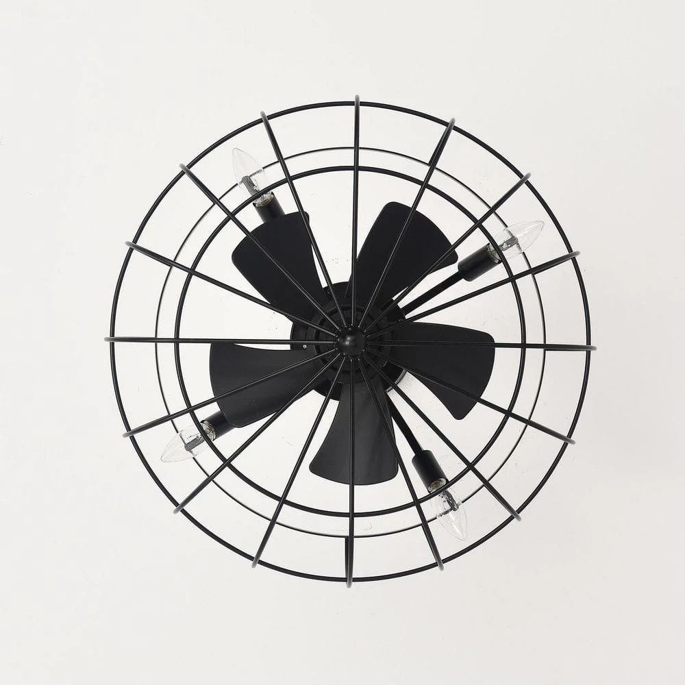 Form and function combine to create this versatile modern ceiling fan. The matte black cage surround the four candelabra bulbs (not included) that bathe the home in light. The reversible motor may be adjusted between 3 different speeds with the remote control for added customization and convenience. This industrial style ceiling fan will greatly enhance the style of the living room or bedroom. Use 1 or both of the 5 in. or 10 in. down rod included to create a customized hanging height.