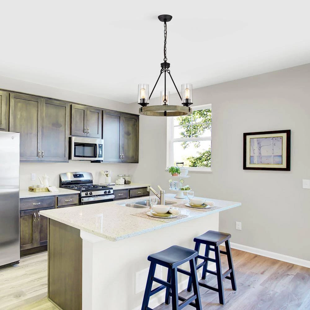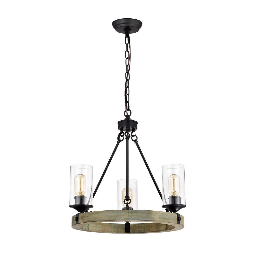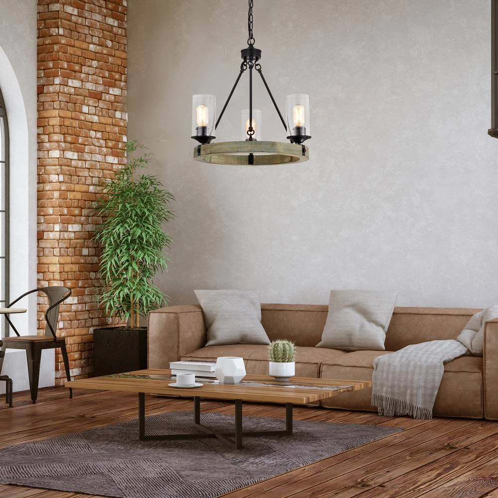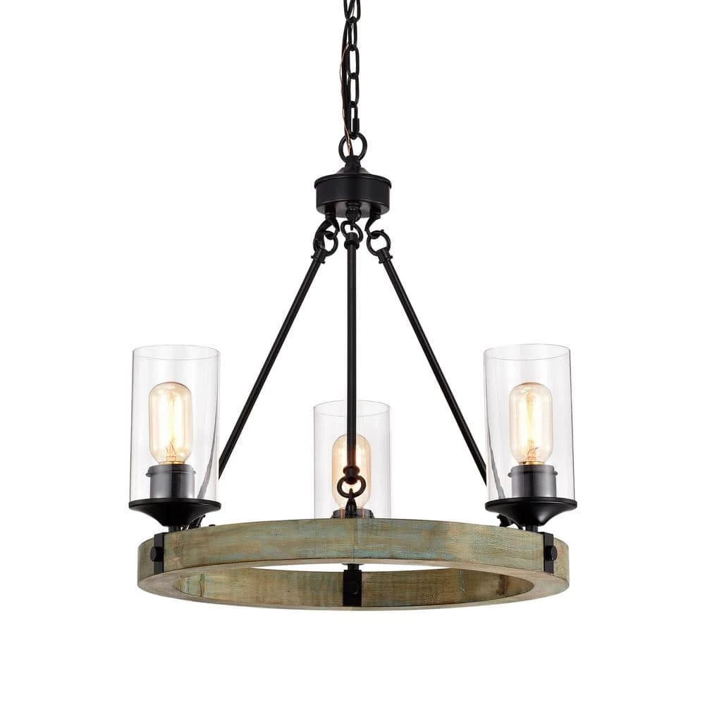 This rustic farmhouse chandelier brings together weathered wood and black detailing to create a stunning design. With its classic wagon wheel structure and clear glass cylinder shades, this chandelier fits into many of today’s trends. 3 medium size bulbs are covered by clear glass shades. The 48 in. chain is adjustable and we always recommend adding a dimmer switch for even more customization.