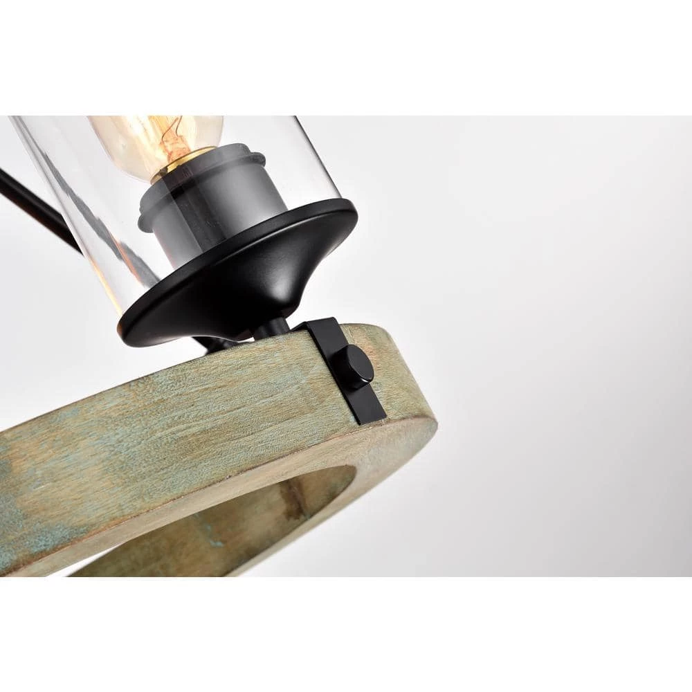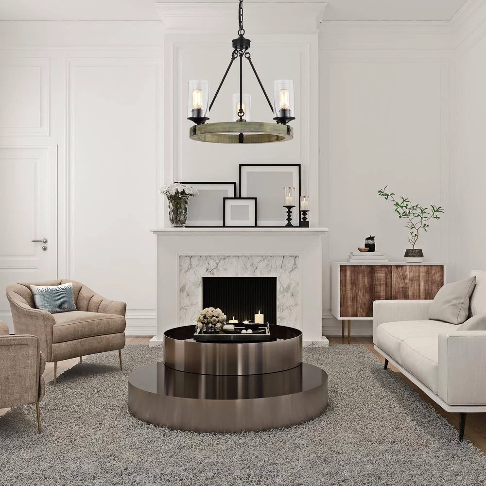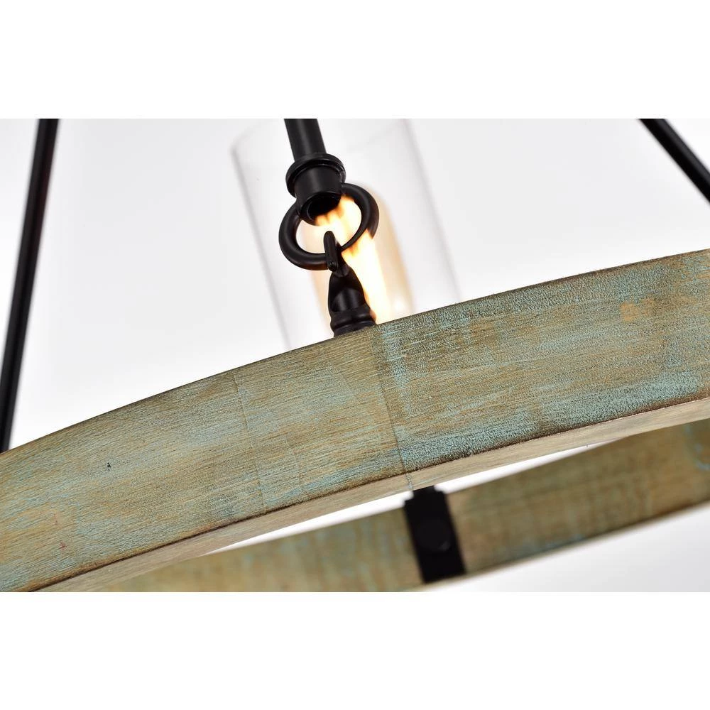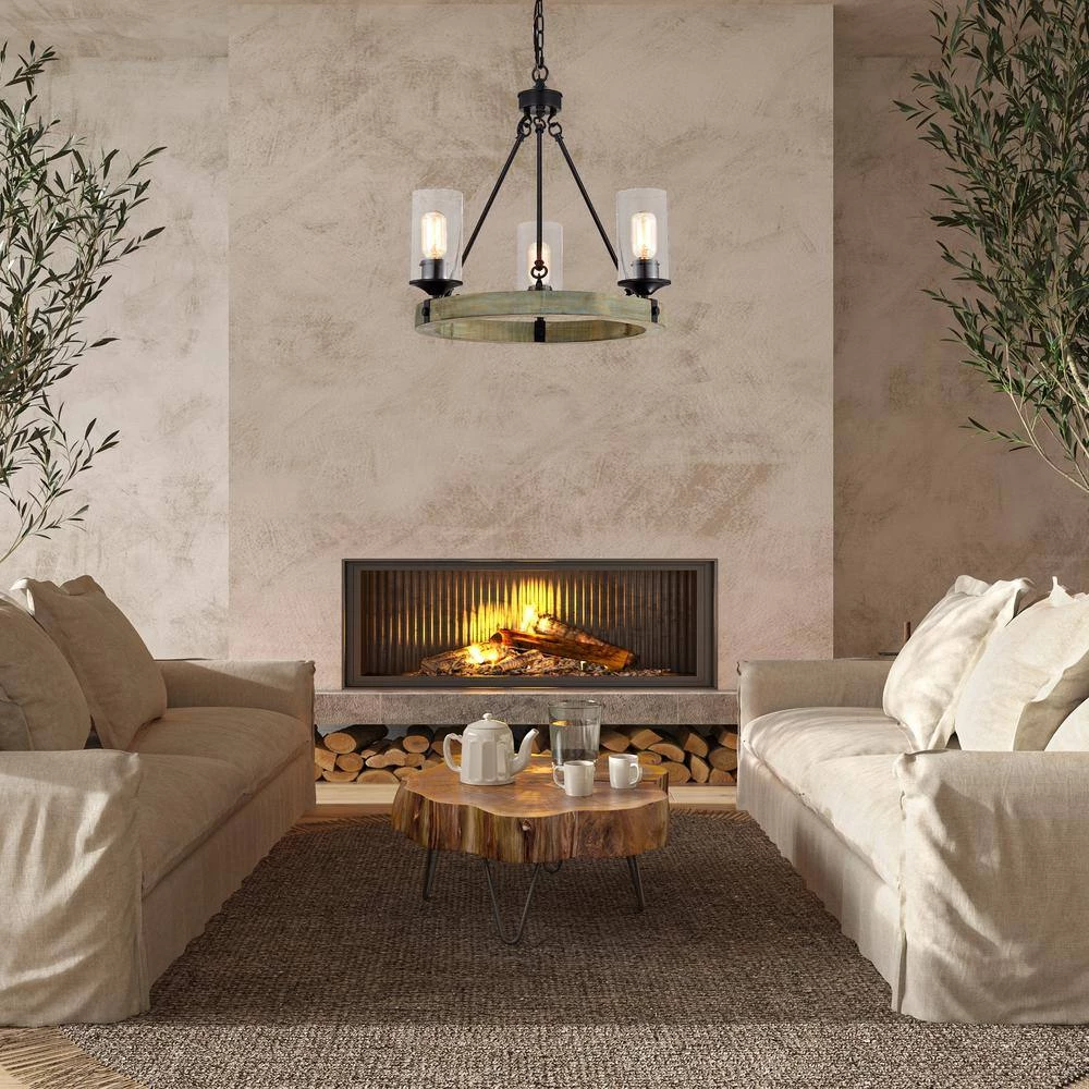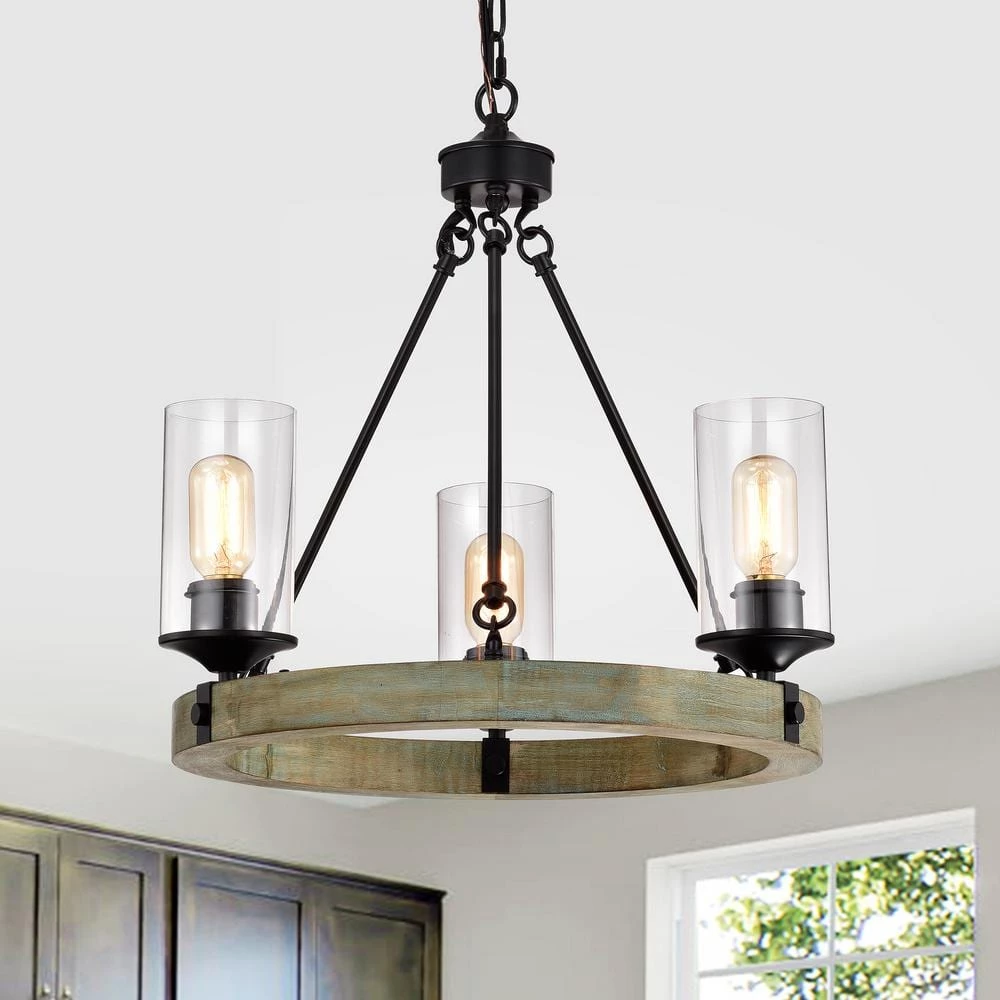This rustic farmhouse chandelier brings together weathered wood and black detailing to create a stunning design. With its classic wagon wheel structure and clear glass cylinder shades, this chandelier fits into many of today’s trends. 3 medium size bulbs are covered by clear glass shades. The 48 in. chain is adjustable and we always recommend adding a dimmer switch for even more customization.