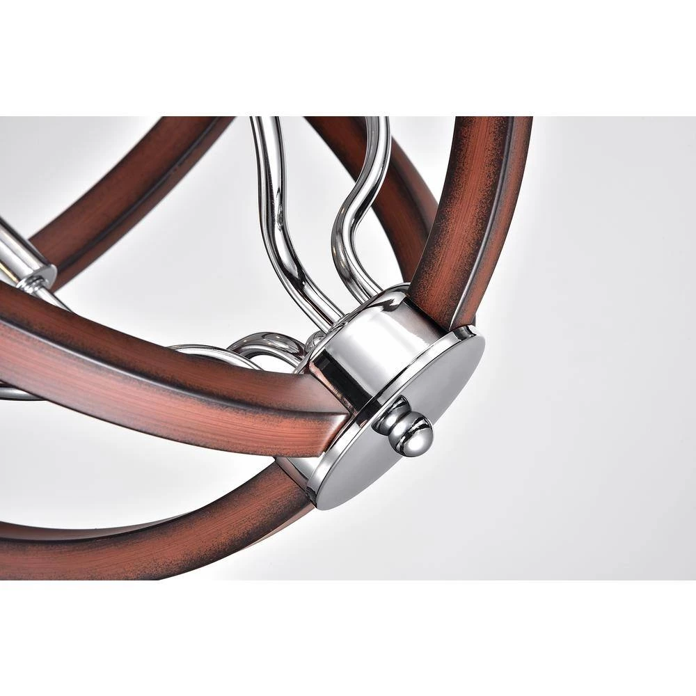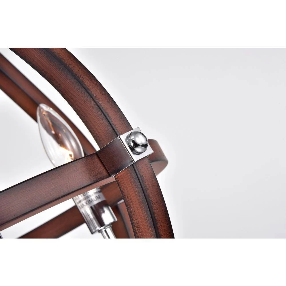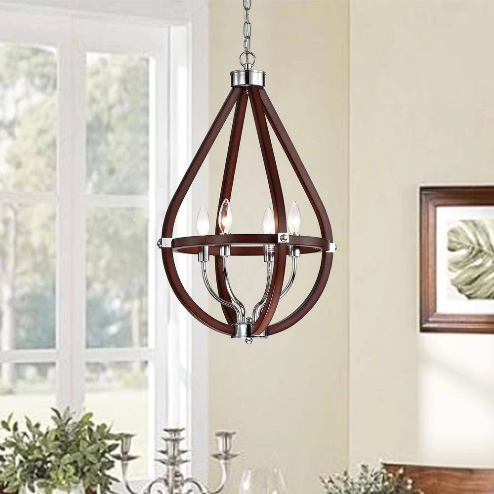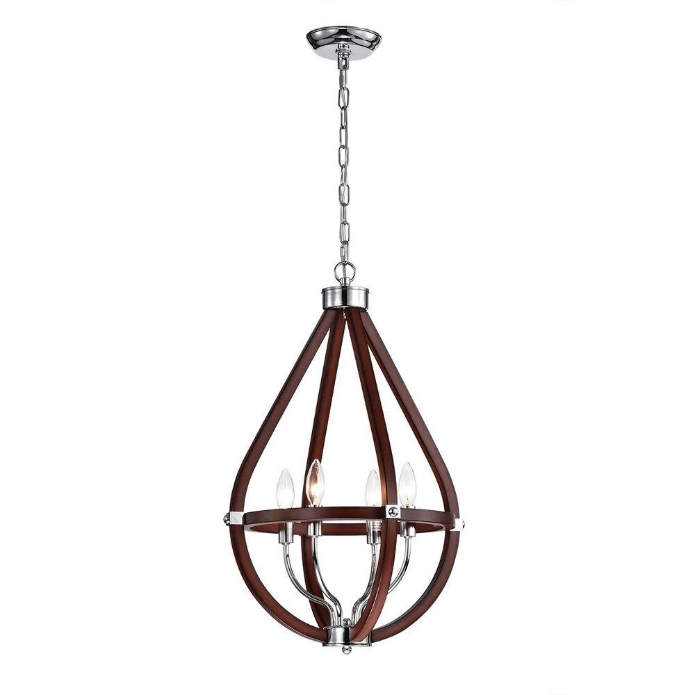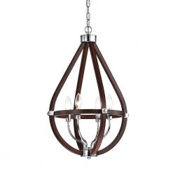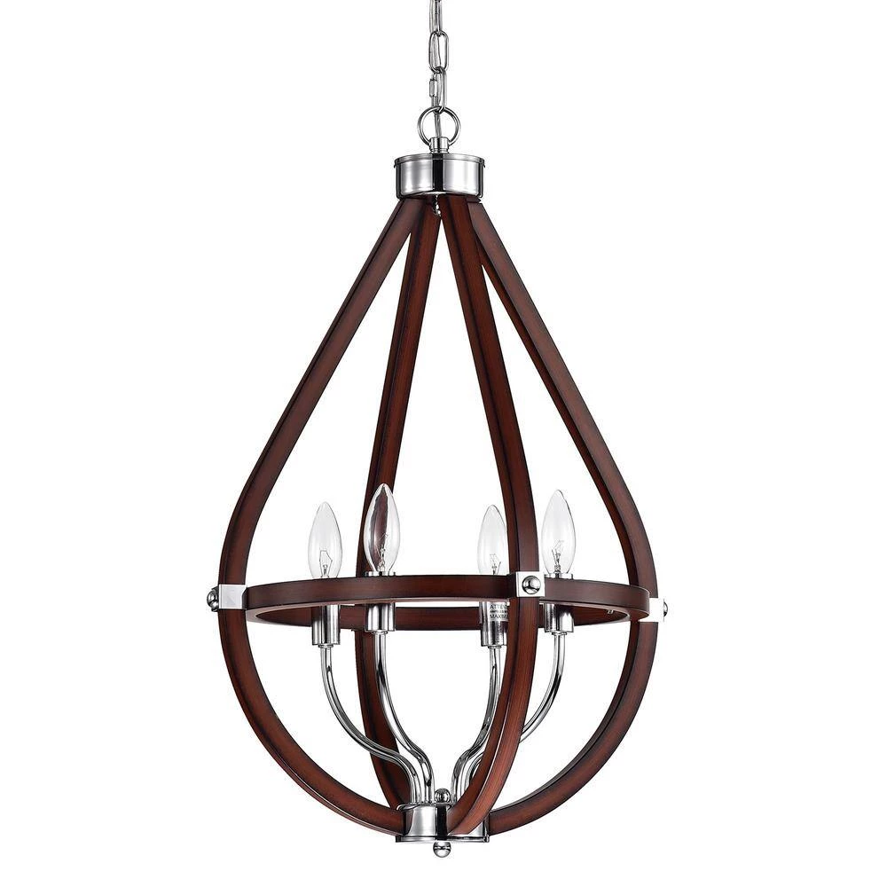 This beautiful teardrop shaped chandelier is finished in a redwood texture that gives it style and interest. The chrome accents, contrast against the 4-bulbs and the wood finish to create an industrial design. This light fixture is perfect in a dining room, living room or entry way.