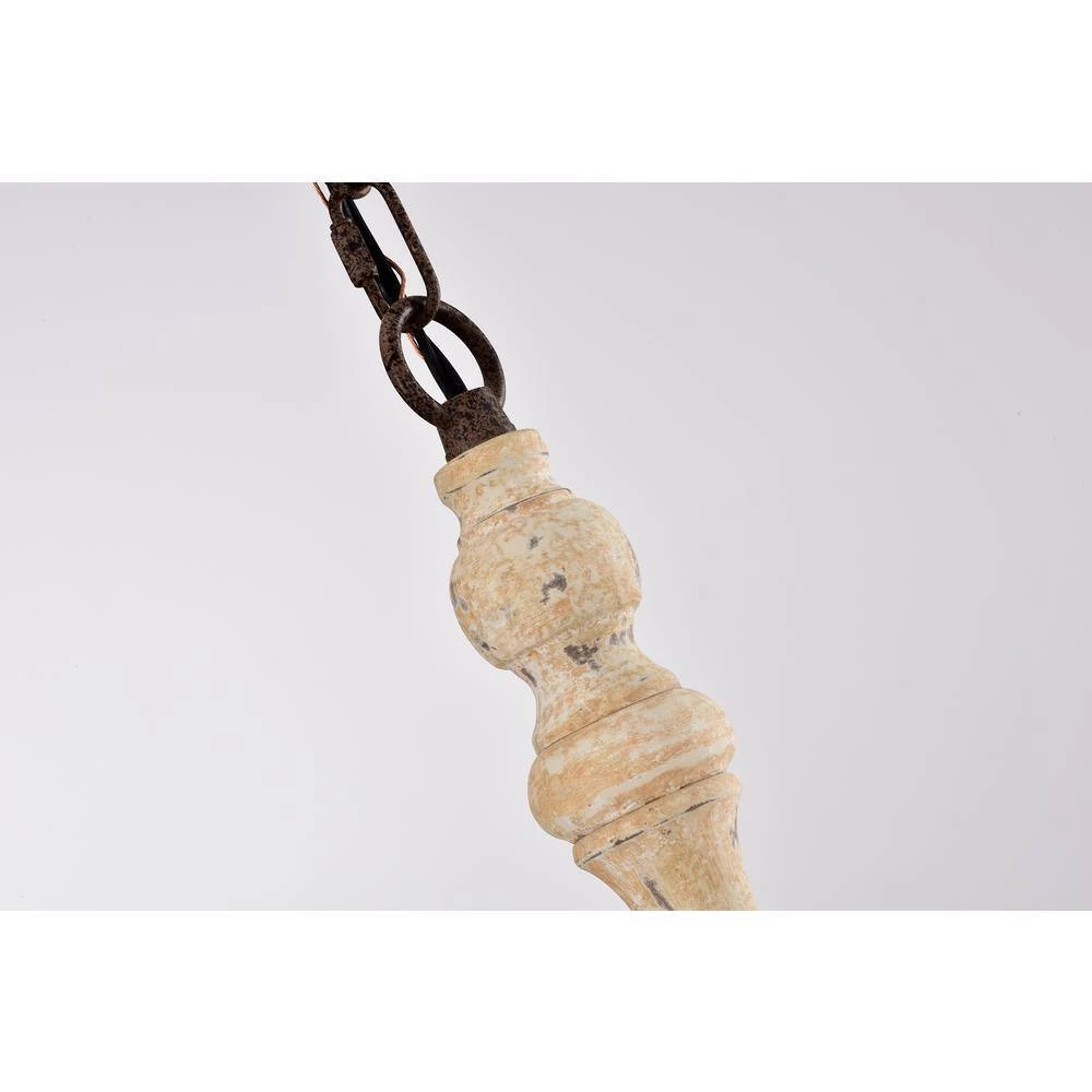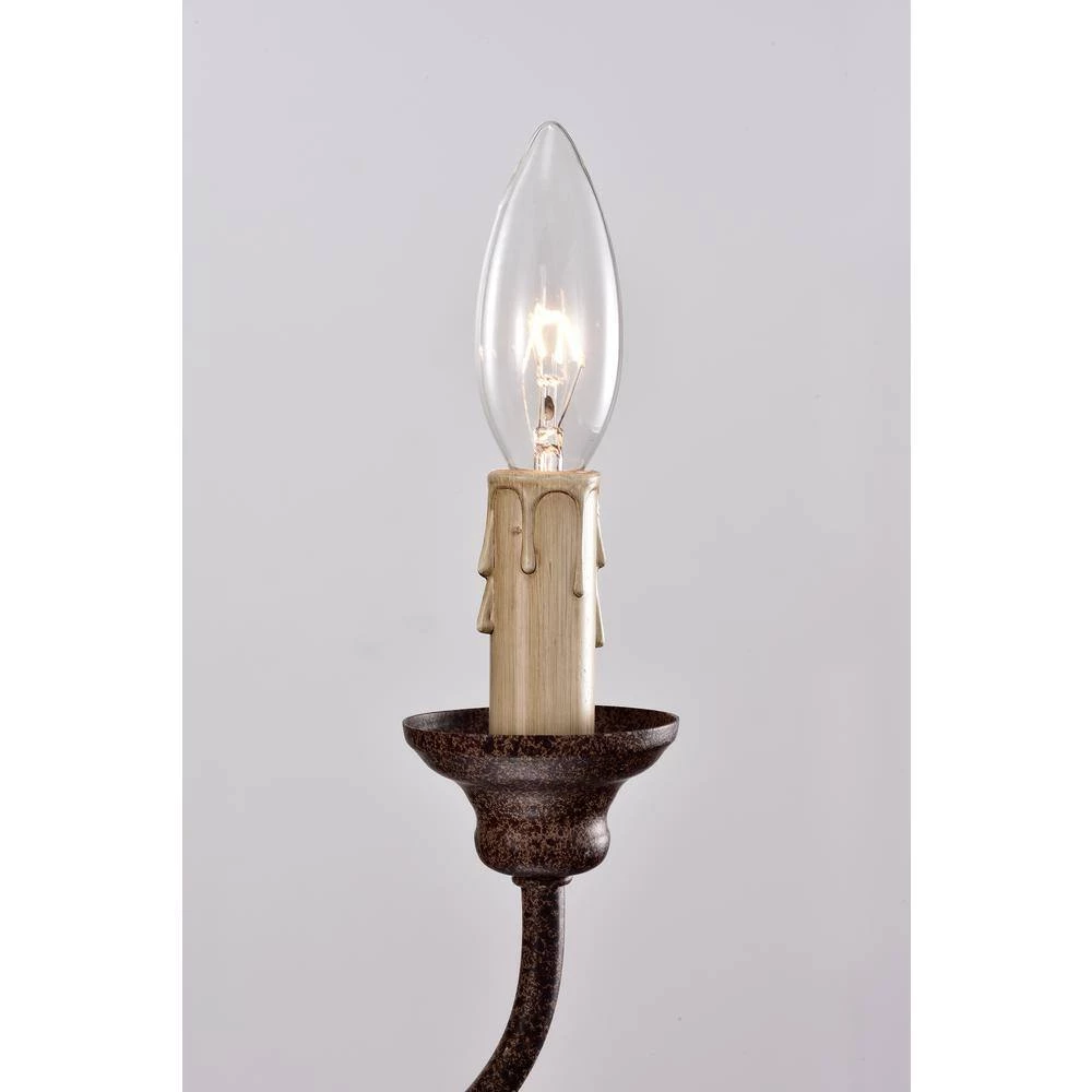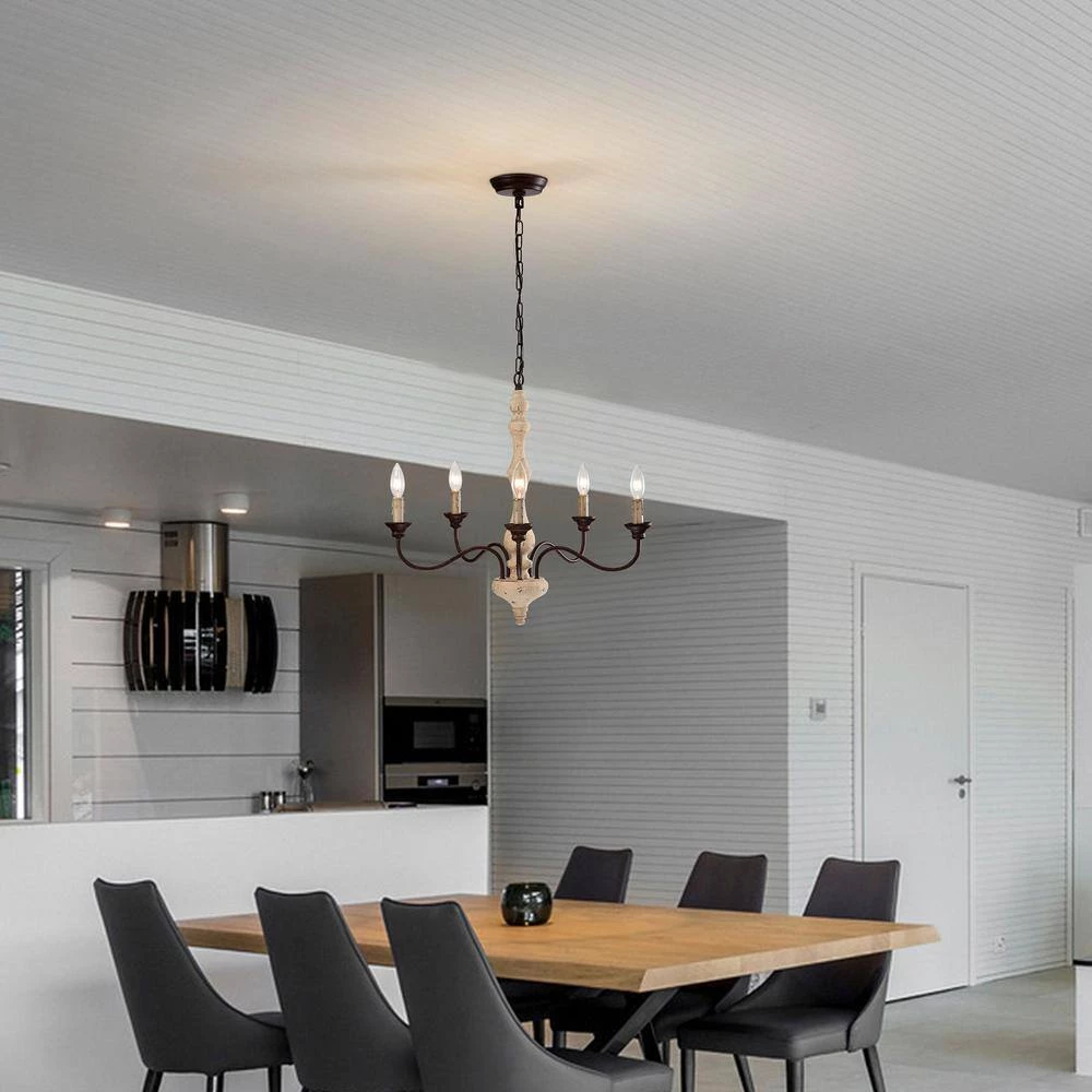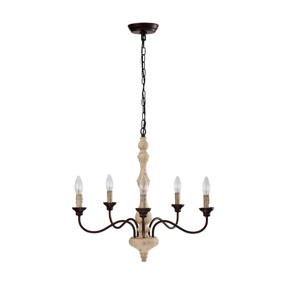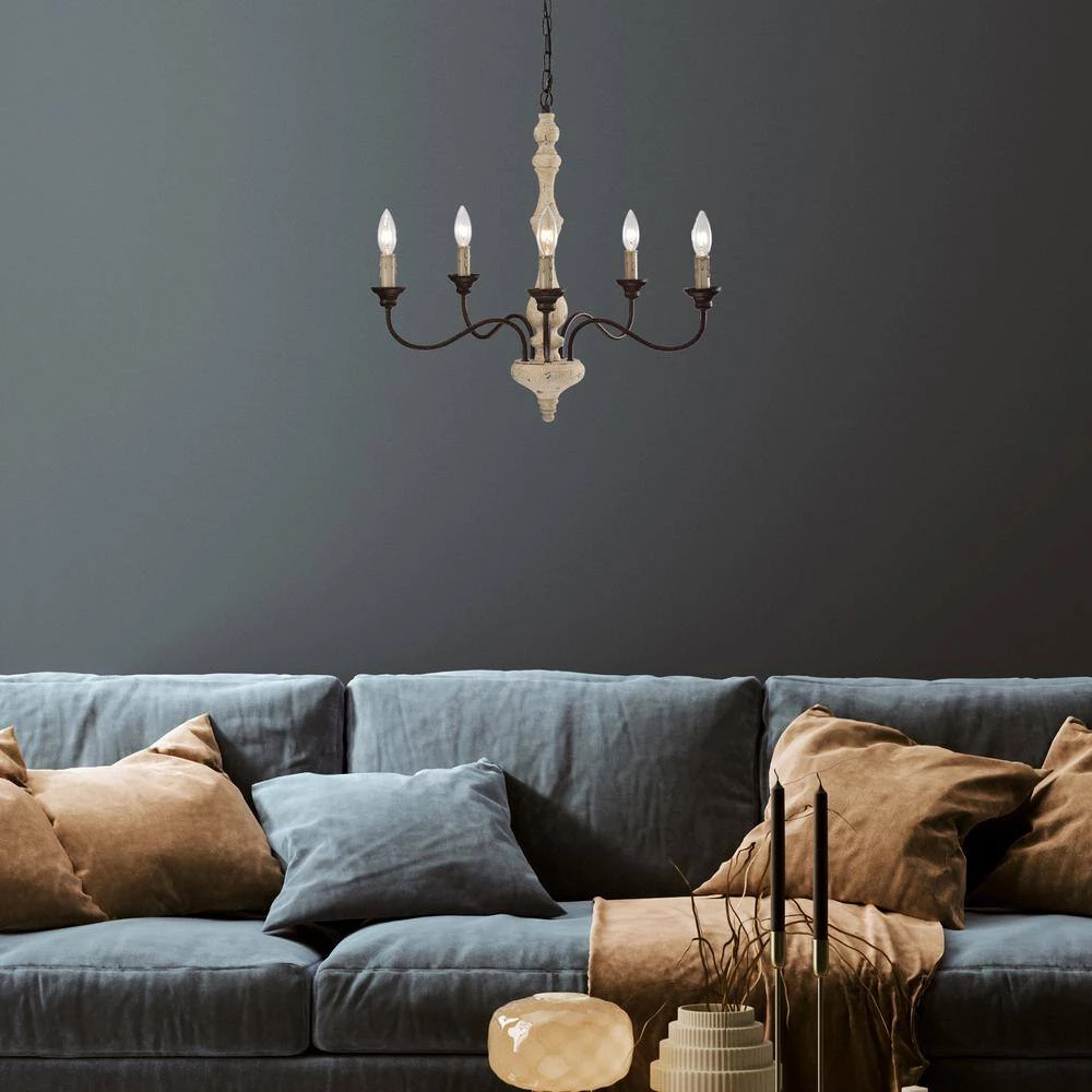 Traditional elements and weathered finishes combine to create this rustic 5-light chandelier. This light features 5 exposed candelabra bulbs held by artfully designed candle sleeves to mimic dripping wax. The antique white scratched wood finish is balanced by the rust finished arms and bobeche. Hanging from a 48 in chain, this chandelier is perfectabove your foyer, hallway, dining room or living room.