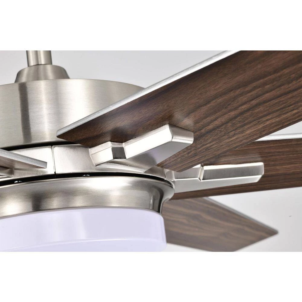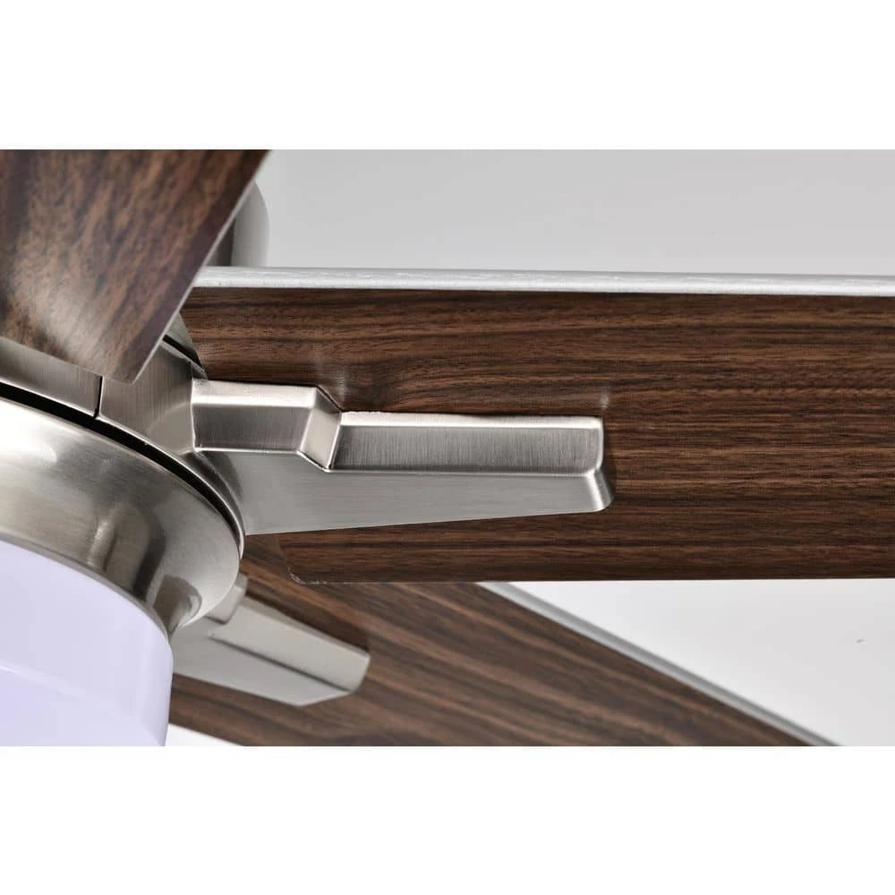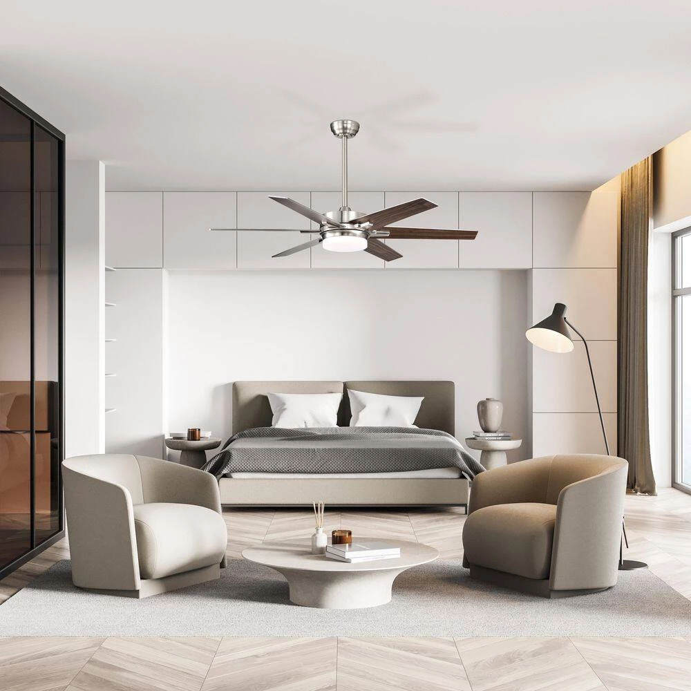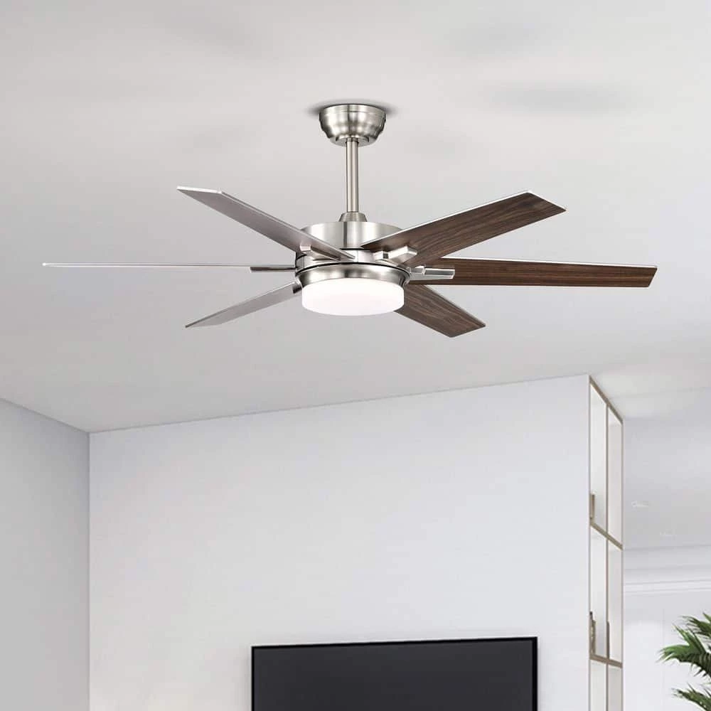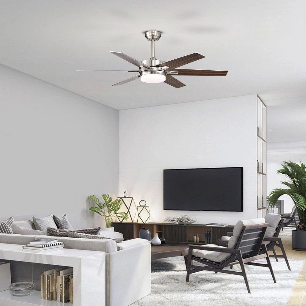 Deliver performance in style with the simple silhouette of this brushed nickel ceiling fan. The 6 reversible silver and dark walnut blades brings a modern edge to the space while providing plenty of airflow as it can be adjusted to six different speeds. The LED light kit is surrounded by an acrylic white diffuser which allows bright and ample illumination. Use one or all of the included 6 in. and 12 in. rods for the desired hanging height. The overall design of the ceiling fan makes it a versatile piece that will fit in any living room or bedroom.