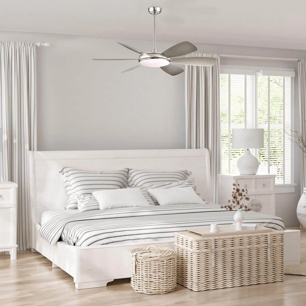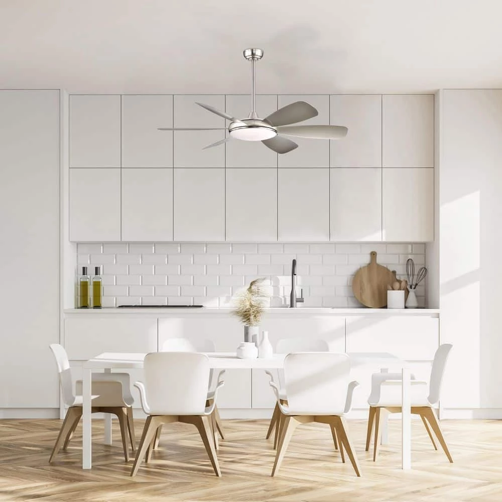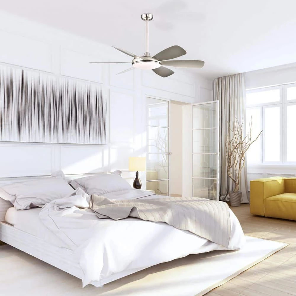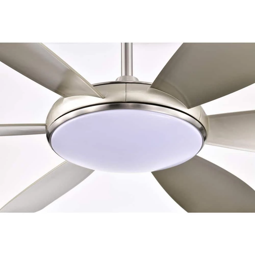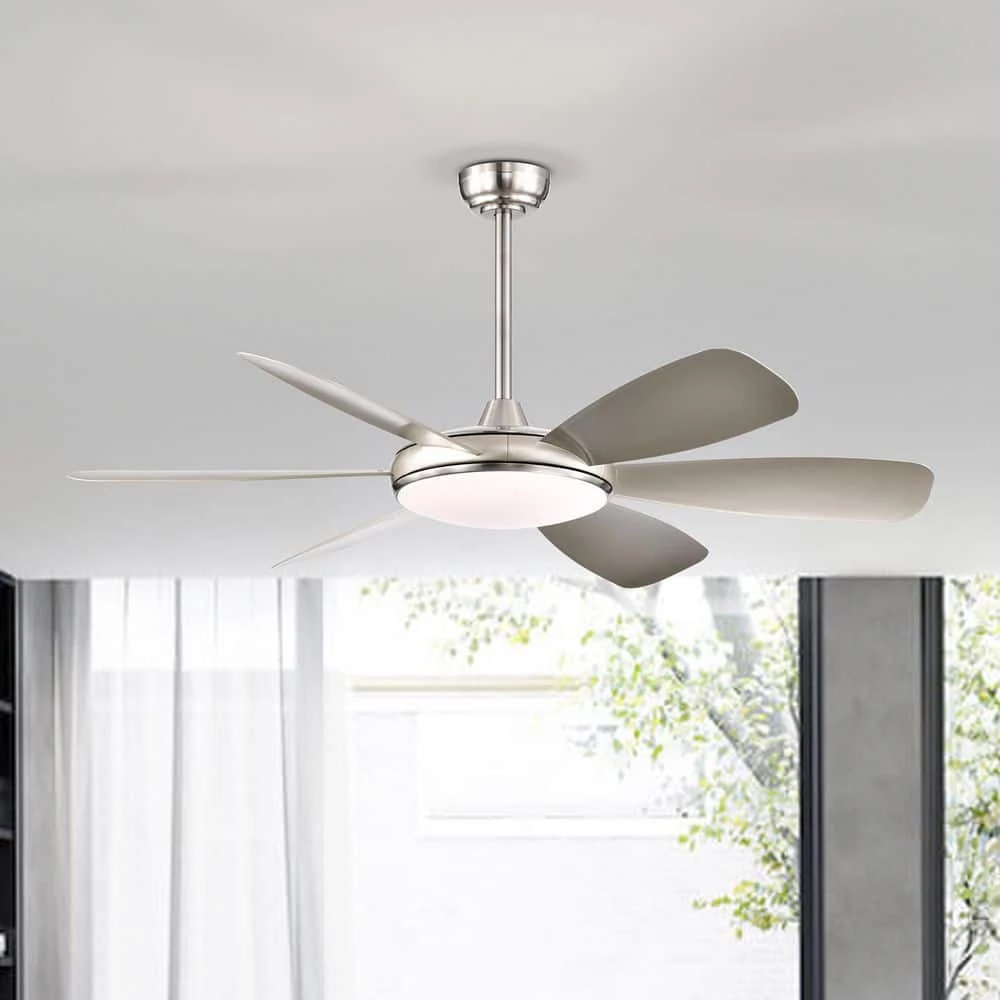 Upgrade your home with a sophisticated ceiling fan that lives up to its purpose. Its flexible design boosts any contemporary modern home with function and style. The 6 brushed nickel blades provide plenty of airflow as it can be adjusted to 6 different speeds. The LED light kit is surrounded by an acrylic white diffuser which allows bright and ample illumination while delivering energy efficiency. Use one or all of the included 6 in. and 12 in. rods for the desired hanging height.