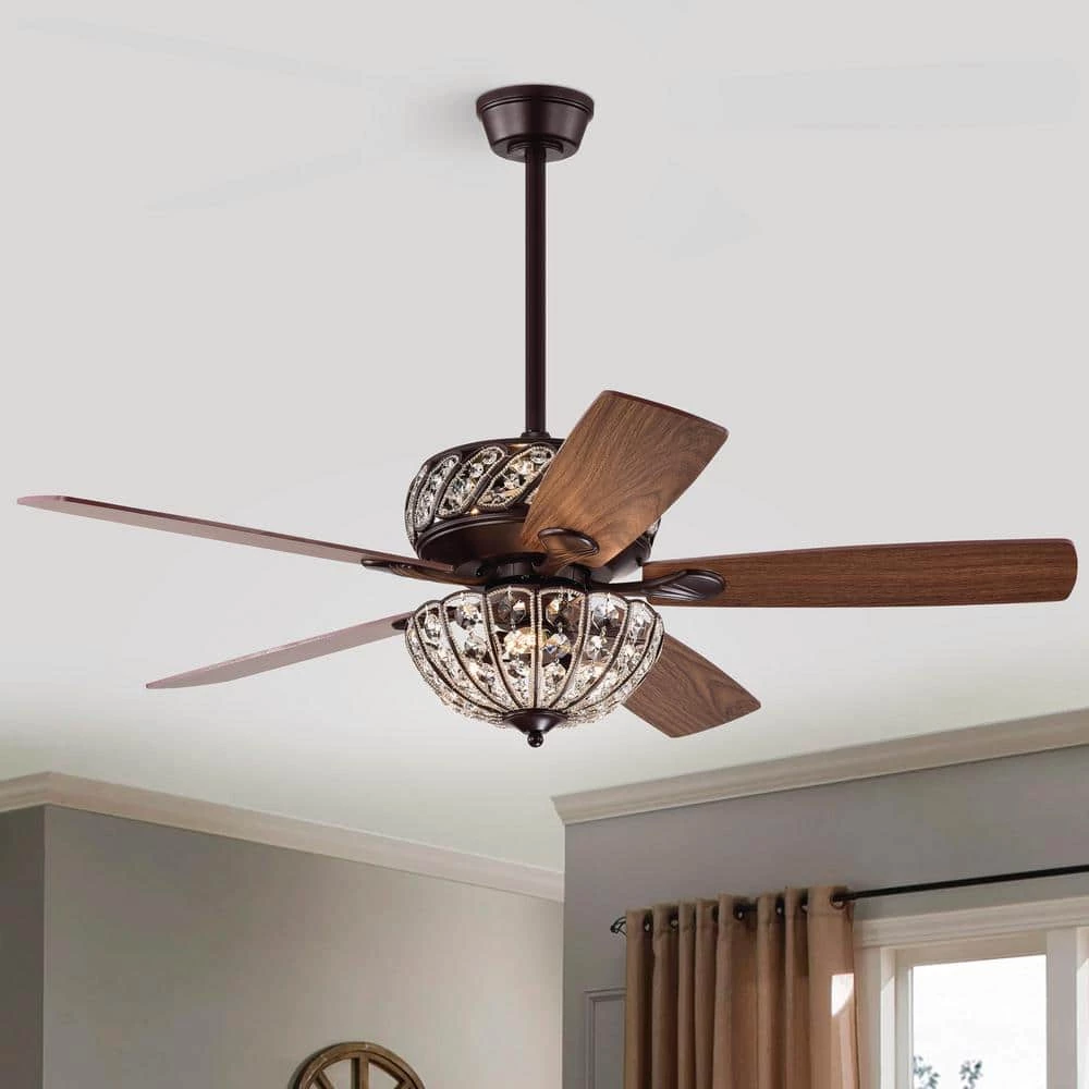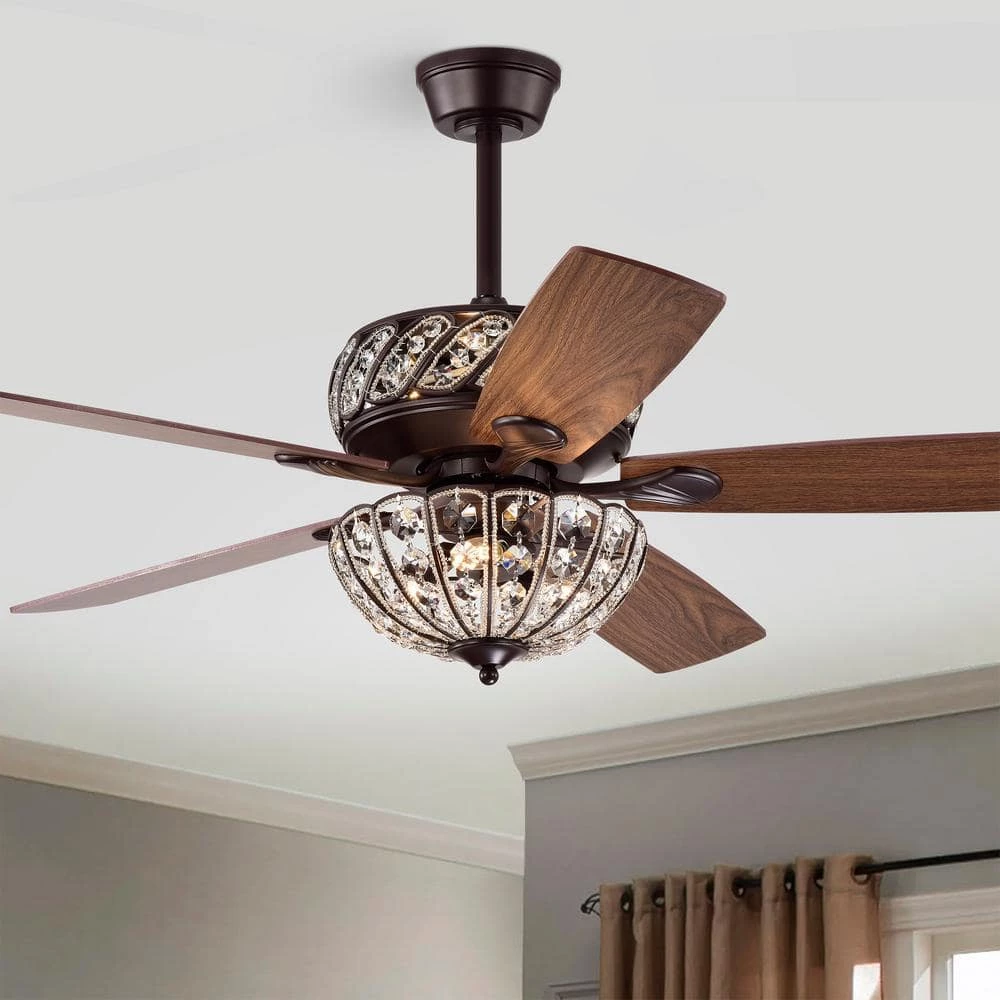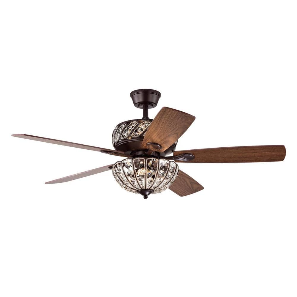 This oil rubbed bronze ceiling fan combines style and function to illuminate your home while providing comfortable air circulation. The crystal light kit is sure to catch attention with its fully encrusted crystal shade and elegant oil rubbed bronze finish in the living room or bedroom. The 5 black walnut and brown reversible blades of this traditional ceiling fan complement the light kit and move at 3 different speeds to suit any time of year.