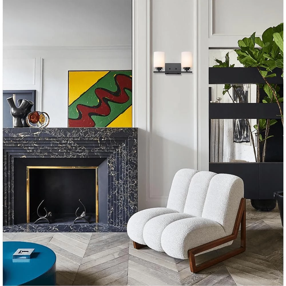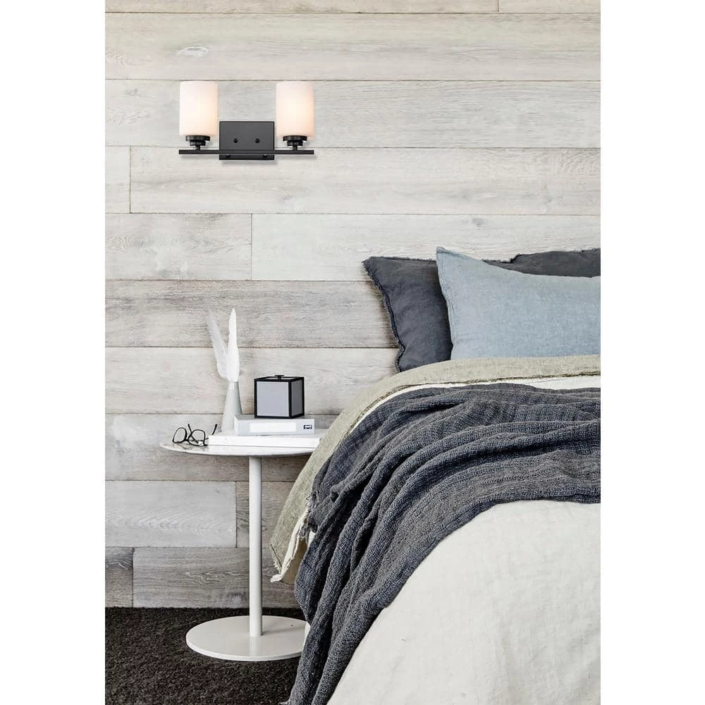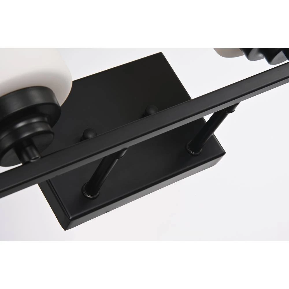 Featuring clean lines and a sleek silhouette, this 2-light vanity fits perfectly into today’s design trends. The matte black finish matches a variety of interiors while the white etched glass shades diffuse light, emitting a soft glow from this transitional vanity light. This modern vanity light from Edvivi is suitable for use in damp locations.