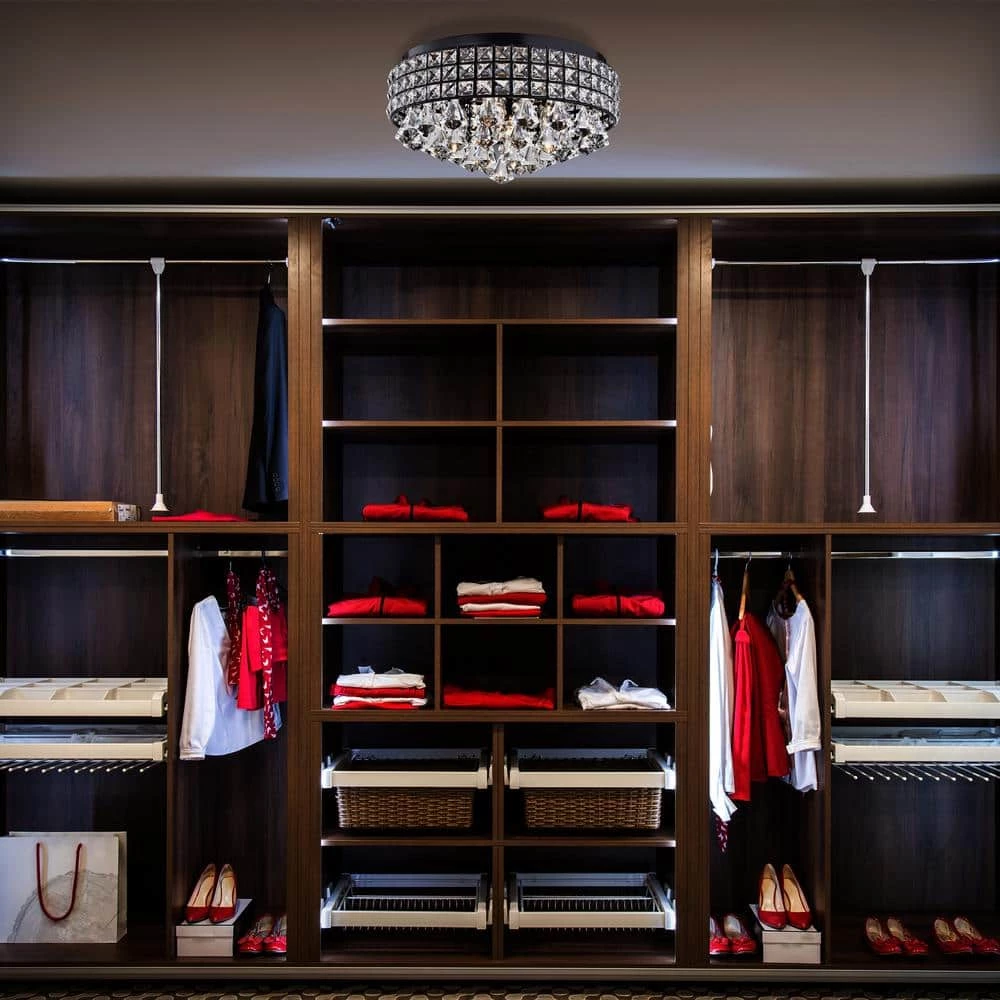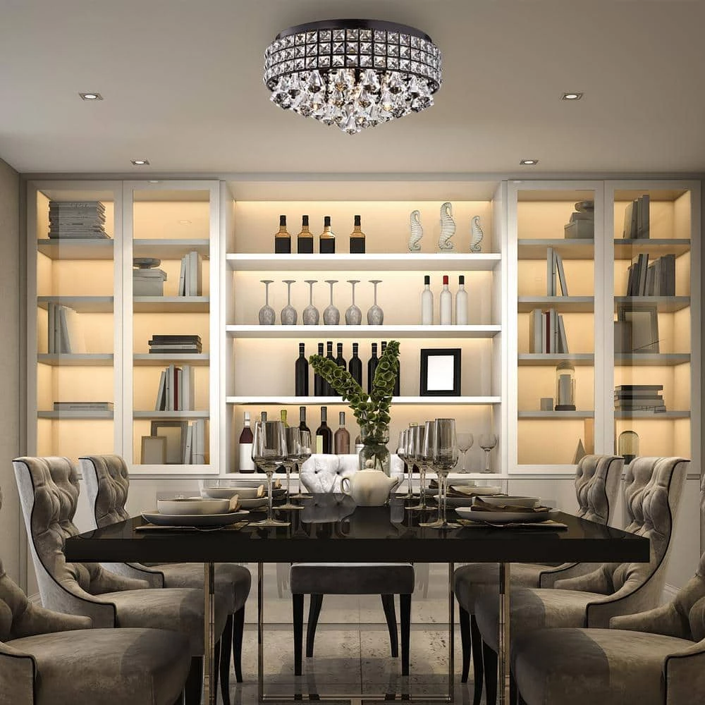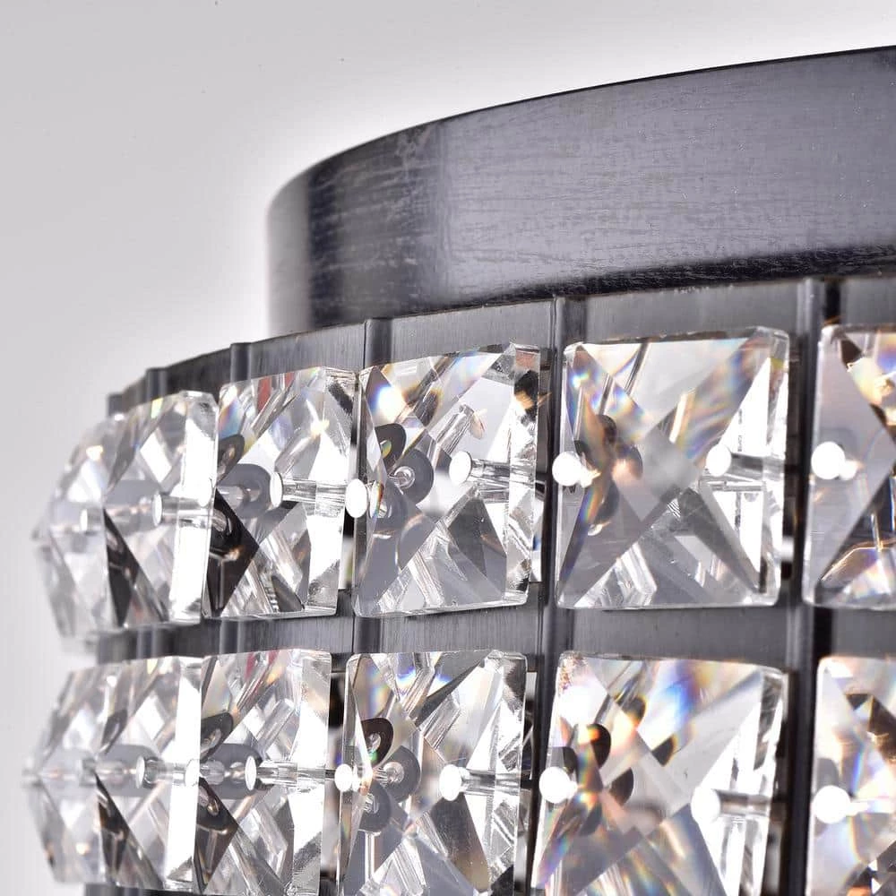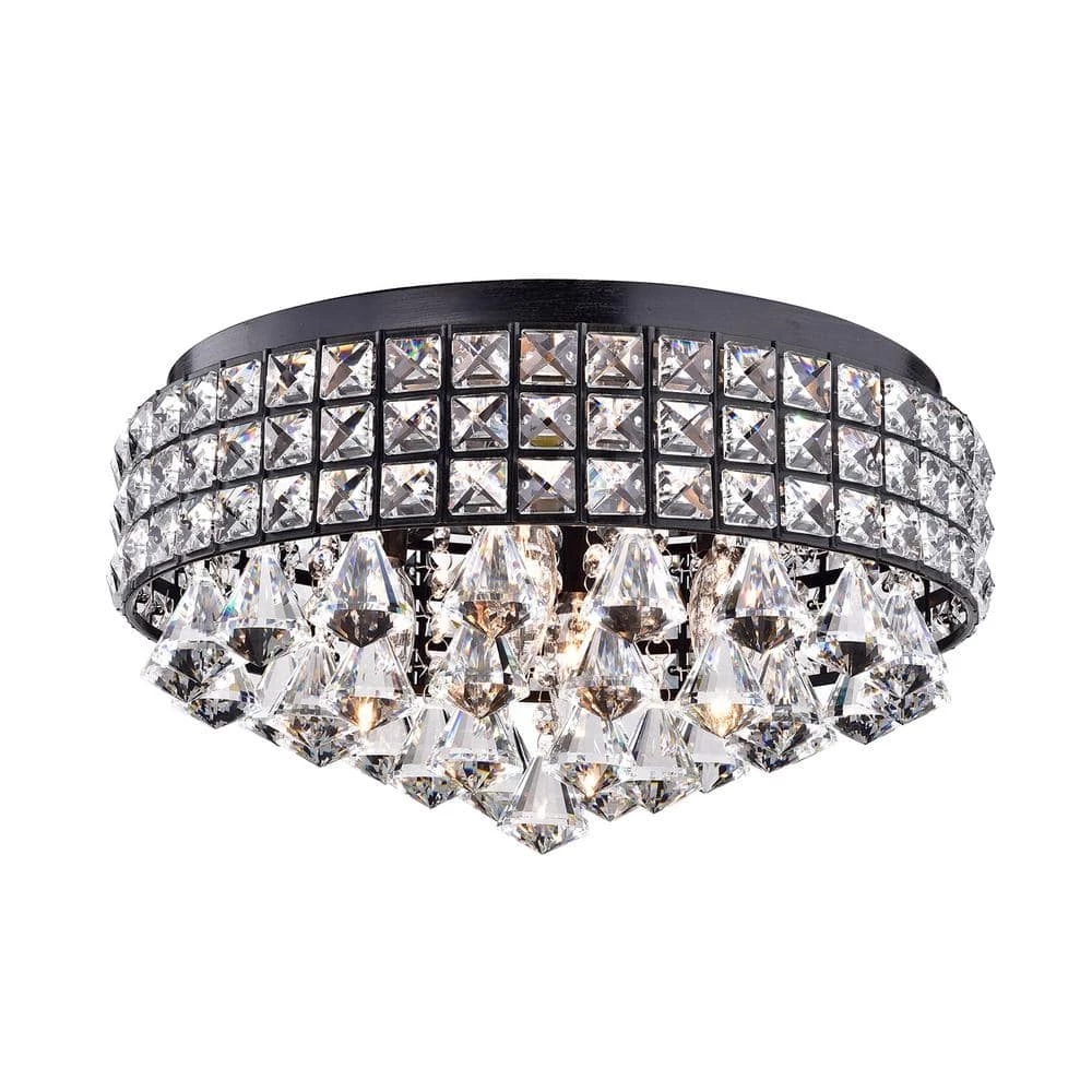 This unique flush mount is the epitome of elegance with cascading crystals that encase 4 bulbs. This opulent light with a brushed antique black finish bathes the room in a beautiful glow. At 8.2 in. H and 15.2 in. in diameter, it is perfect for low ceilings or an entryway.