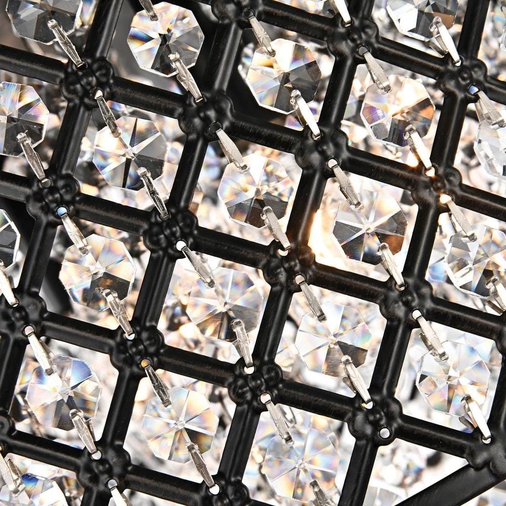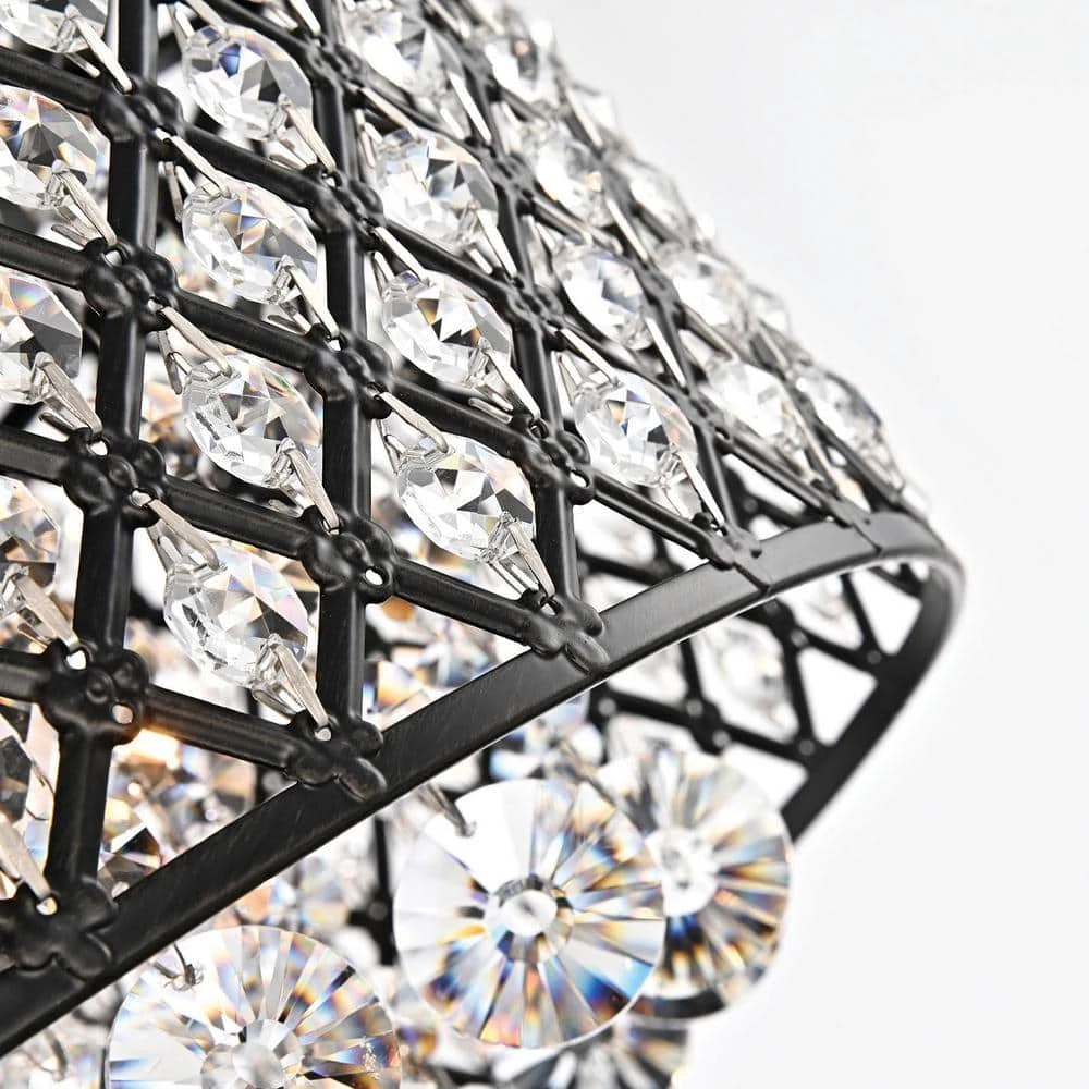 This beautiful cascading crystal drum chandelier is the picture of contemporary perfection. This modern chandelier features antique black finish hardware, crystal latticed drum shade and cascading crystals. The strands of dripping crystals, shimmer and gleam in the light. This black flush mount creates a mood of drama and romanticism that is perfect for any room.