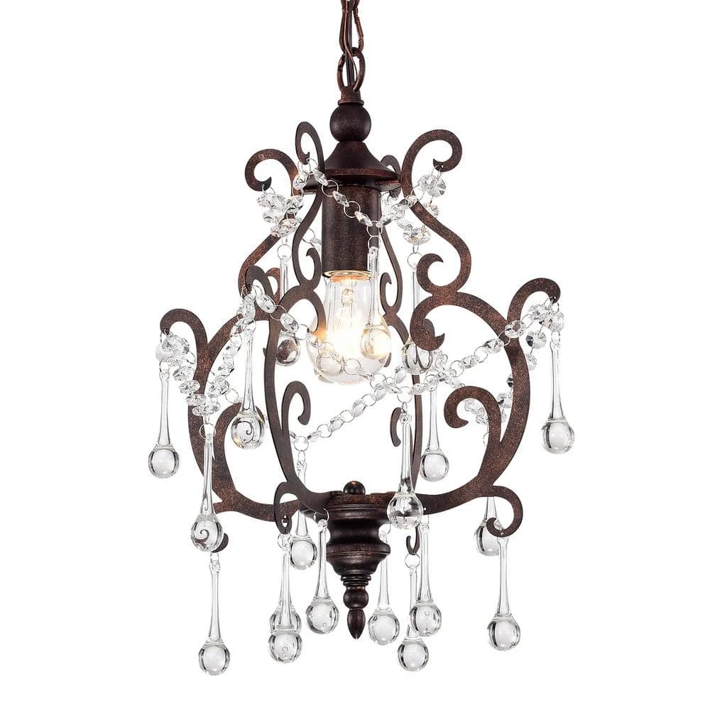 Elegant and traditional, this crystal chandelier adds interest to any space. The antique copper finished wrought iron drips with beautiful long raindrop crystals while strands of crystals wrap around this modern pendant light, creating a shimmering sensation. This intricate antique copper pendant light will beautifully adorn the closet, bedroom, or office.