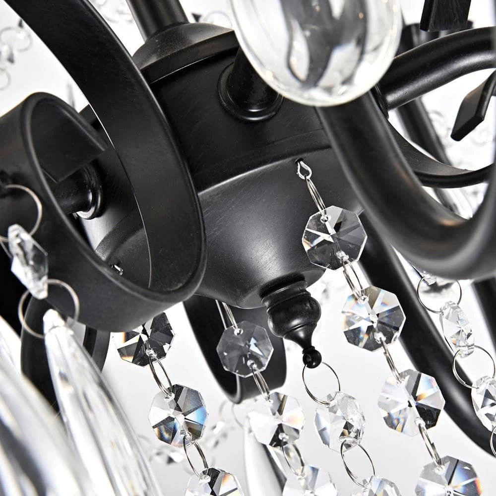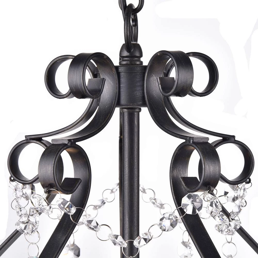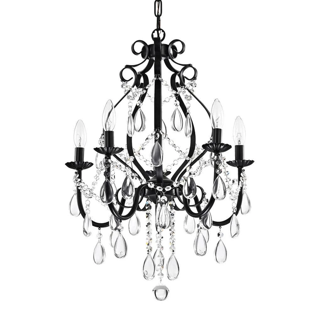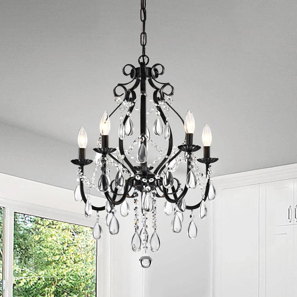 This beautiful candle style chandelier is the perfect solution for your dining room or living room. This traditional chandelier has elegant antique black finish hardware with dazzling crystals that makes it perfect for any design plan. This glam crystal chandelier features a cascading crystal garland intertwining the 5 candelabra style bulbs and a 39 in. adjustable chain.