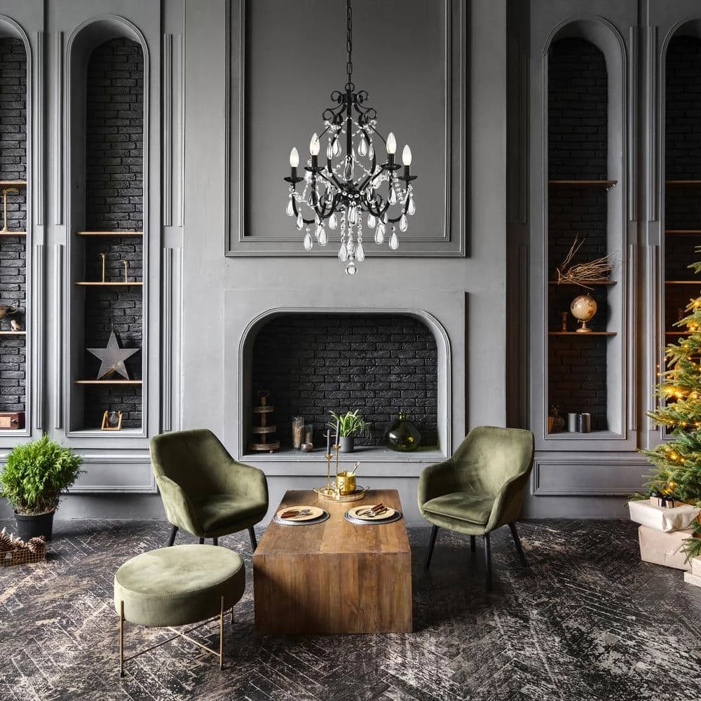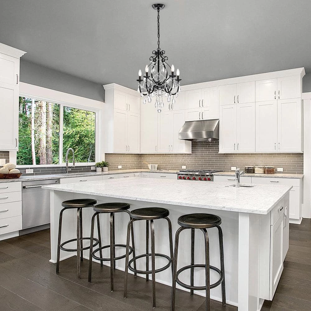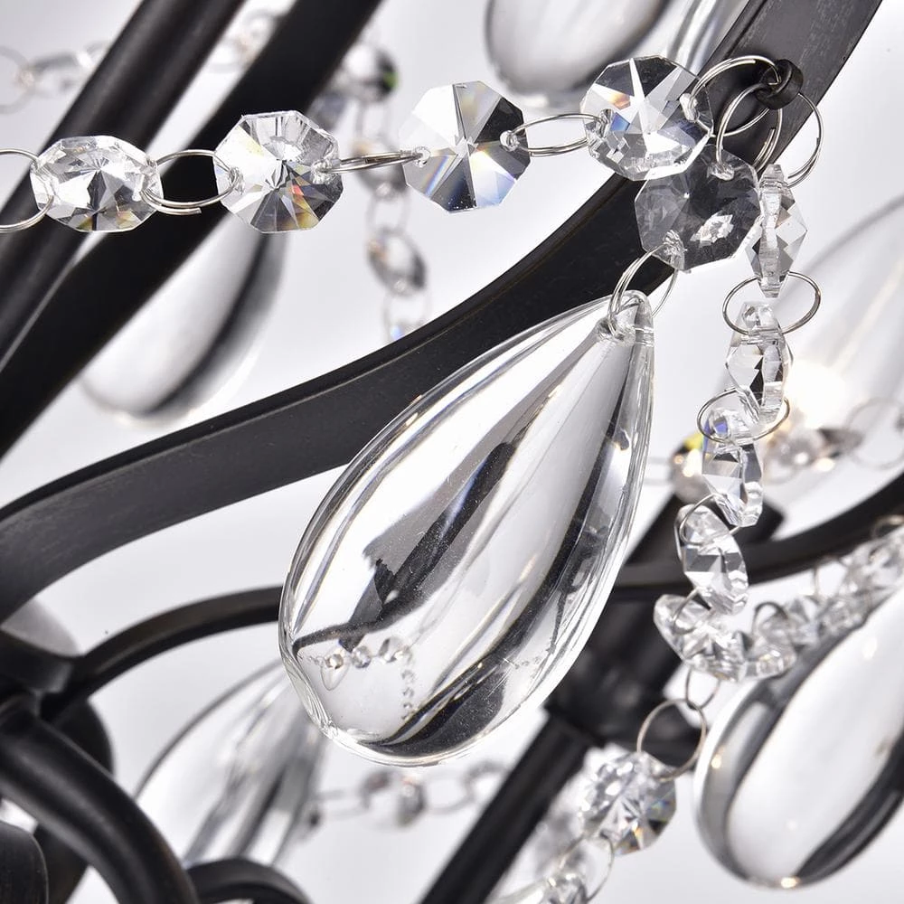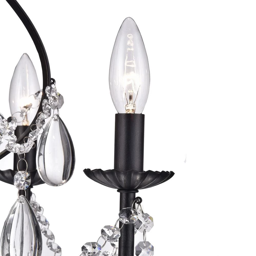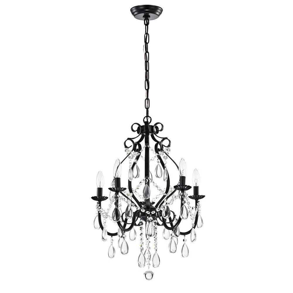 This beautiful candle style chandelier is the perfect solution for your dining room or living room. This traditional chandelier has elegant antique black finish hardware with dazzling crystals that makes it perfect for any design plan. This glam crystal chandelier features a cascading crystal garland intertwining the 5 candelabra style bulbs and a 39 in. adjustable chain.