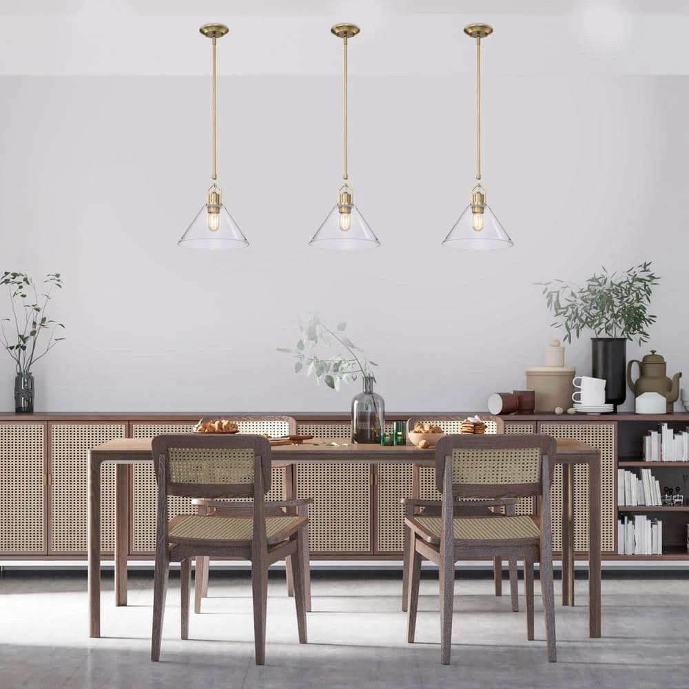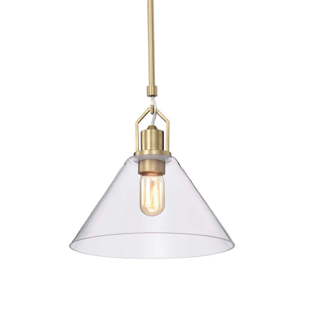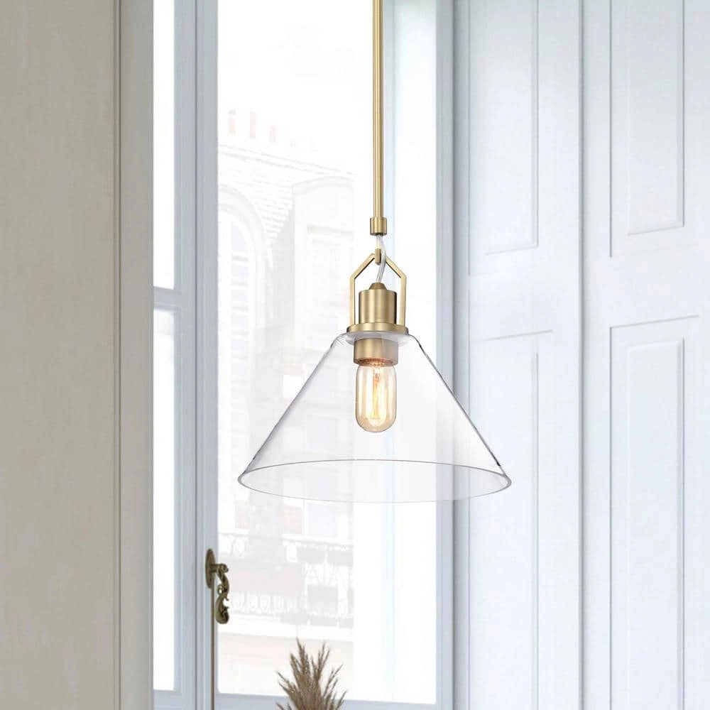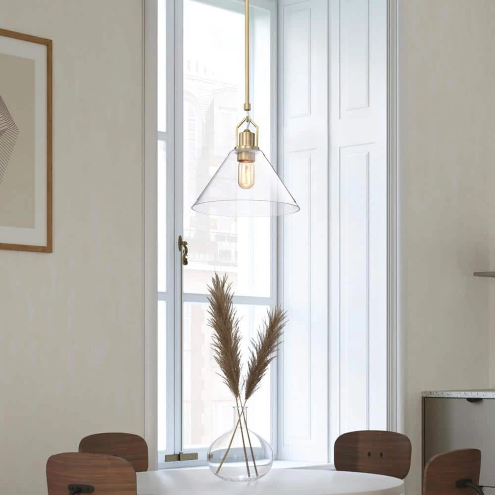 Evoking modern sensibility, this pendant light brightens the room anywhere you place it. Featuring a shiny vintage brass finish hardware and a clear glass cone shade, this modern pendant light has a timeless look. Place this brass pendant light on its own or in multiples over the kitchen island, breakfast nook or dining room. 4 rods are included to allow a customized hanging length for different ceiling heights.