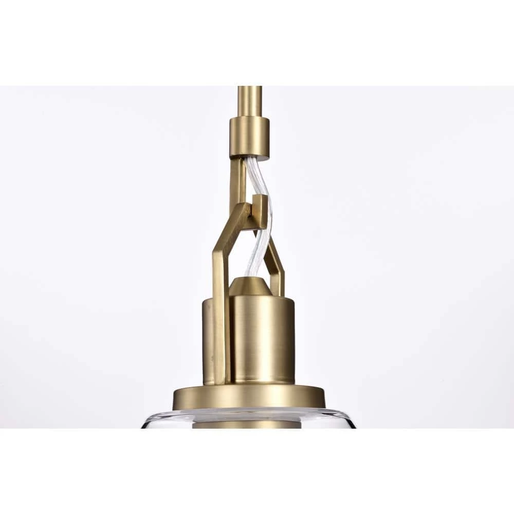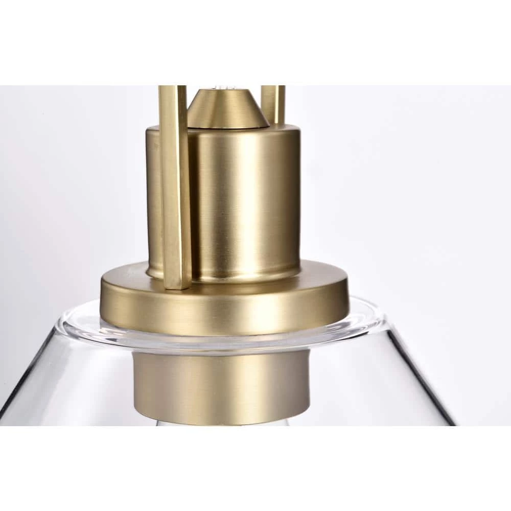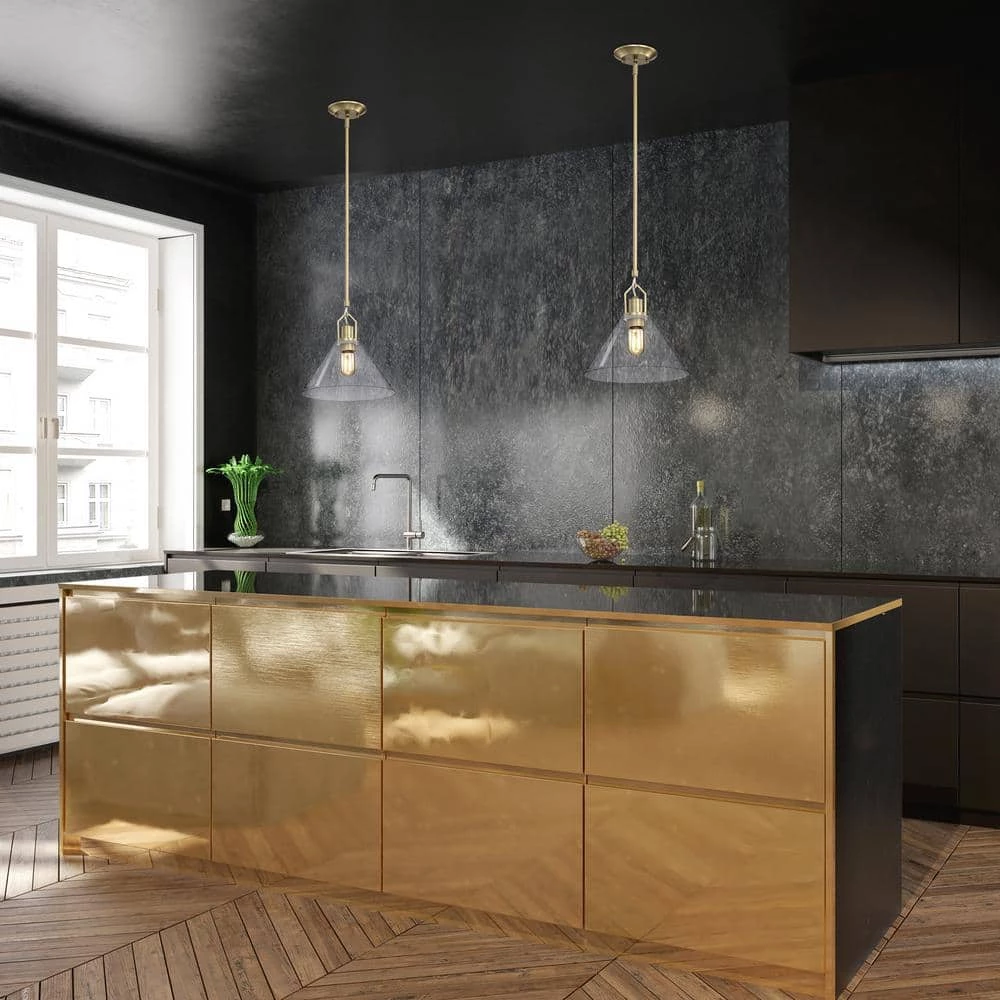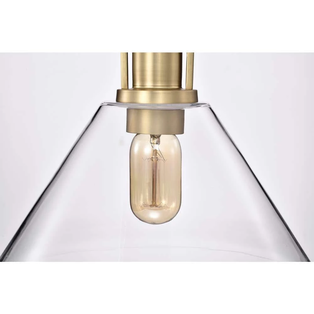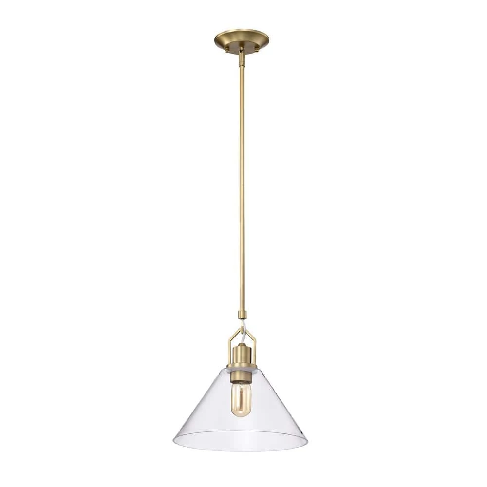 Evoking modern sensibility, this pendant light brightens the room anywhere you place it. Featuring a shiny vintage brass finish hardware and a clear glass cone shade, this modern pendant light has a timeless look. Place this brass pendant light on its own or in multiples over the kitchen island, breakfast nook or dining room. 4 rods are included to allow a customized hanging length for different ceiling heights.
