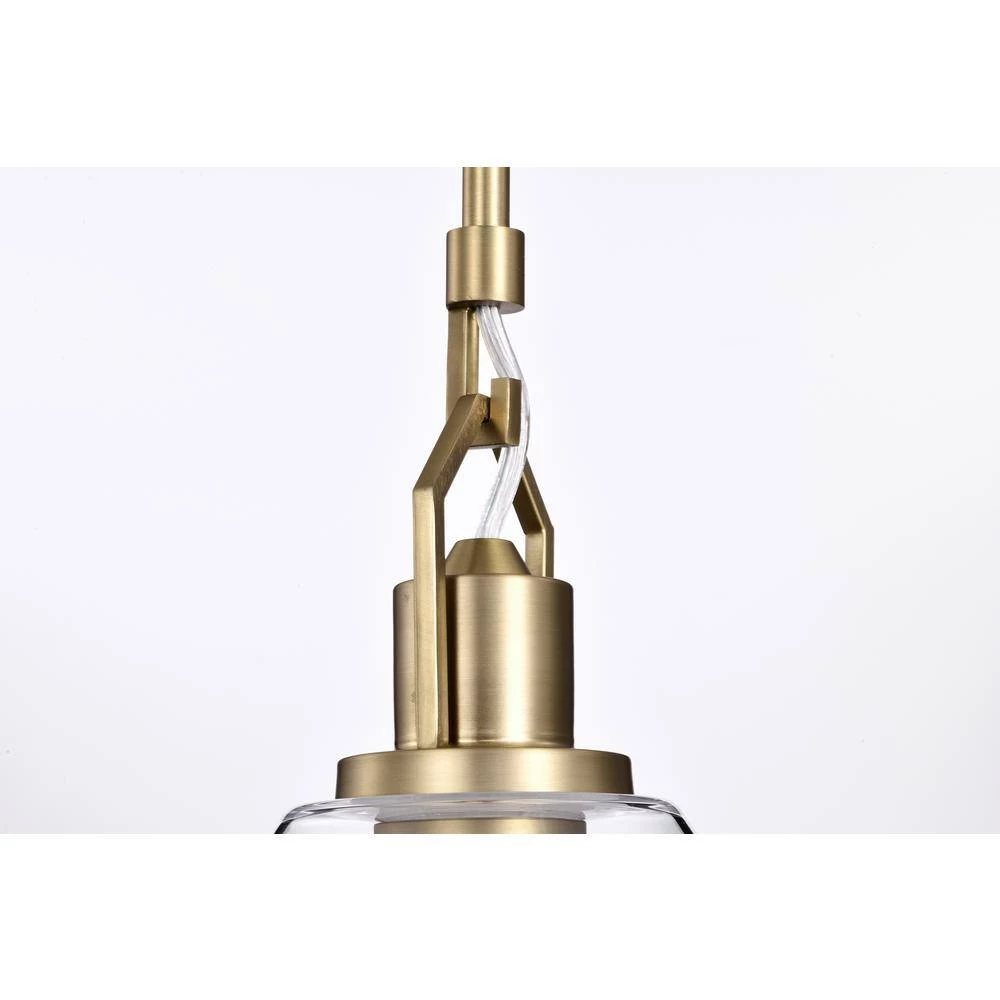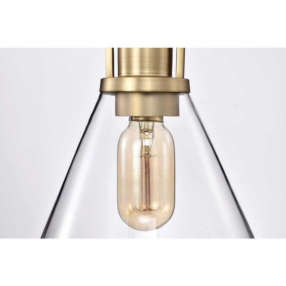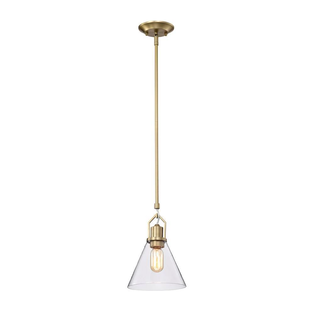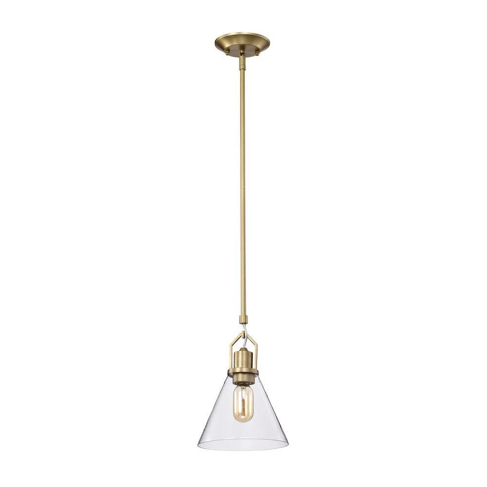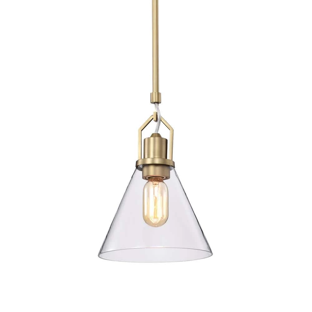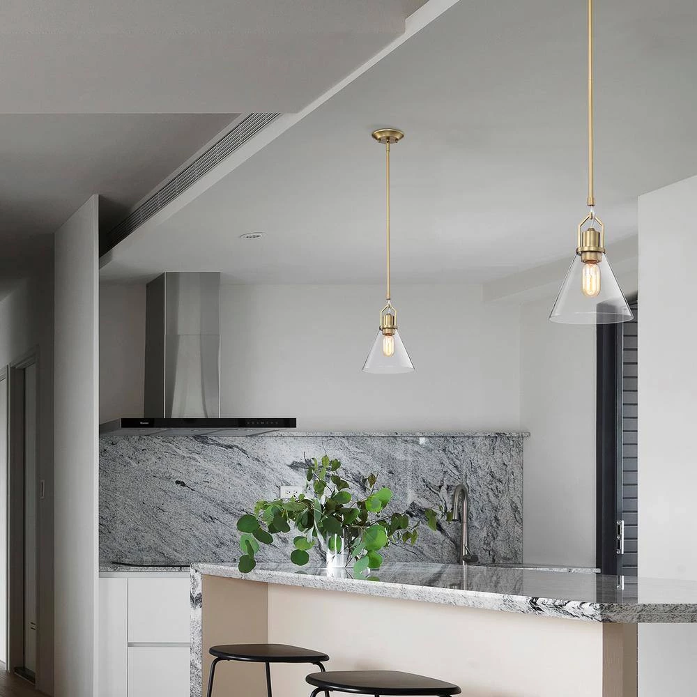 Accented by its vintage brass finish and clear cone glass shade, this modern mini pendant adds an updated look to any room. Measuring at 8 in. Dia and 11.5 in. H, this brass pendant light is ideal for brightening up the kitchen island, breakfast table, or dining room on its own or in multiples. The light fixture is hardwired and includes 4 rods to customize your hanging height to suit different ceiling heights.