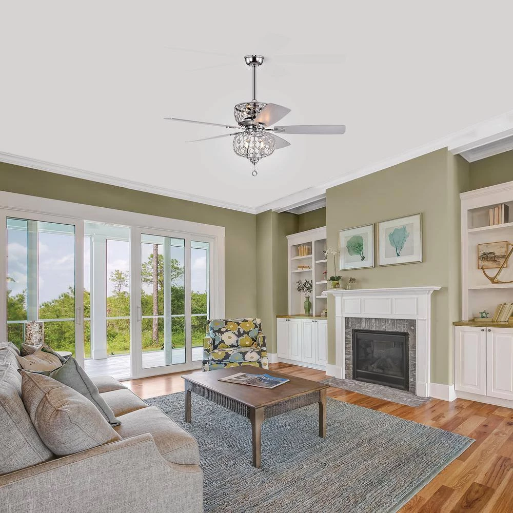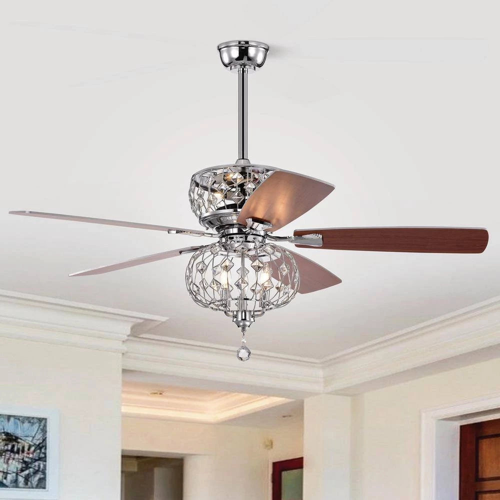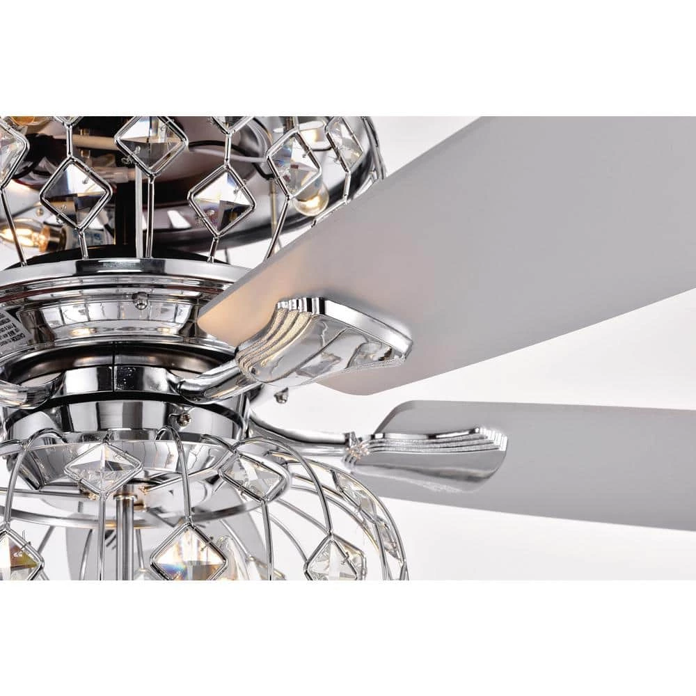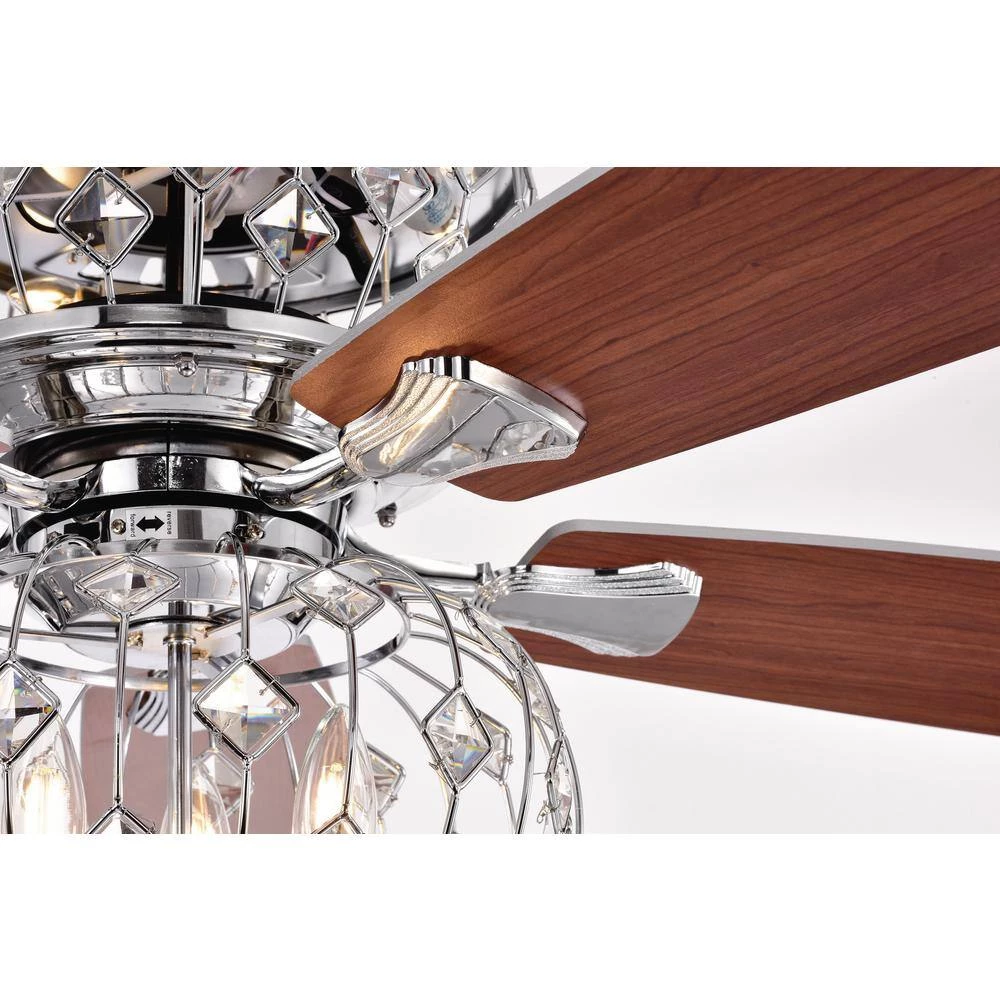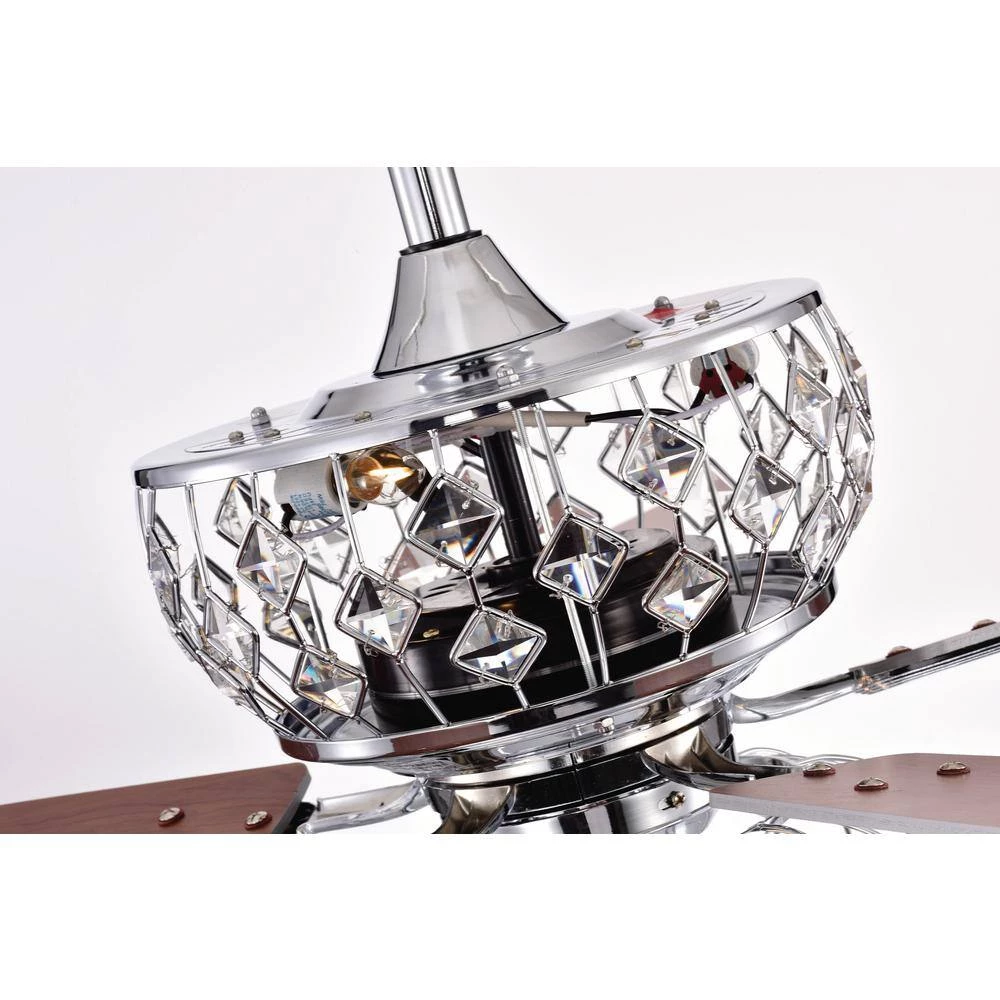 This ceiling fan with light kit provides ample airflow to your indoor spaces while adding visual interest and elegance. The unique design of the light kit displays a glamorous overlay of diamond shaped crystals. The reversible wooden blades of this crystal fandelier are finished in silver on one side and a rich mahogany on the opposite side, making this indoor ceiling fan a versatile option.