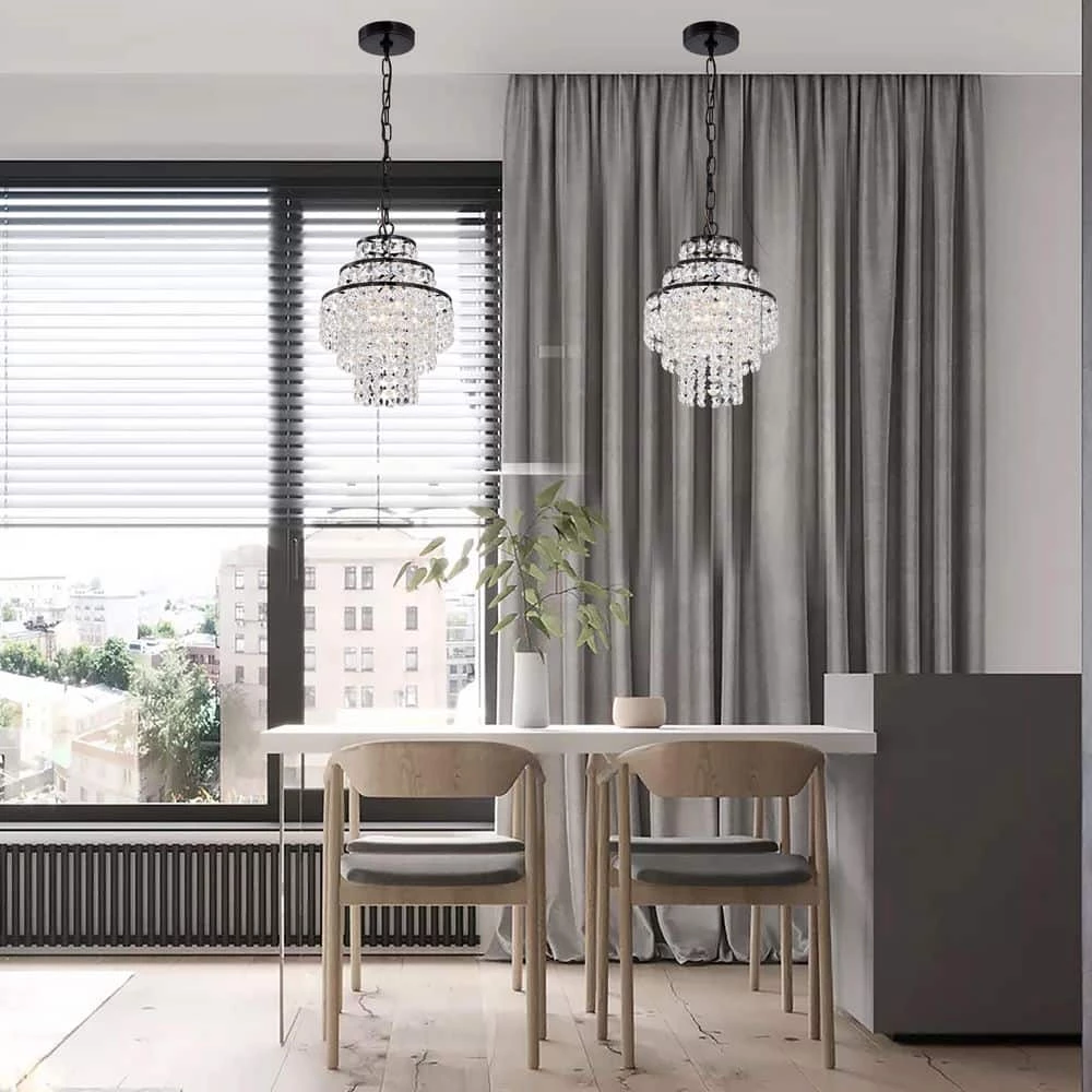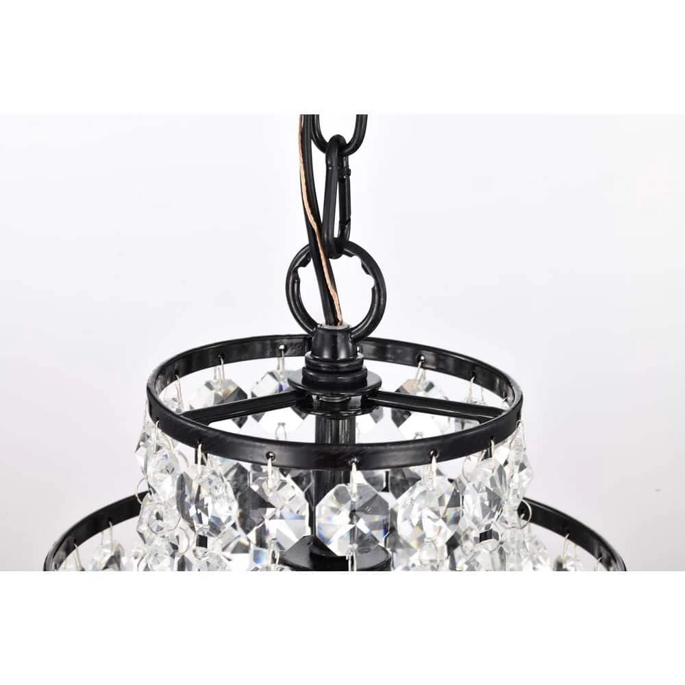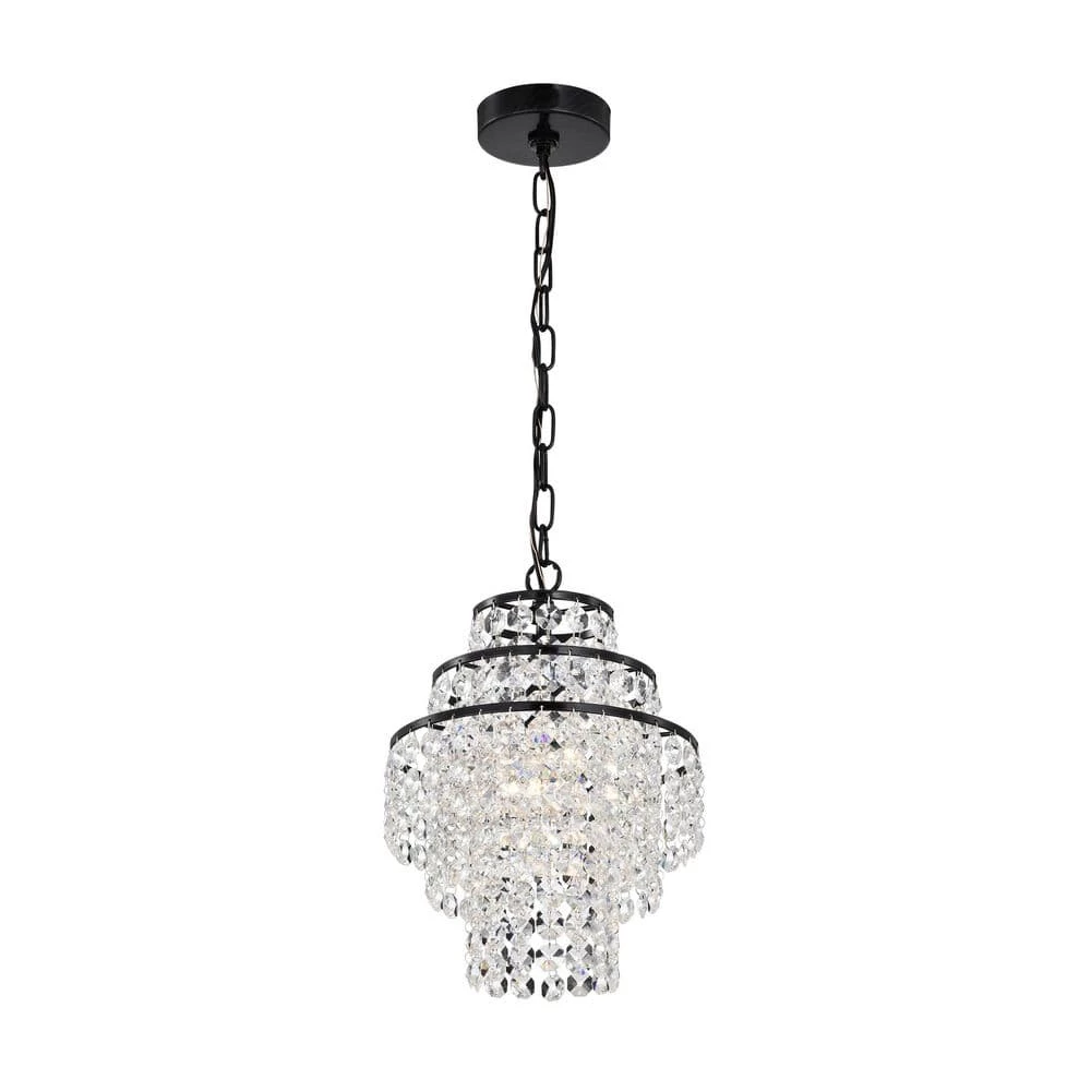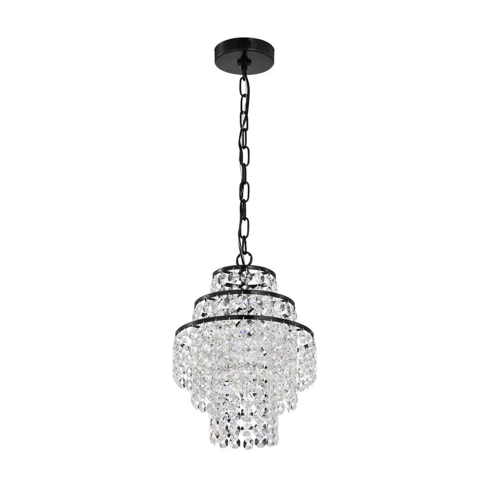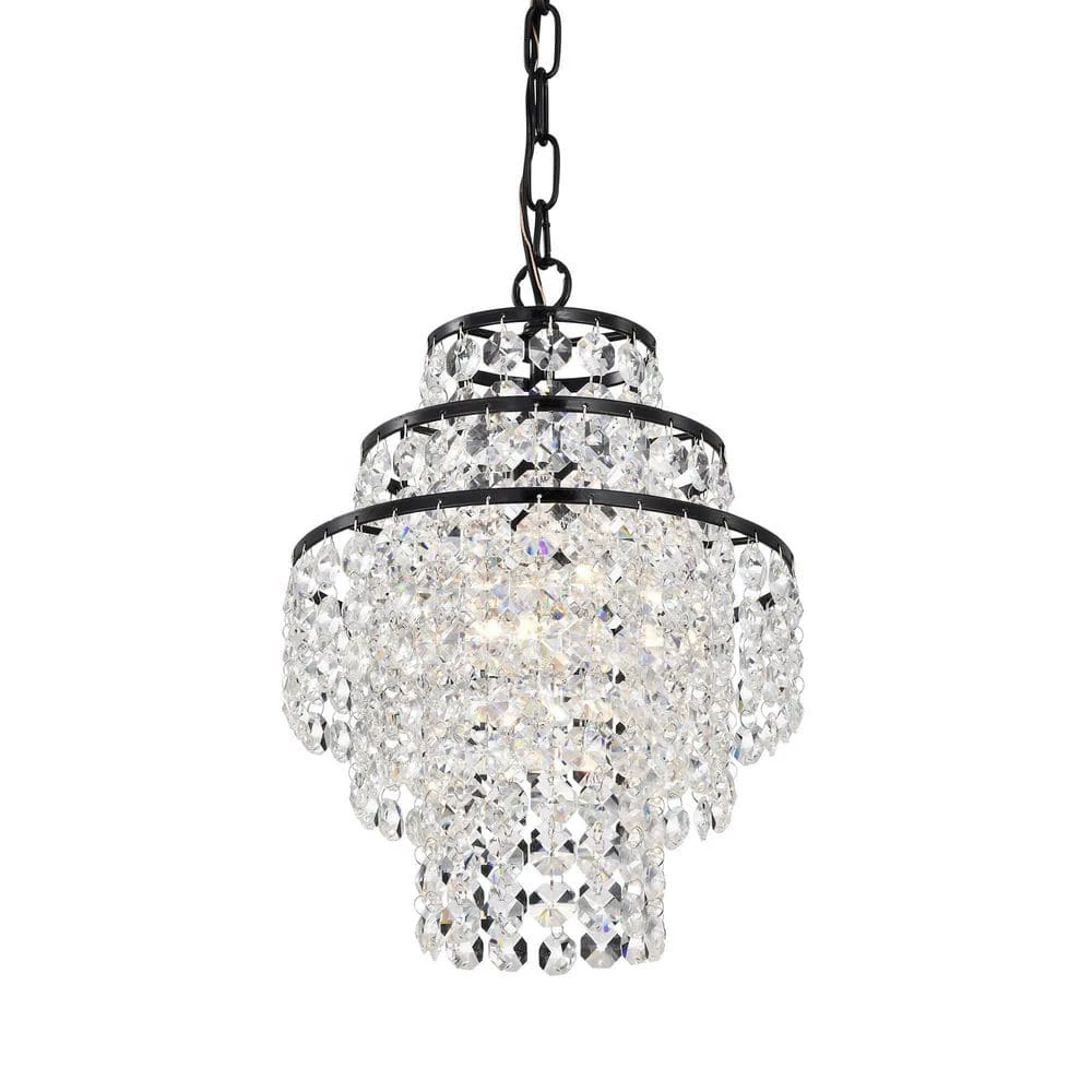 The Arietta 1-light mini chandelier has all the marvelous qualities of a grand crystal chandelier without taking up too much space. A nest of three rings with hanging crystal strands creates a beautiful tiered cascading design. Beneath the multi-faceted clear glass crystals, one E26 base bulb (not included) shines through. Place this light on its own or in multiples above the kitchen island, breakfast nook, or dining room as a source of light and home accent. The antique black finish of this mini chandelier is made to complement a variety of home interiors. Hanging from an adjustable 40 in. chain, this light is also compatible with a dimmer switch and dimmable bulbs.