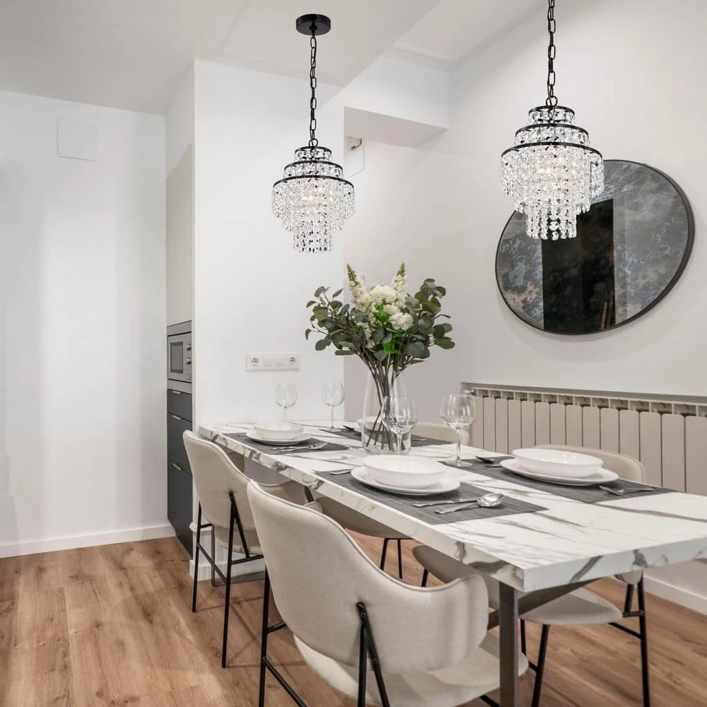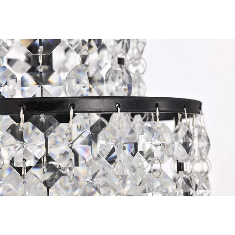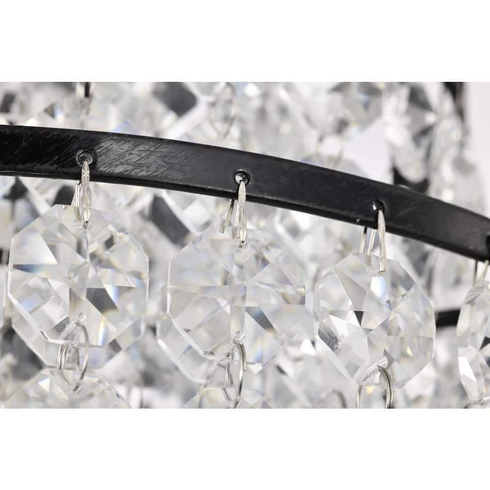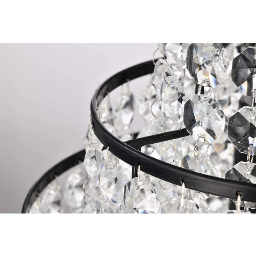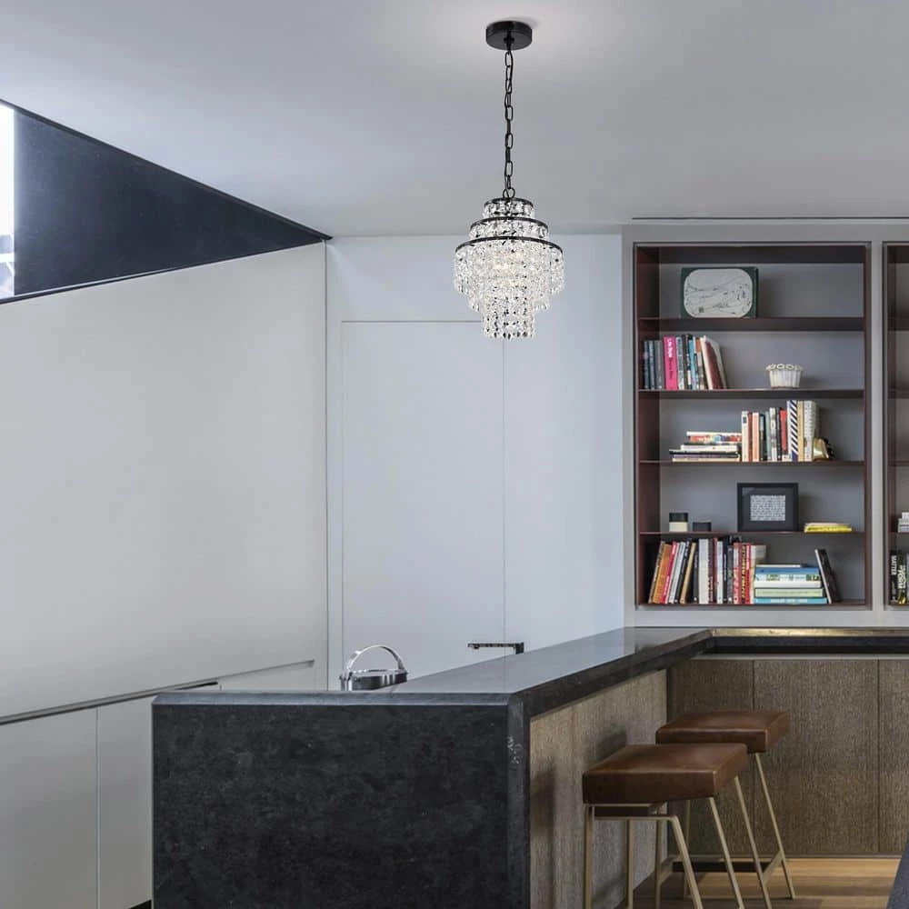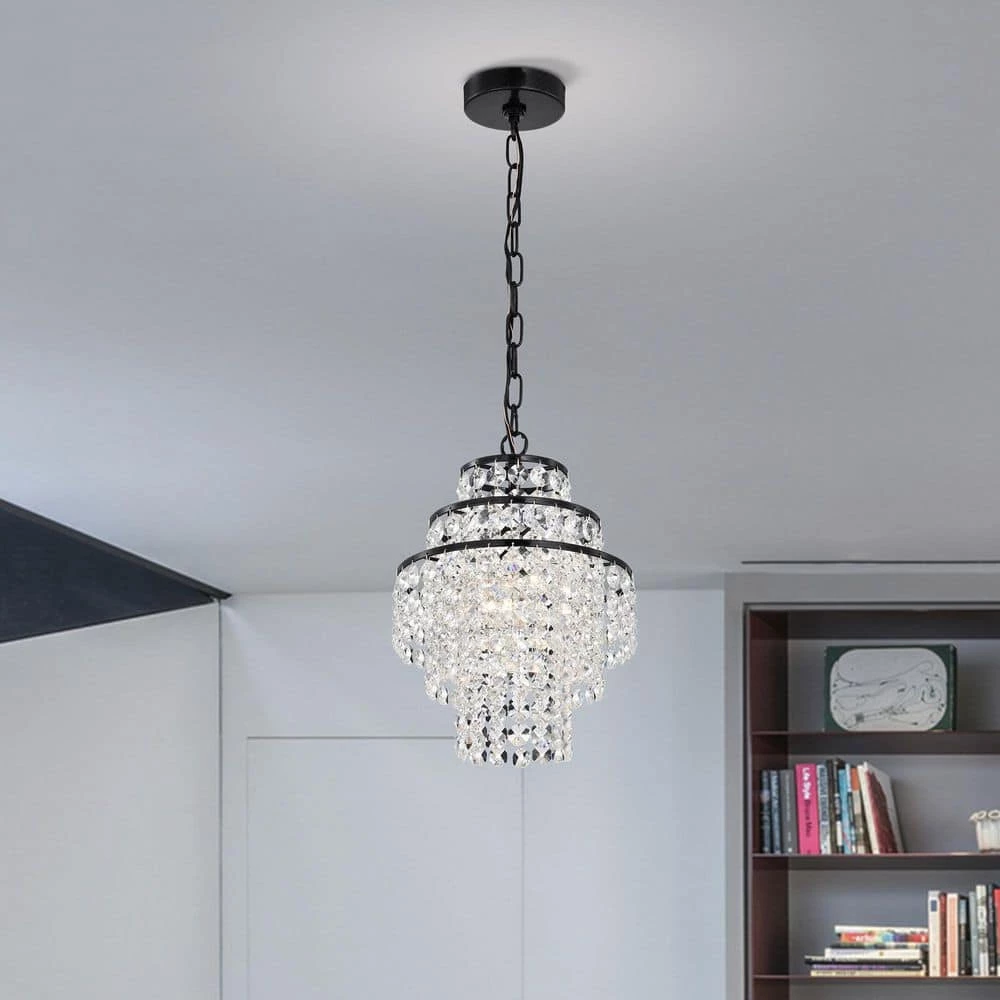 The Arietta 1-light mini chandelier has all the marvelous qualities of a grand crystal chandelier without taking up too much space. A nest of three rings with hanging crystal strands creates a beautiful tiered cascading design. Beneath the multi-faceted clear glass crystals, one E26 base bulb (not included) shines through. Place this light on its own or in multiples above the kitchen island, breakfast nook, or dining room as a source of light and home accent. The antique black finish of this mini chandelier is made to complement a variety of home interiors. Hanging from an adjustable 40 in. chain, this light is also compatible with a dimmer switch and dimmable bulbs.