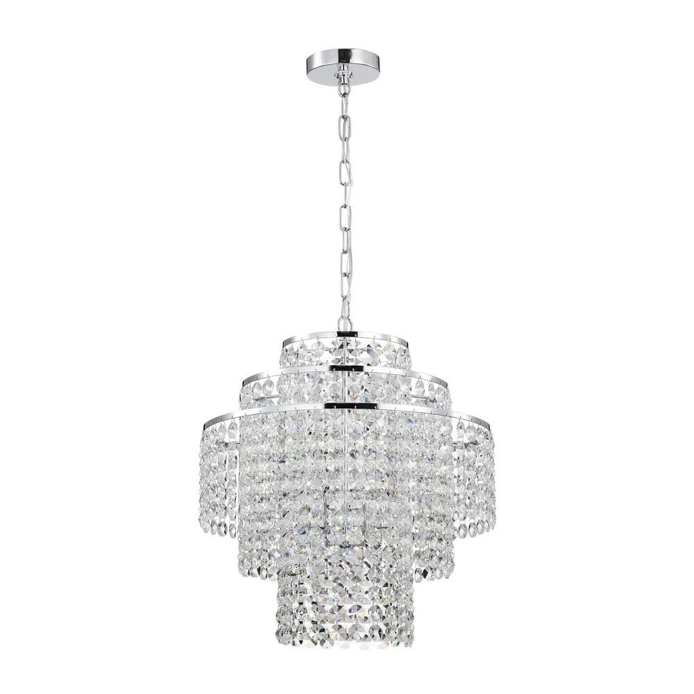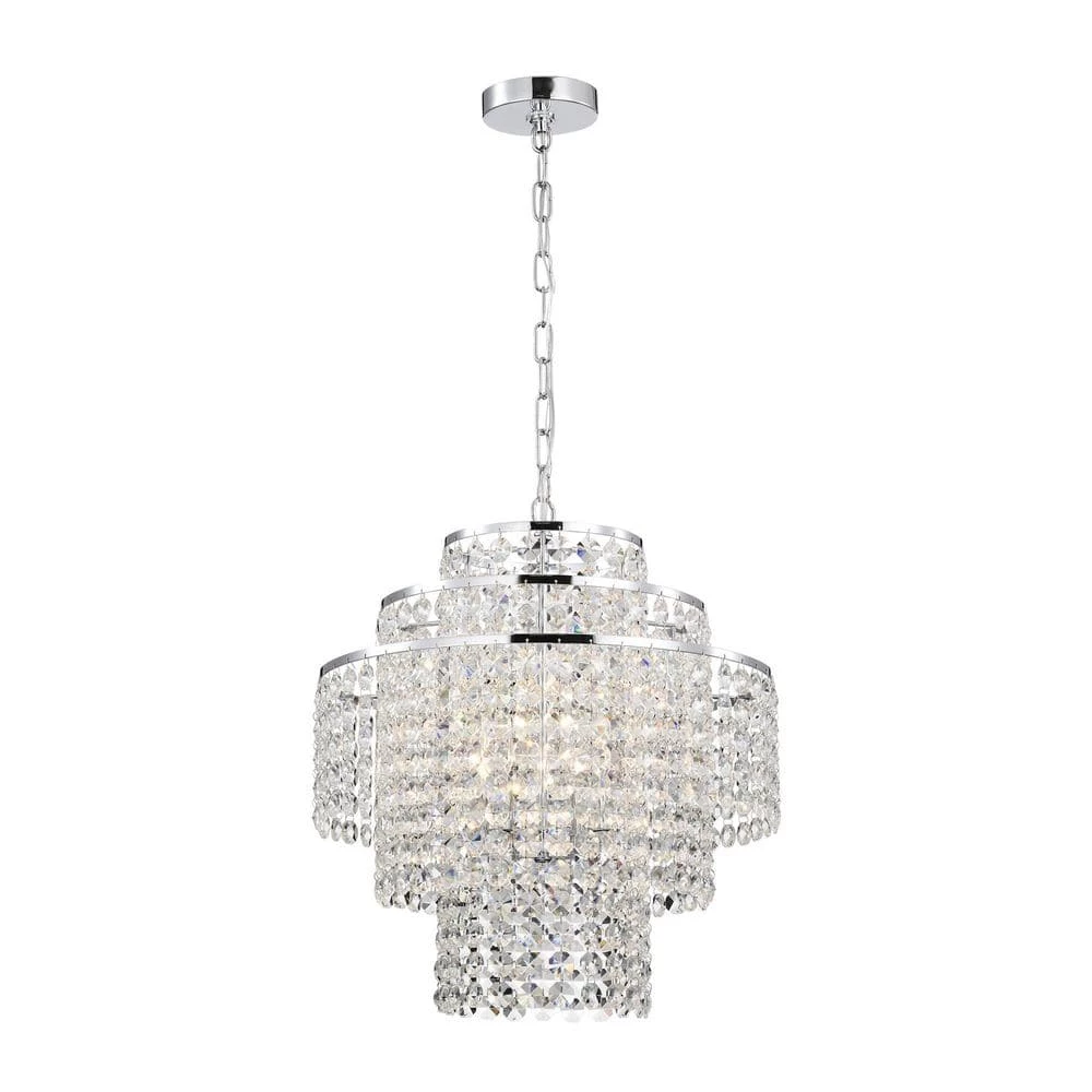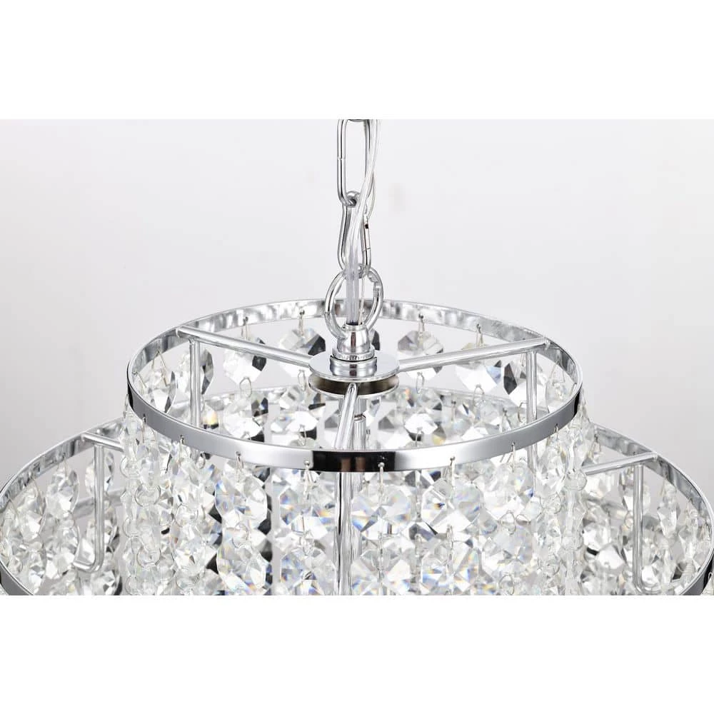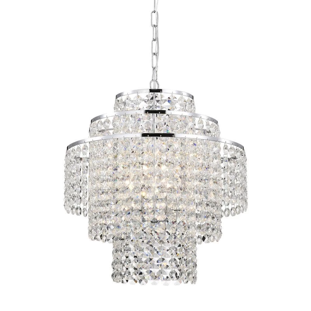 Send sparkles all throughout your home with this stunning 4 light tiered crystal chandelier. The unique silhouette of this chandelier features a nest of rings that form tiers of cascading crystal strands. Beneath the gorgeous array of reflective crystals are four E12 candelabra bulbs (not included) that emit a soft, ambient glow. Place this modern chandelier in the entryway to grab the attention of your guests, or above the dining room to illuminate special gathering moments. For ease of installation, this chandelier comes with a 40 in. adjustable chain that may be shortened to suit a variety of different ceiling heights and room sizes. We recommend adding a dimmer switch to set the mood accordingly.