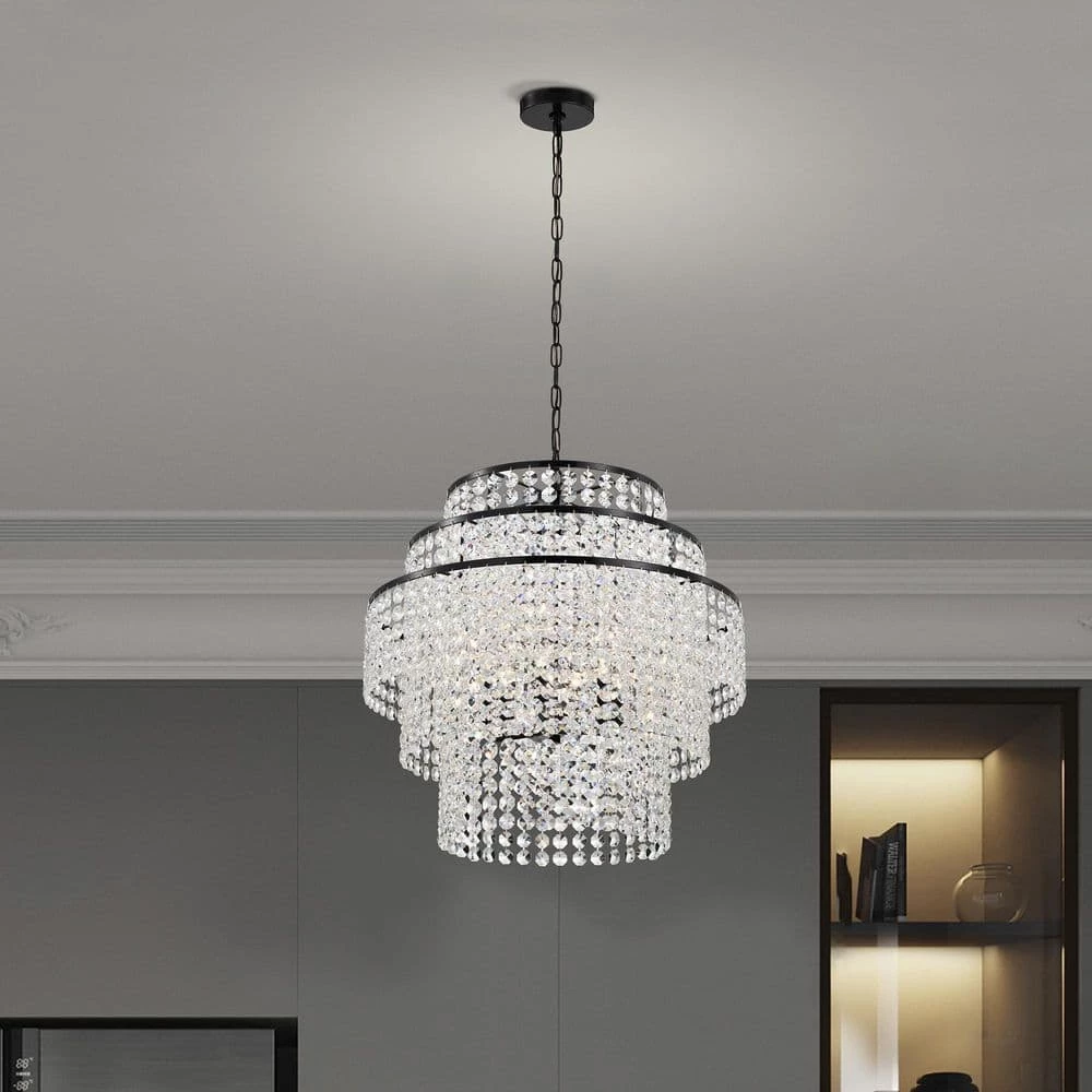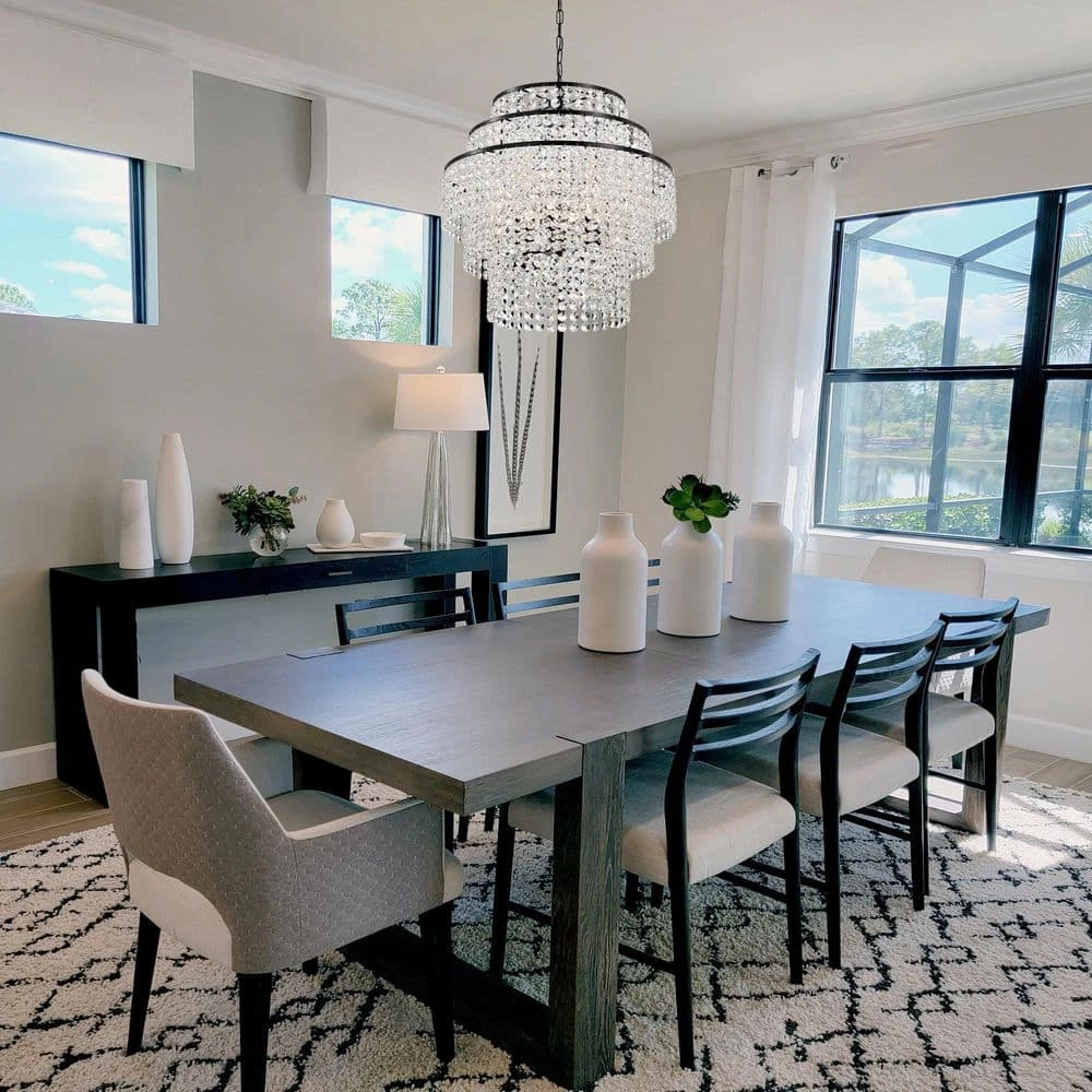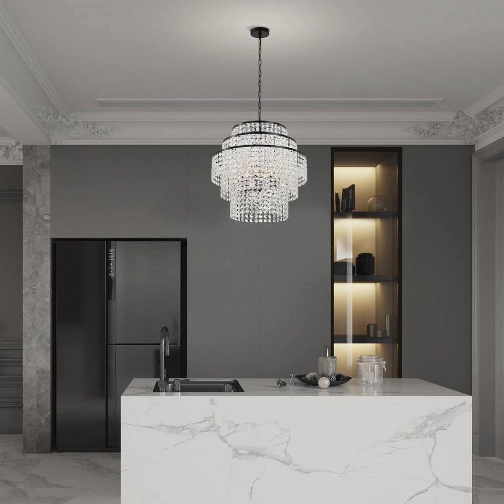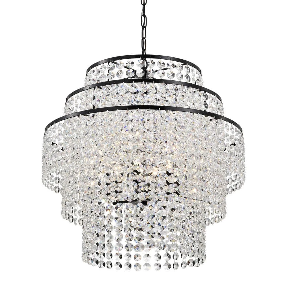 Elevate the ambiance of your home with the Arietta 6-light crystal chandelier. This chandelier features 3-tiers of multi-faceted octagonal crystal strands that create a beautiful cascading effect. The 6 E12 candelabra base bulbs (not included) make this crystal chandelier an abundant light source above the entryway, living room, dining room, or bedroom. For ease of installation, this modern light is equipped with an adjustable 40 in. chain that may be shortened to suit a variety of ceiling heights and room sizes. We recommend adding a dimmer switch with compatible dimmable bulbs to set the mood accordingly.