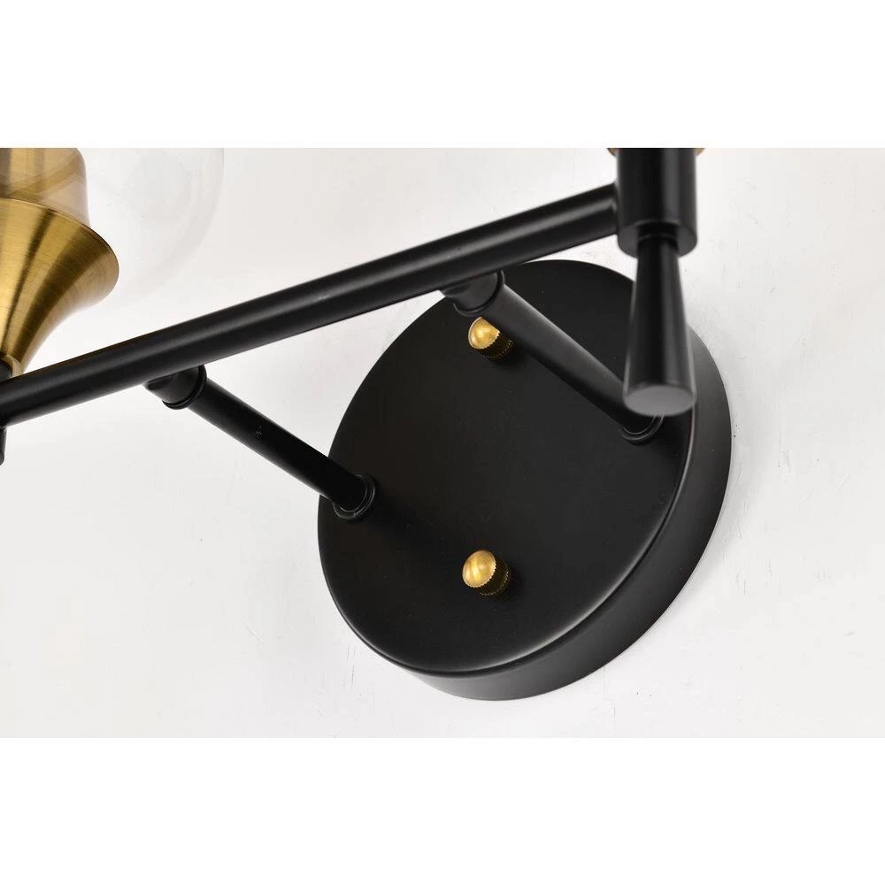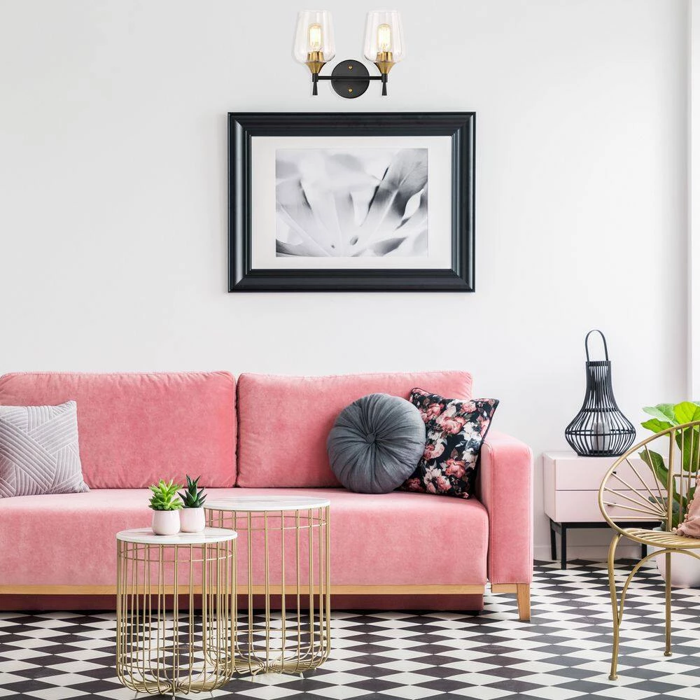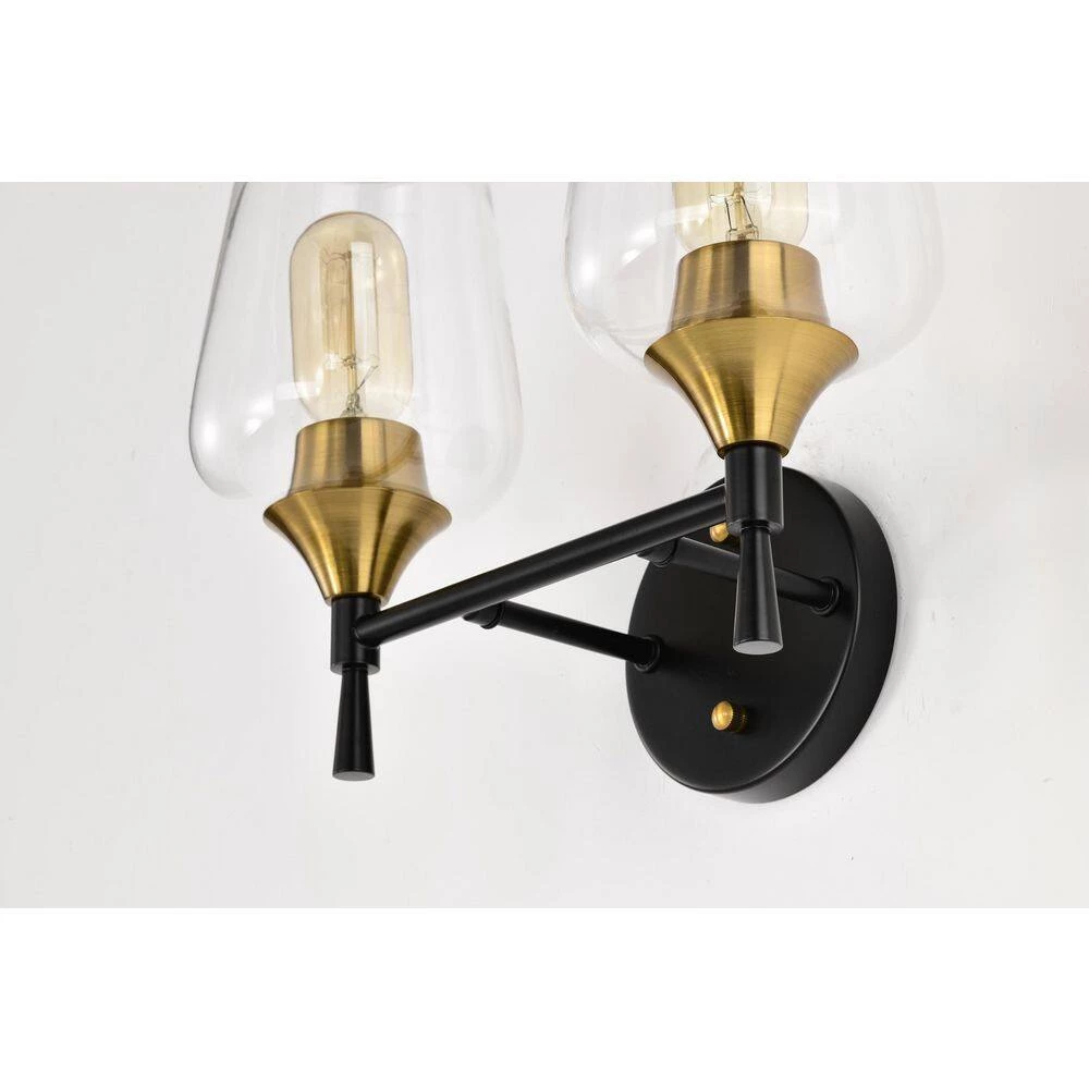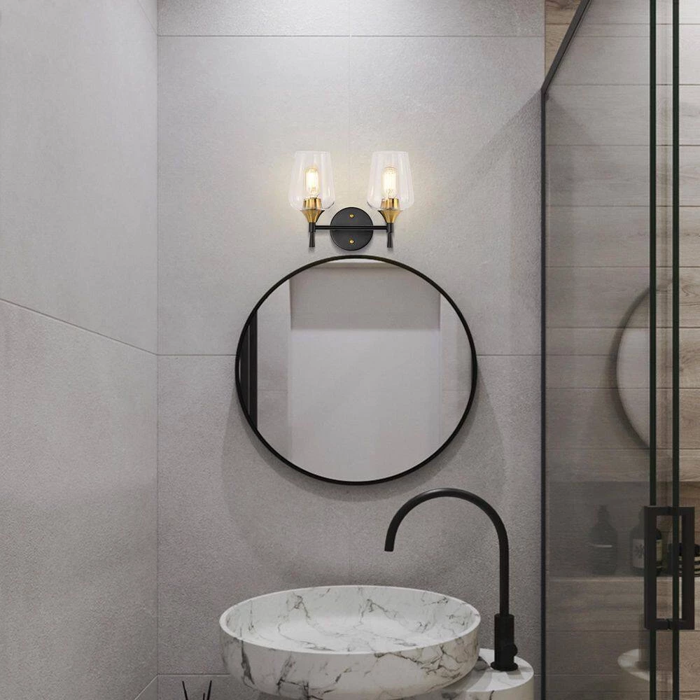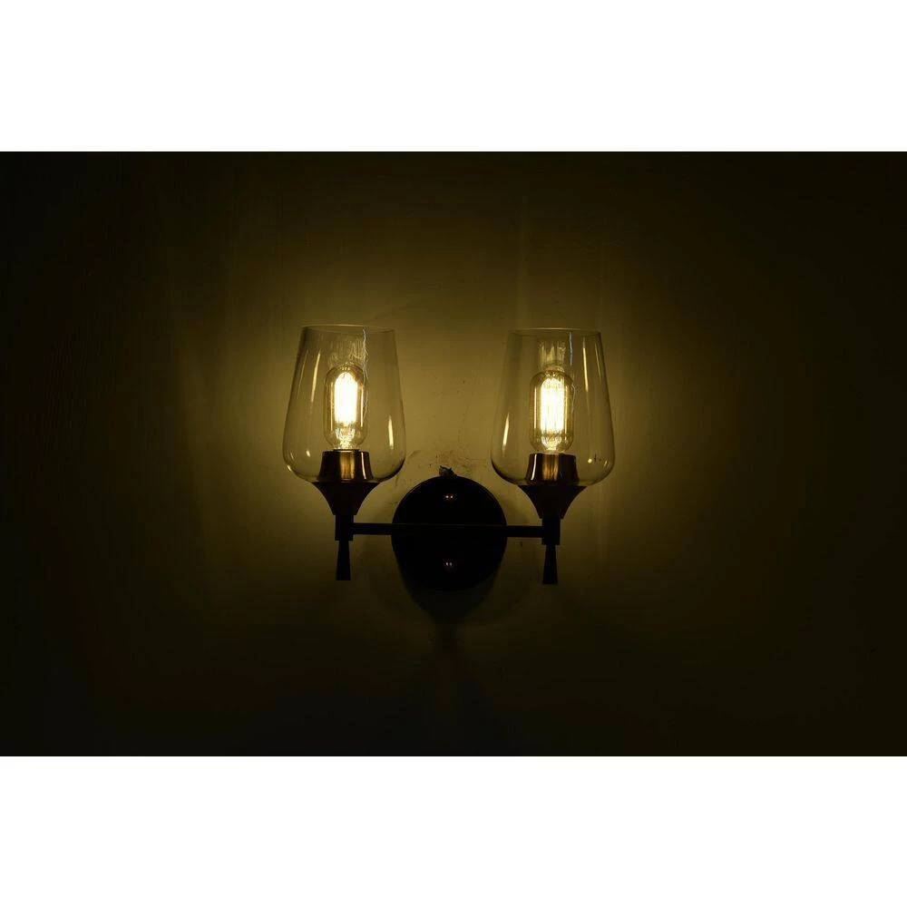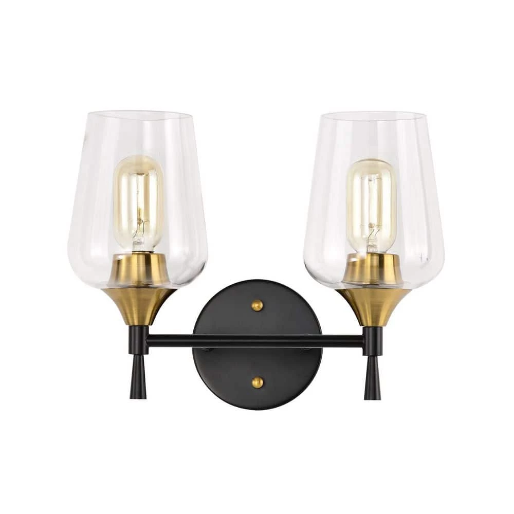 Enhance the interior design of the bathroom with this contemporary 2 light vanity. The matte black and antique brass finish create a stark contrast that adds drama to the overall design. This vanity light features fine details with its tapered stems and clear wine glass shade that allow the 2 medium base bulbs (not included) to fill the room with illumination. Place this vanity light above your bathroom mirror to complement the rest of your decor. We recommend adding a dimmer switch with dimmable bulbs to set the mood accordingly.