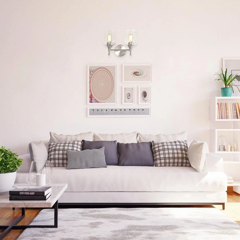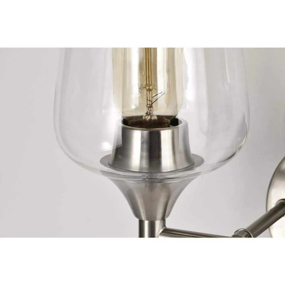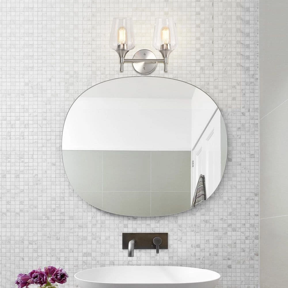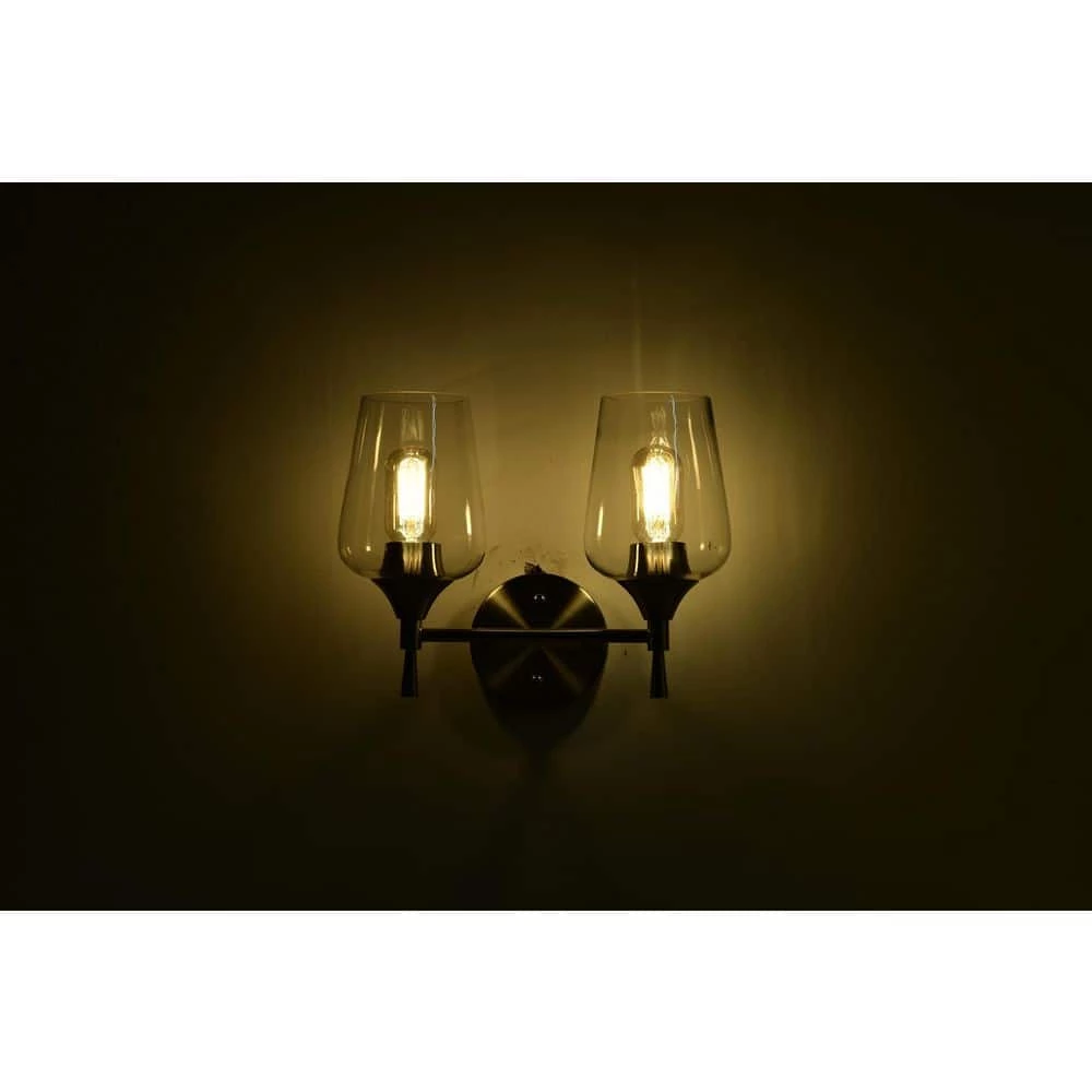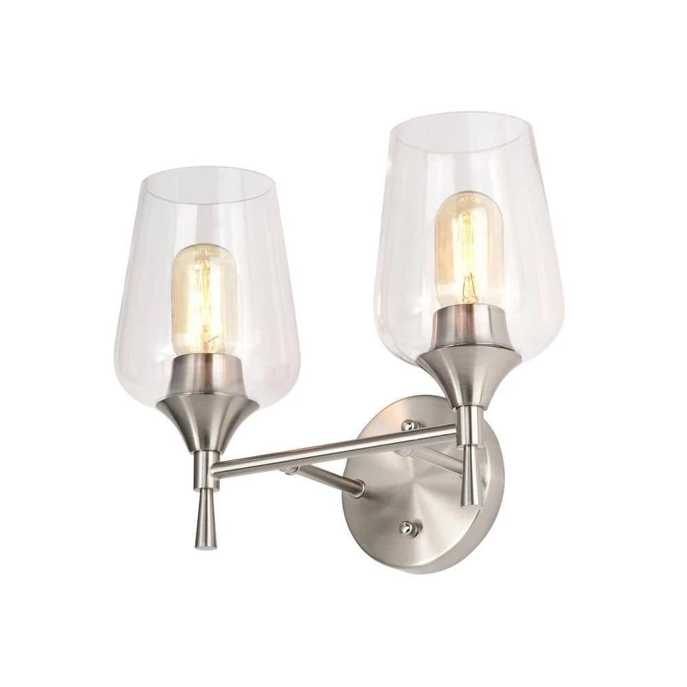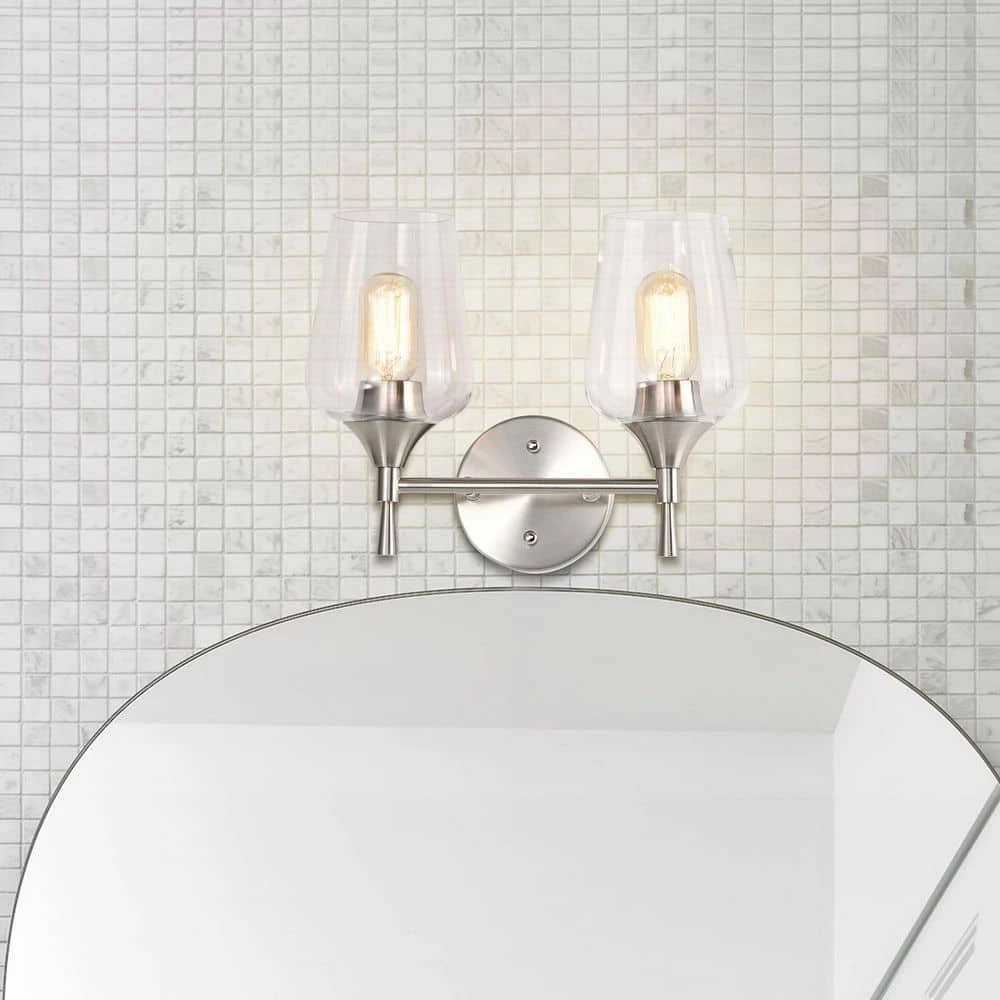 This contemporary 2-light vanity will instantly update the overall design of your bathroom with its modern finish and classic silhouette. The tapered stems complement the clear wine glass shades in a shiny brushed nickel finish. The 2 medium base bulbs not included shine through the clear glass shades, filling the room with light. Place this vanity light above the bathroom mirror to enhance the rest of your decor. We recommend adding a dimmer switch with dimmable bulbs to set the mood accordingly.