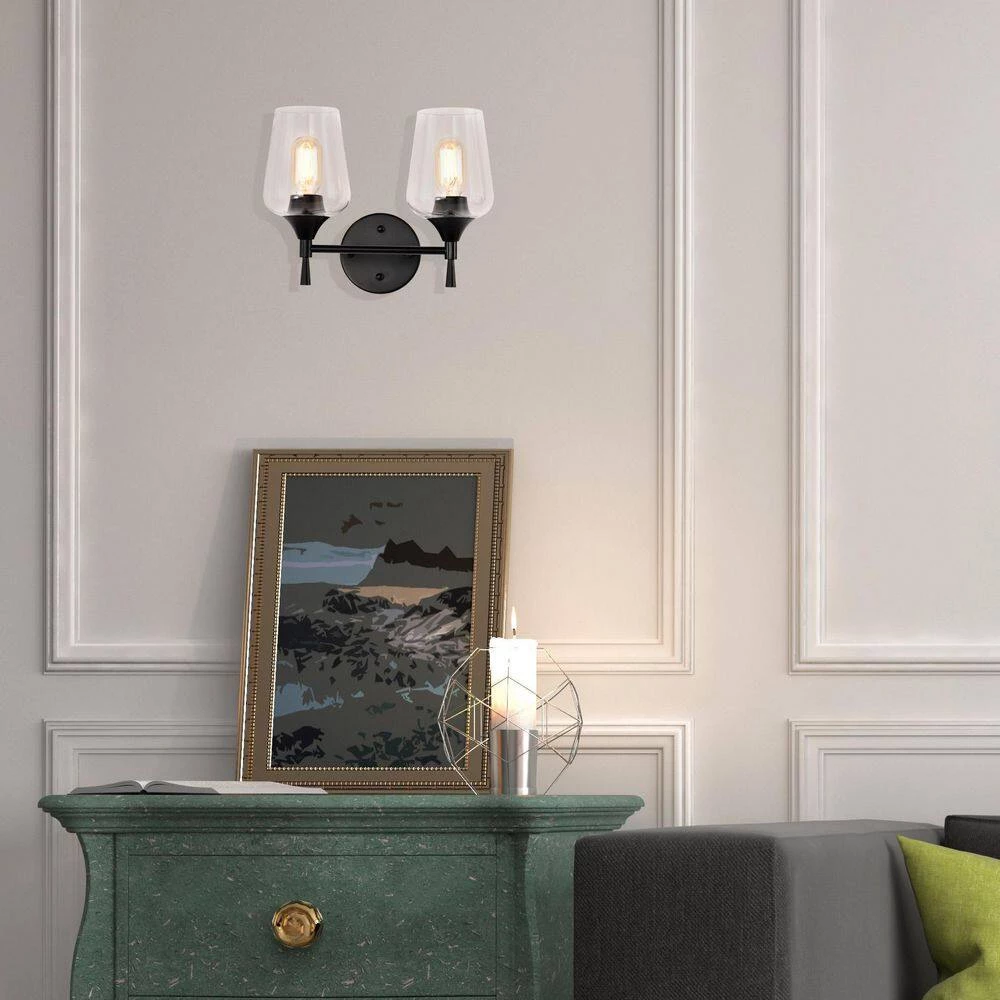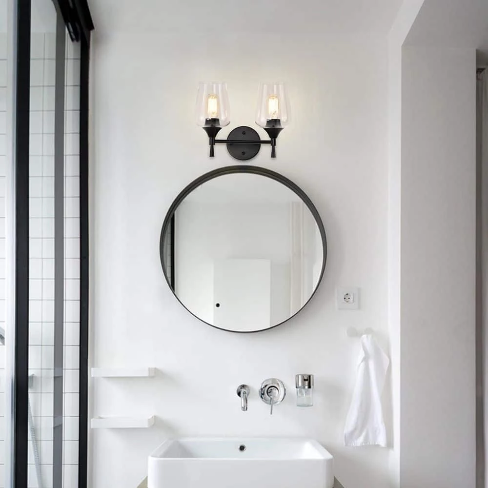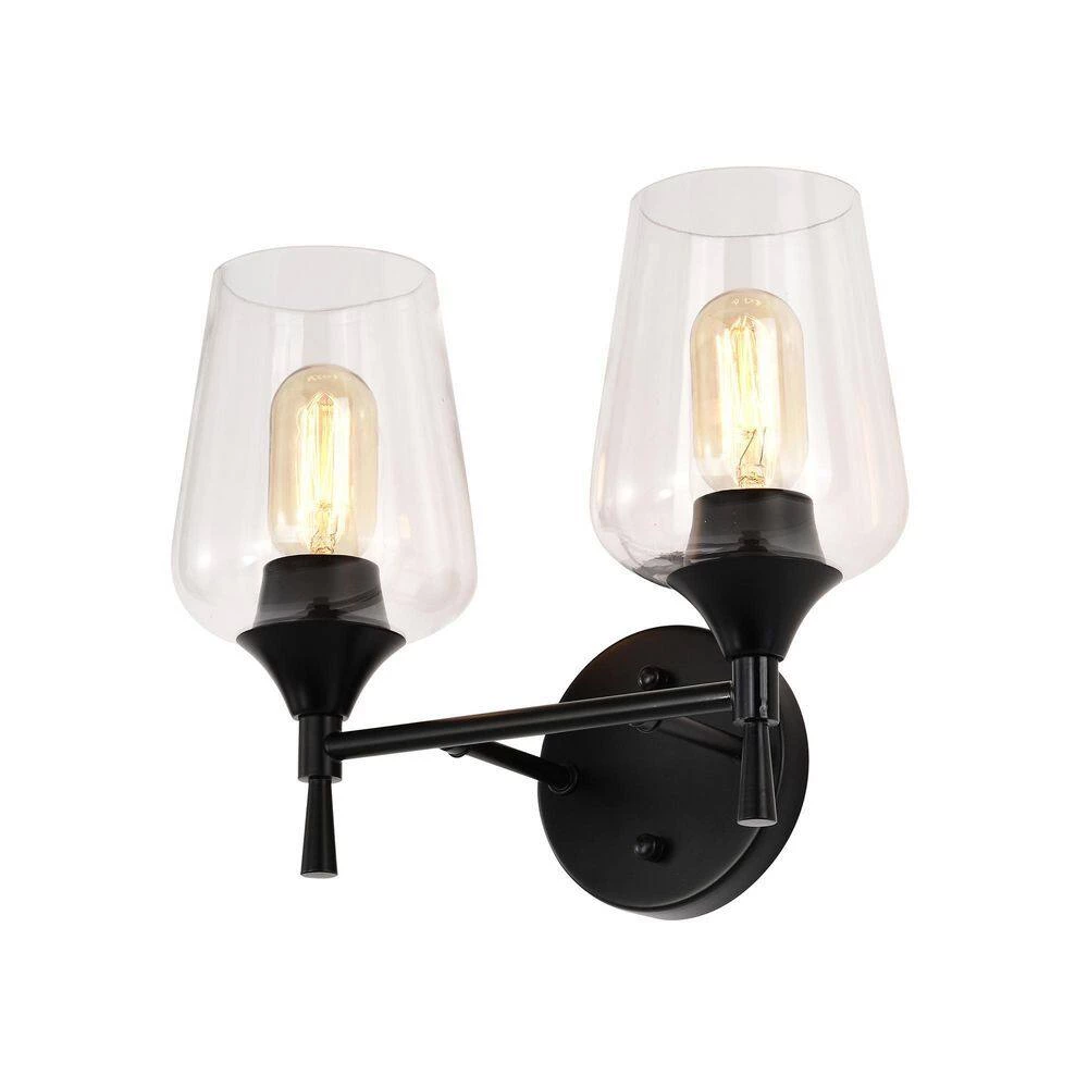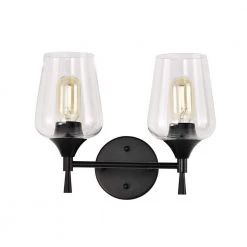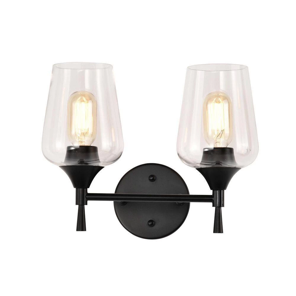 Transform the ambiance of your bathroom with this contemporary 2-light vanity. With its sleek design and unique silhouette, this modern vanity light features a versatile matte black finish and clear wine glass shades that bathe the room in illumination. Place this light above the bathroom mirror to complement the rest of your decor. This light takes 2 medium base bulbs, not included. We recommend adding a dimmer switch with dimmable bulbs to set the mood accordingly.