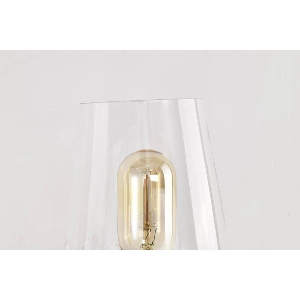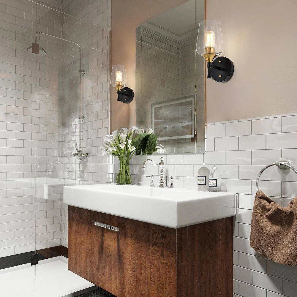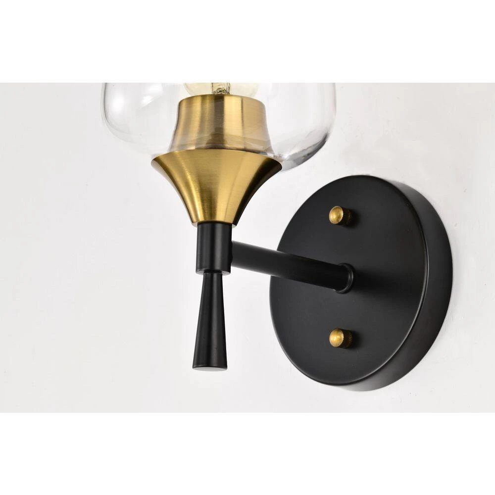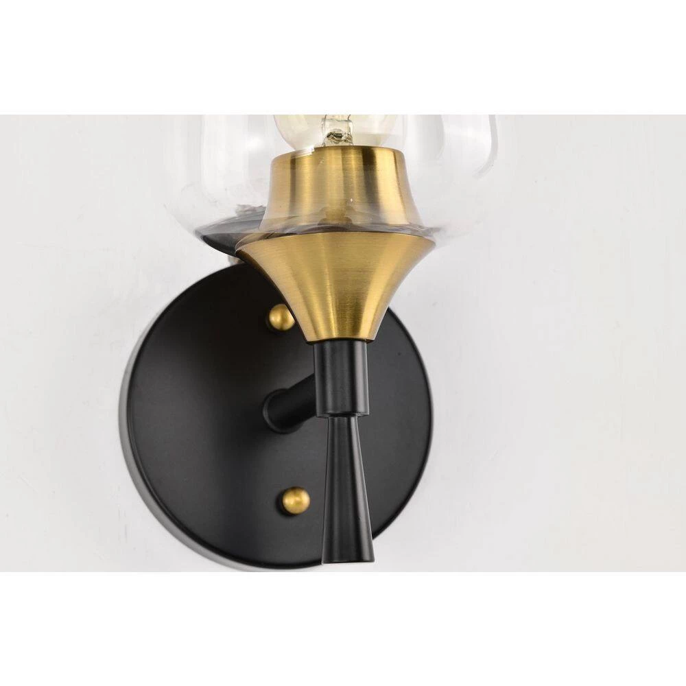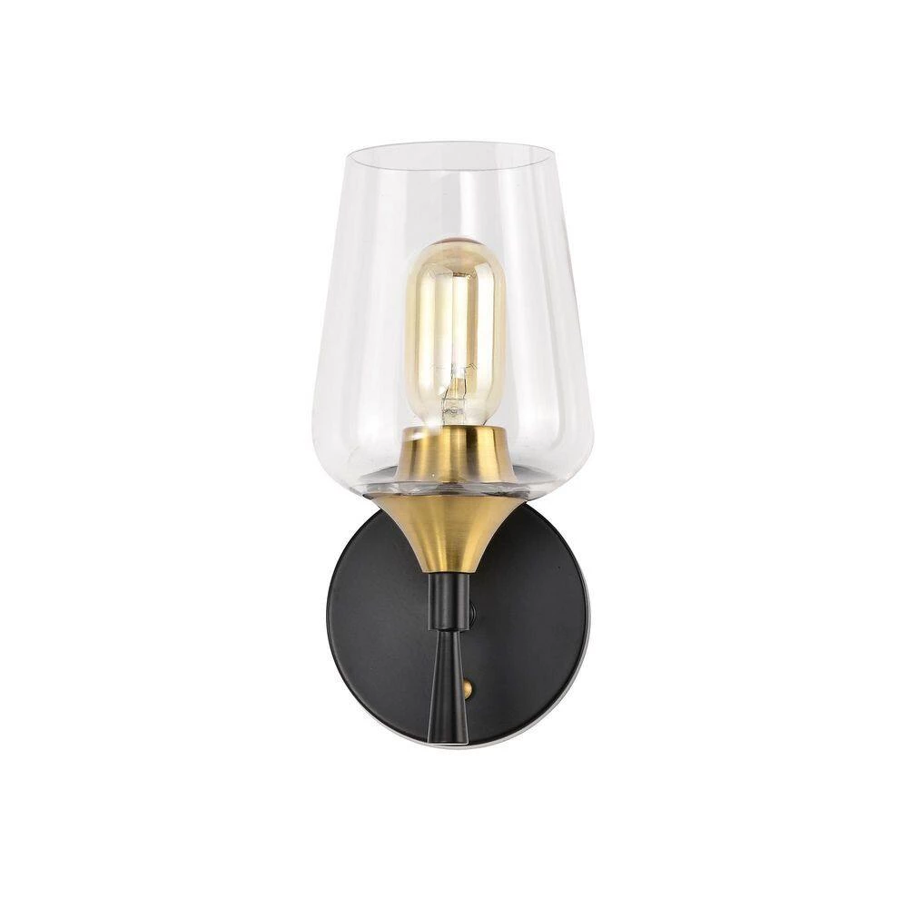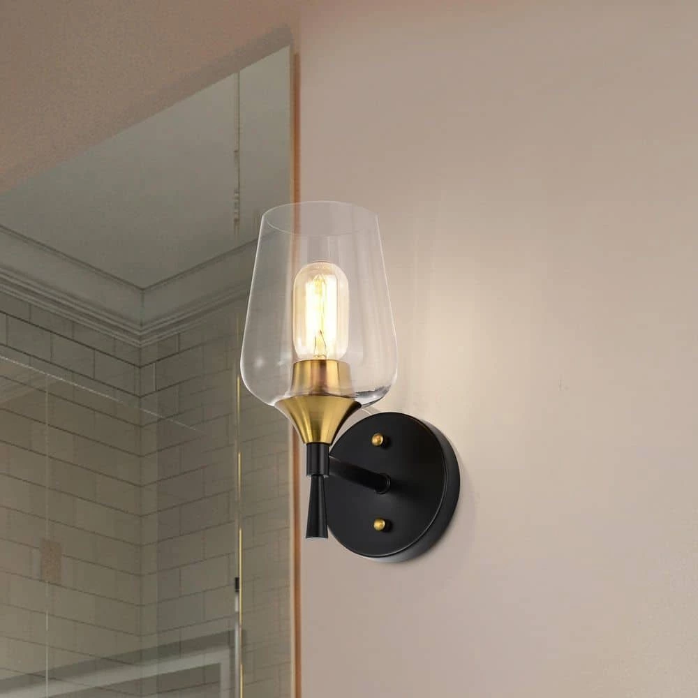 The silhouette of this contemporary 1-light wall sconce is defined by its tapered stem seamlessly blending into the clear wine glass shade. The antique brass and black finish of this wall light contrast each other to create visual interest. The clear glass shades allows the fine hardware underneath to shine while the medium base bulb illuminates the room. Place this wall sconce in pairs beside the bathroom mirror as vanity lighting or use it to accent the hallway, living room or bedroom. We recommend adding a dimmer switch with dimmable bulbs to set the mood accordingly.