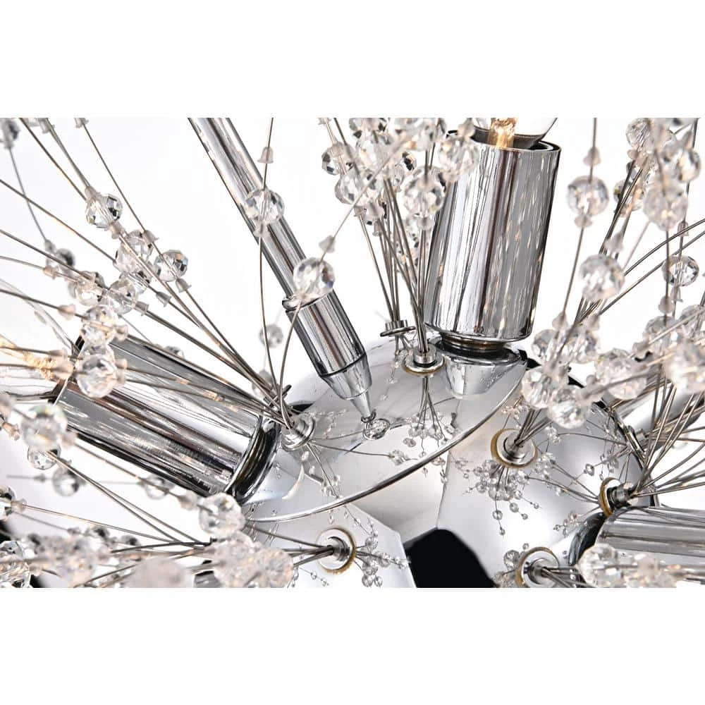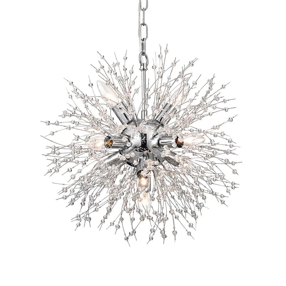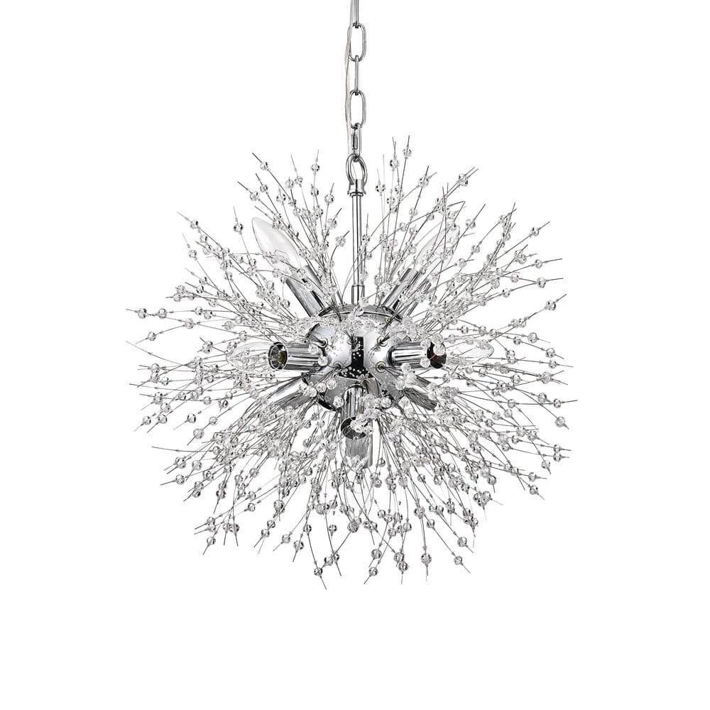 This Uptown glam lighting chandelier is dazzling and unique. Hundreds of crystals glimmer on wires that shoot out from the chrome sphere center. Add 8-candle size bulbs and a dimmer switch to this modern chandelier and your entryway, foyer, breakfast room, dining room, hallway, girls room or bedroom will sparkle with unexpected beauty. This crystal chandelier comes with a 48 inch chain that may be adjusted by removing some links to suitsmaller room sizes or ceiling heights.