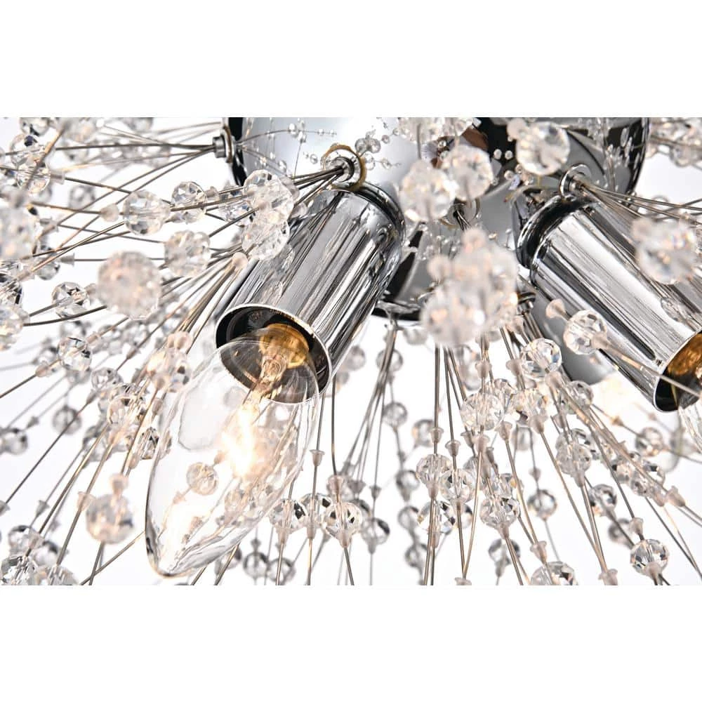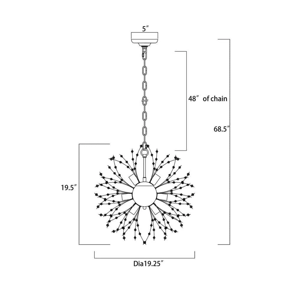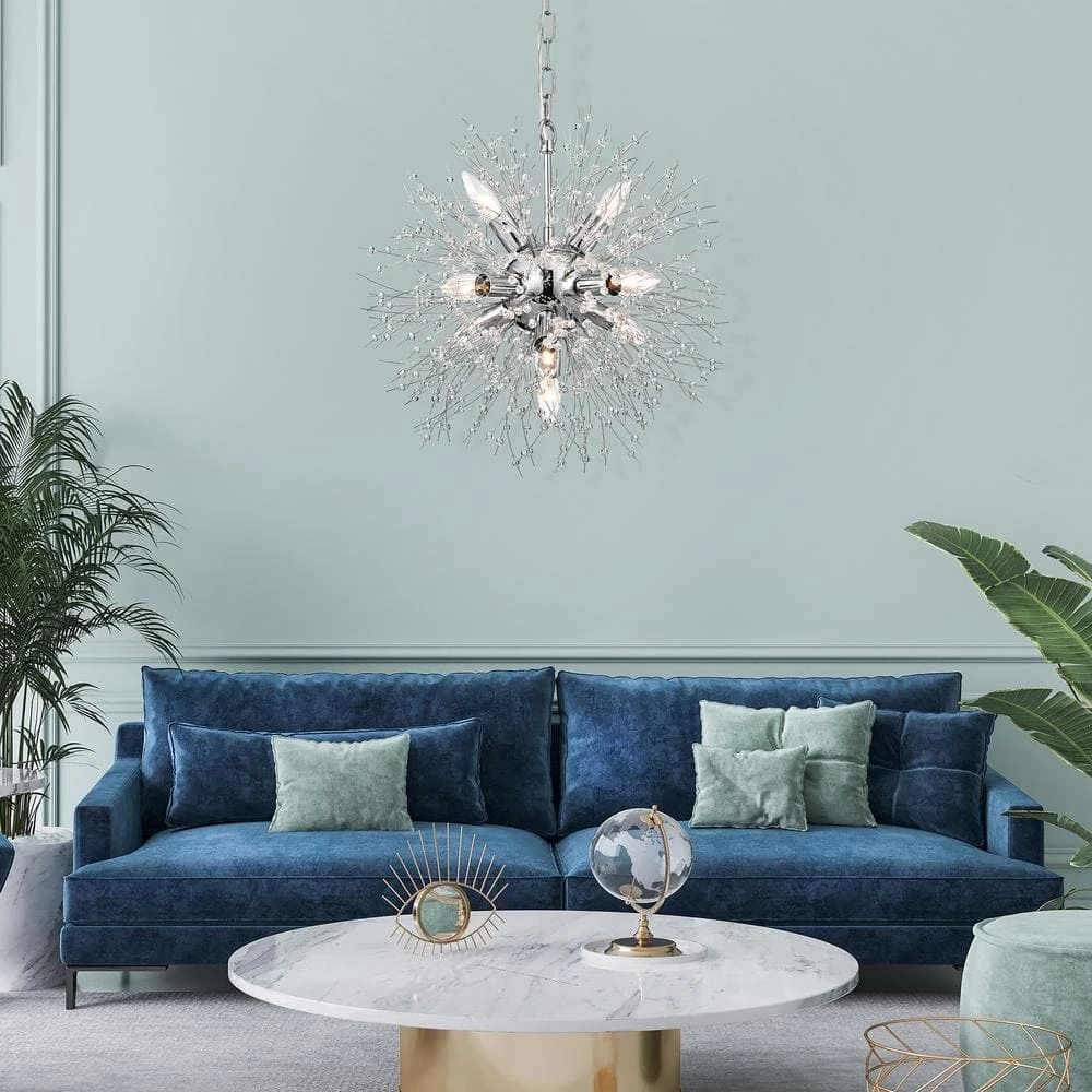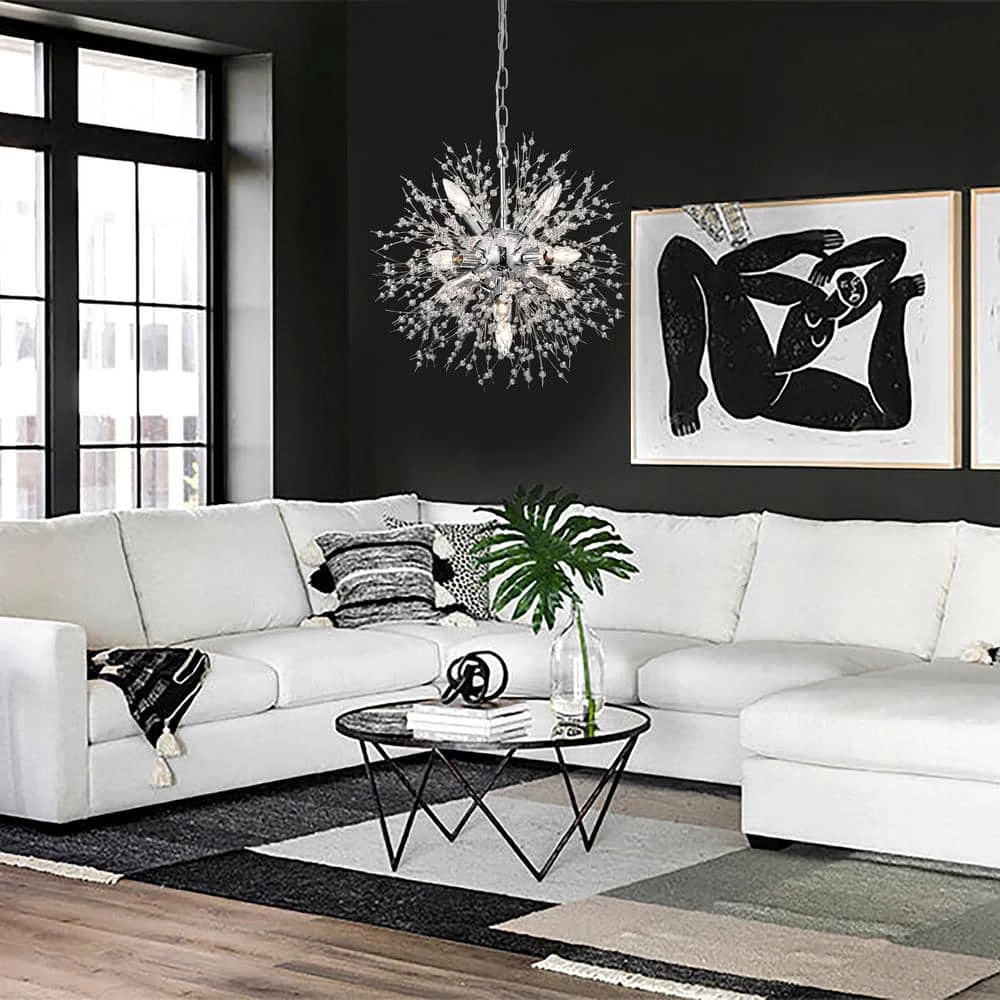 This Uptown glam lighting chandelier is dazzling and unique. Hundreds of crystals glimmer on wires that shoot out from the chrome sphere center. Add 8-candle size bulbs and a dimmer switch to this modern chandelier and your entryway, foyer, breakfast room, dining room, hallway, girls room or bedroom will sparkle with unexpected beauty. This crystal chandelier comes with a 48 inch chain that may be adjusted by removing some links to suitsmaller room sizes or ceiling heights.