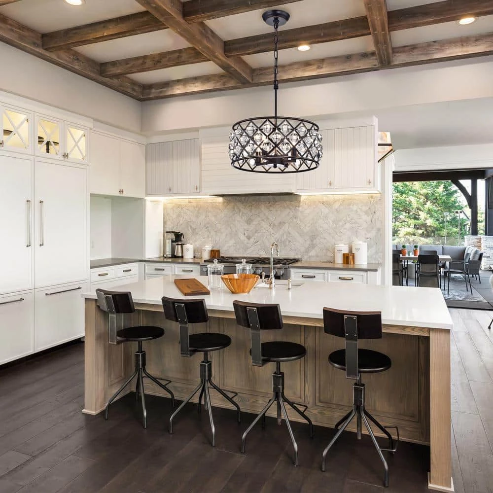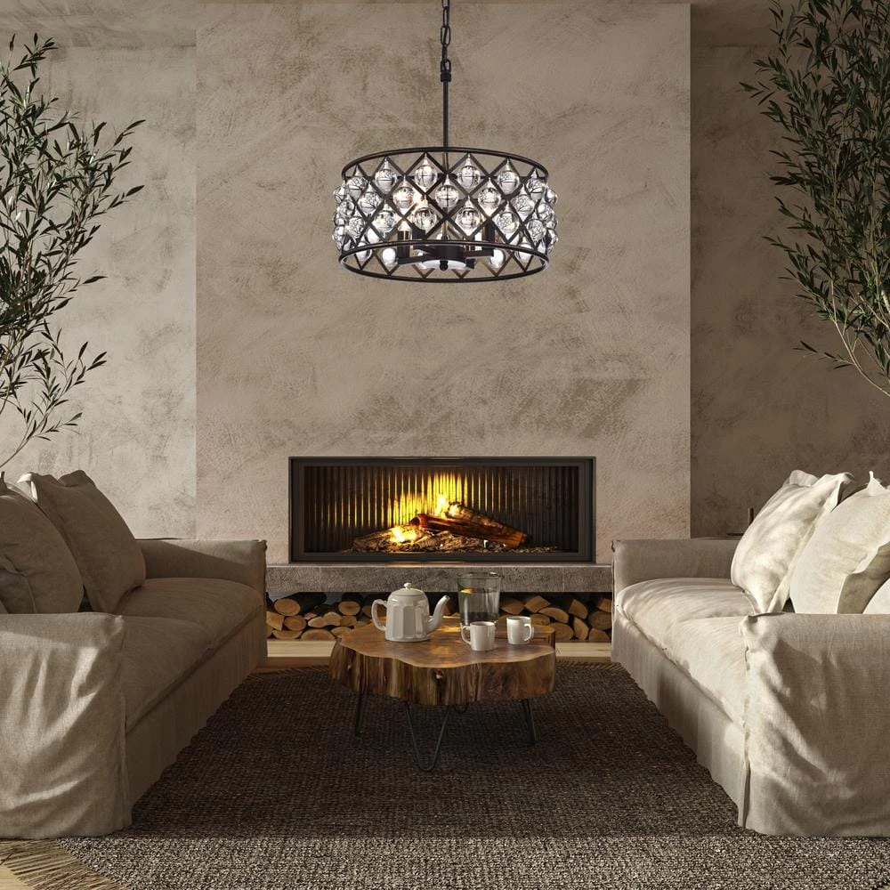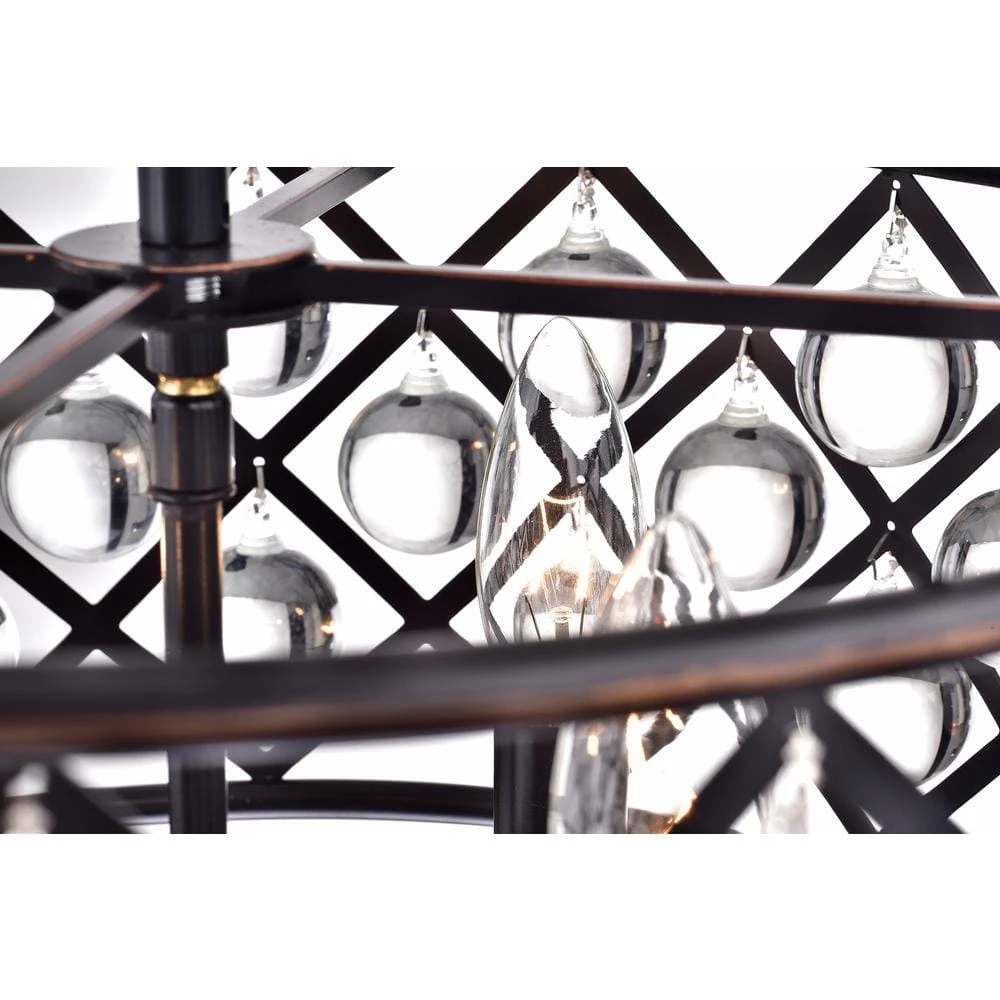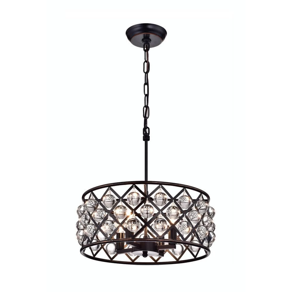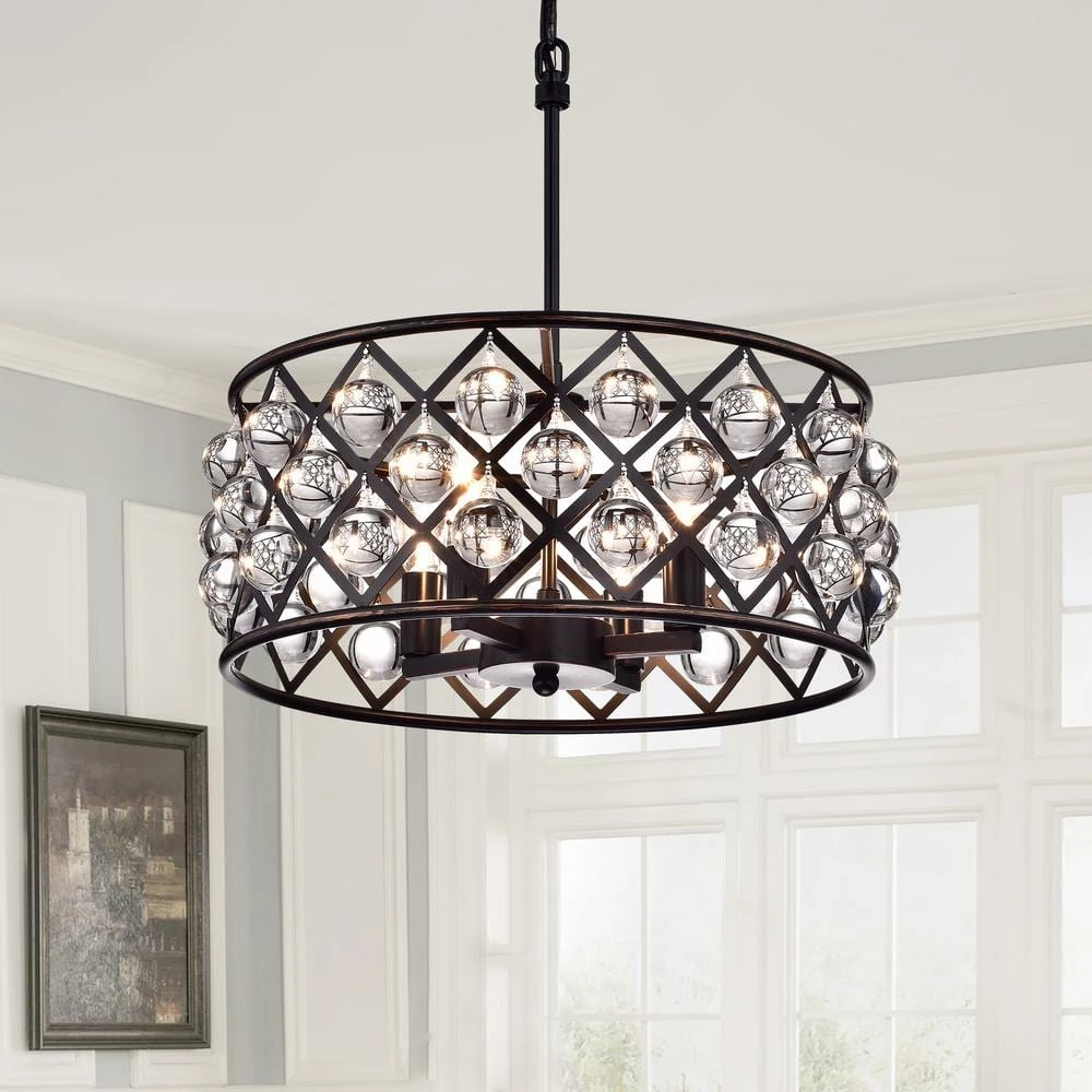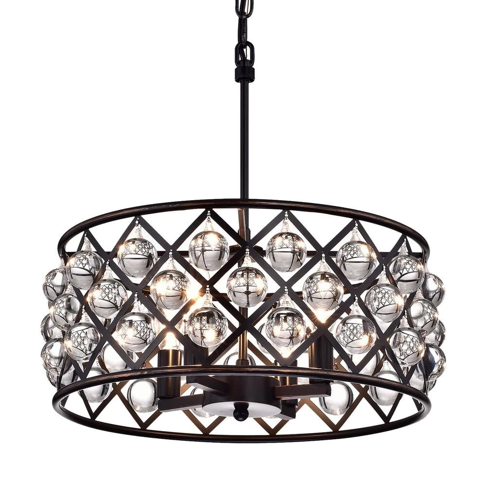 This ornate round chandelier is the picture of contemporary perfection. The spherical crystals of this drum chandelier drip down from its oil rubbed bronze latticed hardware. Another stunning piece in the Azha collection this crystal chandelier takes 4 candelabra style bulbs. The chain is 40 in. L and is adjustable.