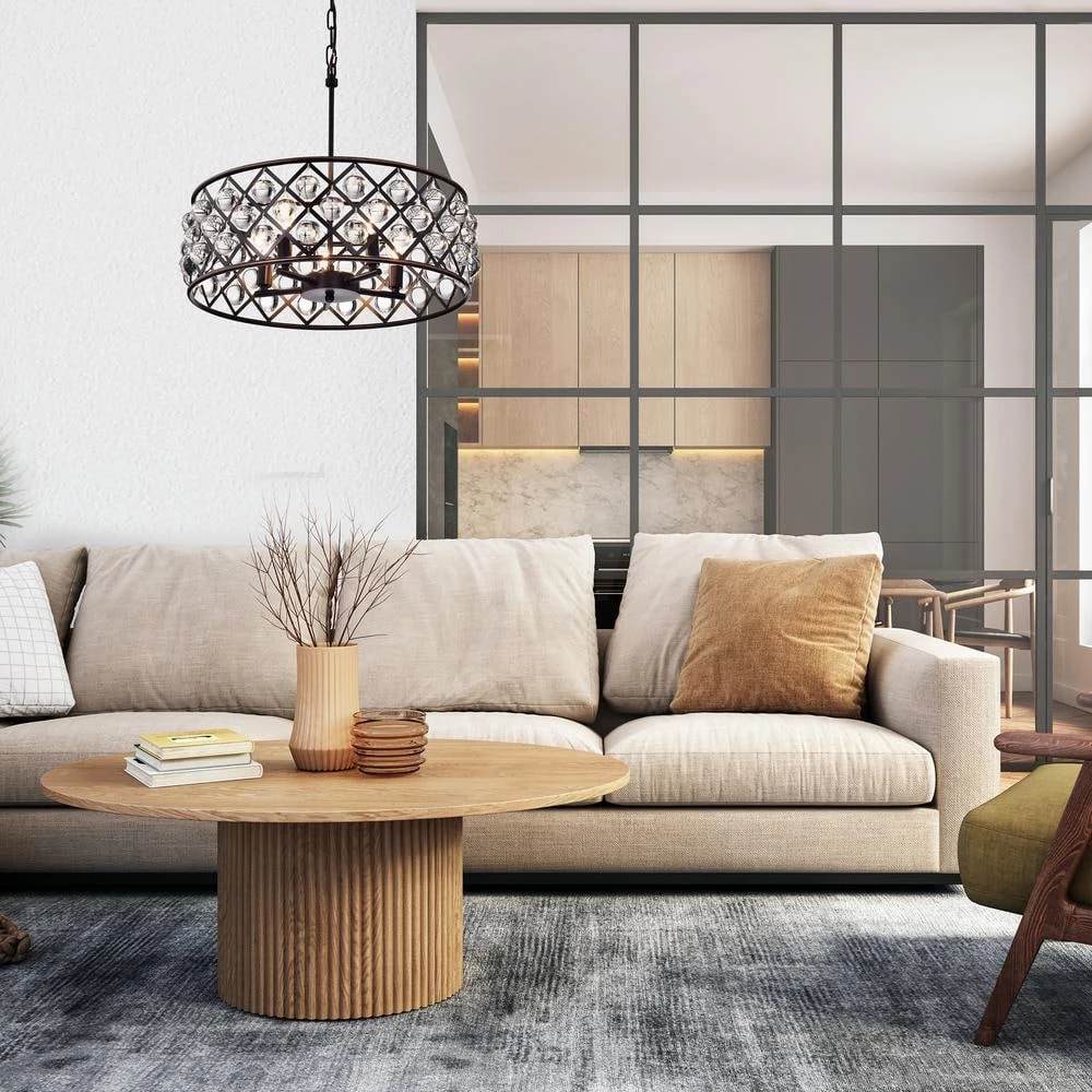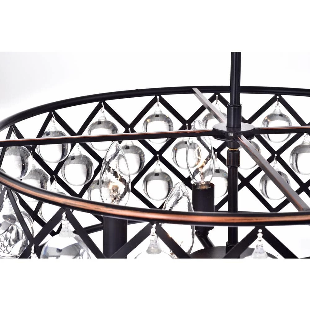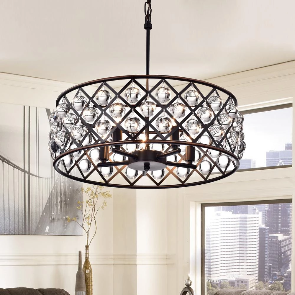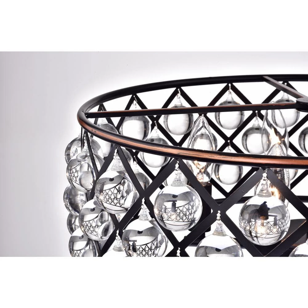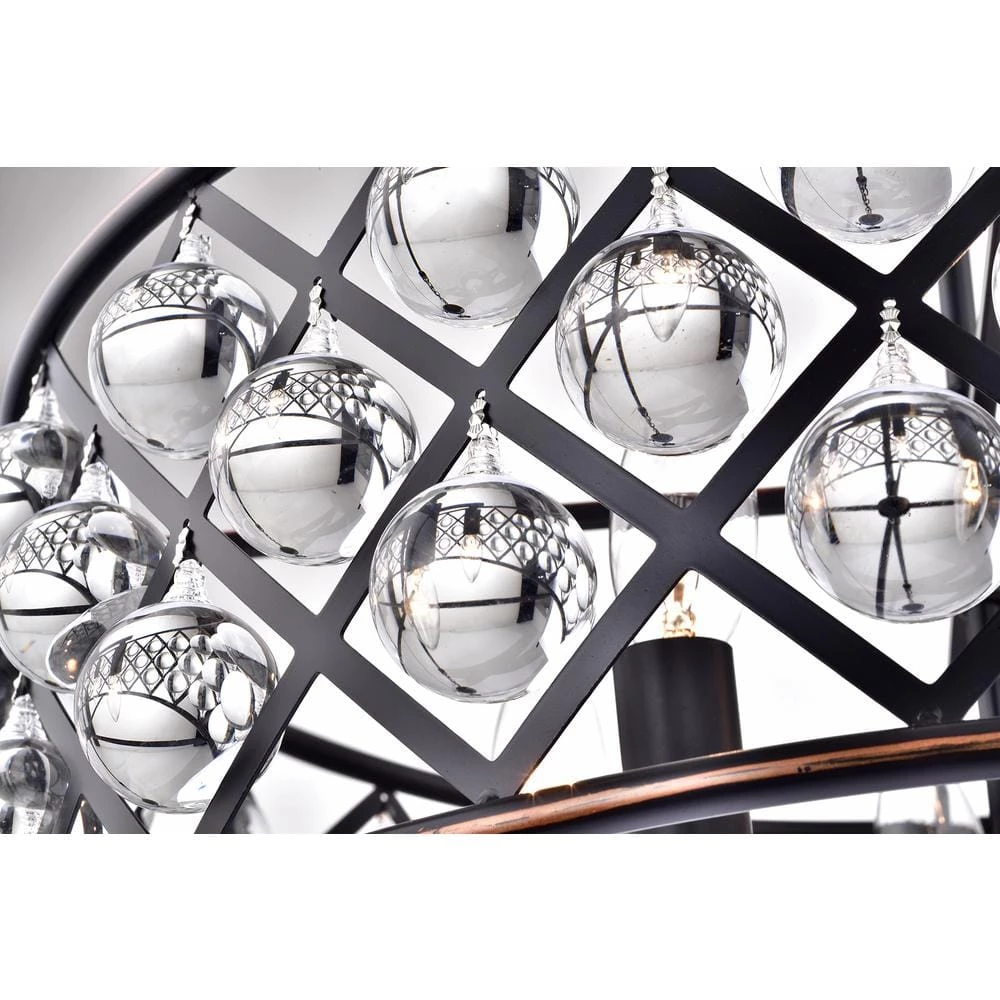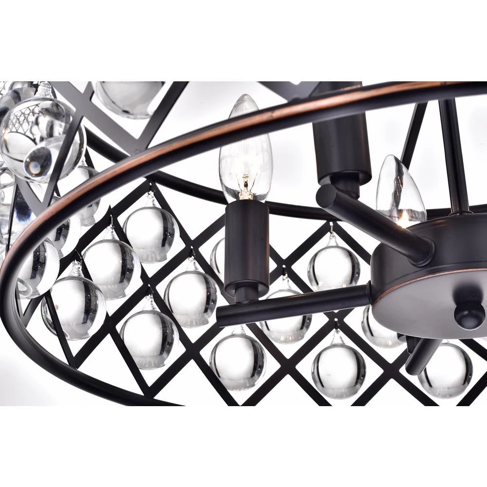 This ornate round chandelier makes a grand statement and is the picture of contemporary perfection. The spherical crystals of this medium chandelier drip down from its oil rubbed bronze latticed hardware. As the largest in the Azha collection, this stunning crystal chandelier takes 5 candelabra style bulbs. The chain is 40 in. L and is adjustable.