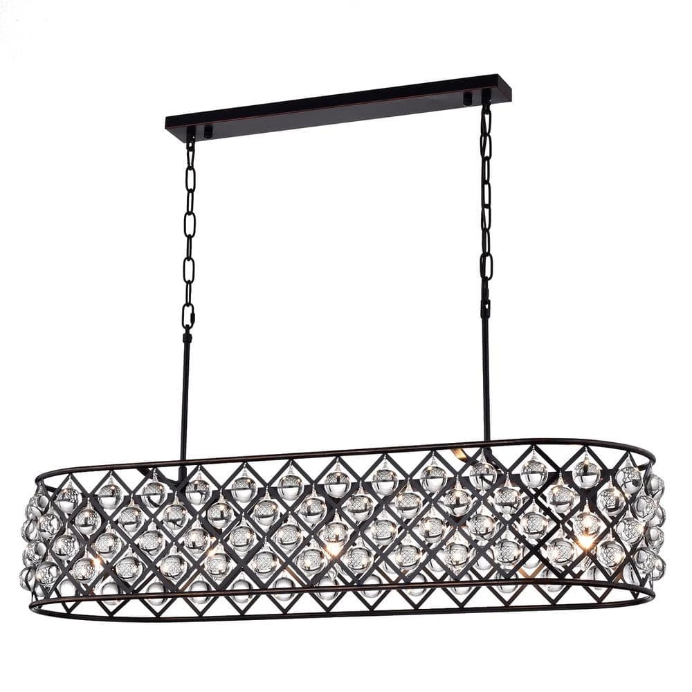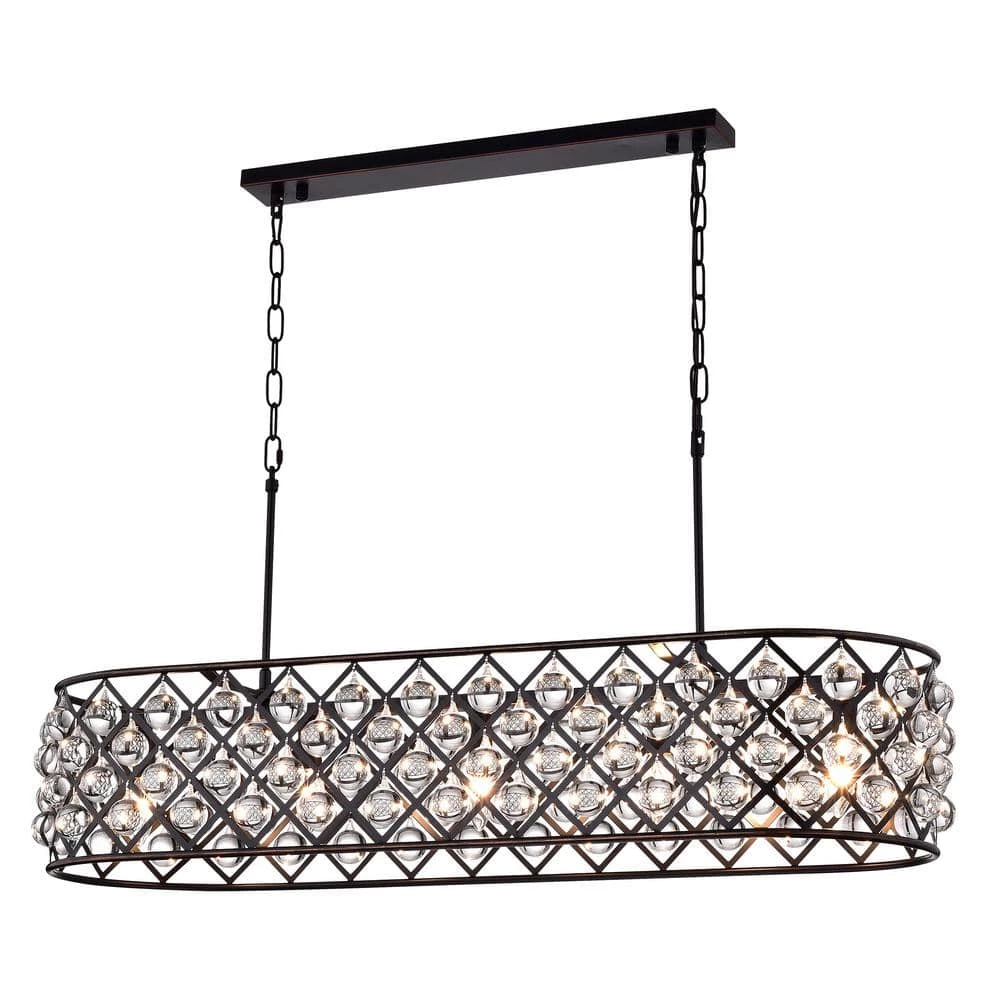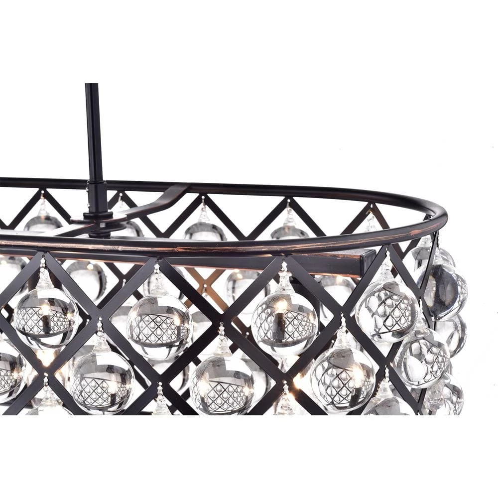 This beautifully opulent oval chandelier is the picture of contemporary perfection. The spherical crystals drip down from the oil rubbed bronze latticed hardware of this island chandelier. Another stunning piece in the Azha collection, this dining room chandelier takes 5 candelabra style bulbs. The chain is 39 in. L and is adjustable.