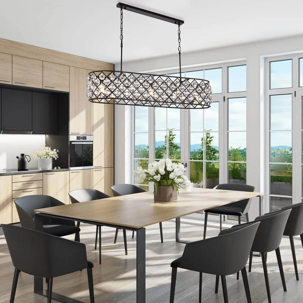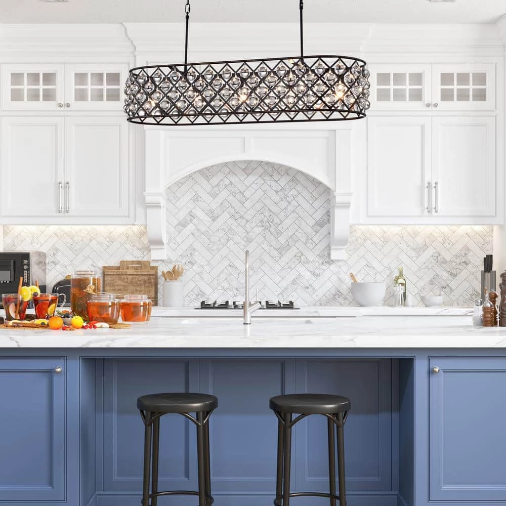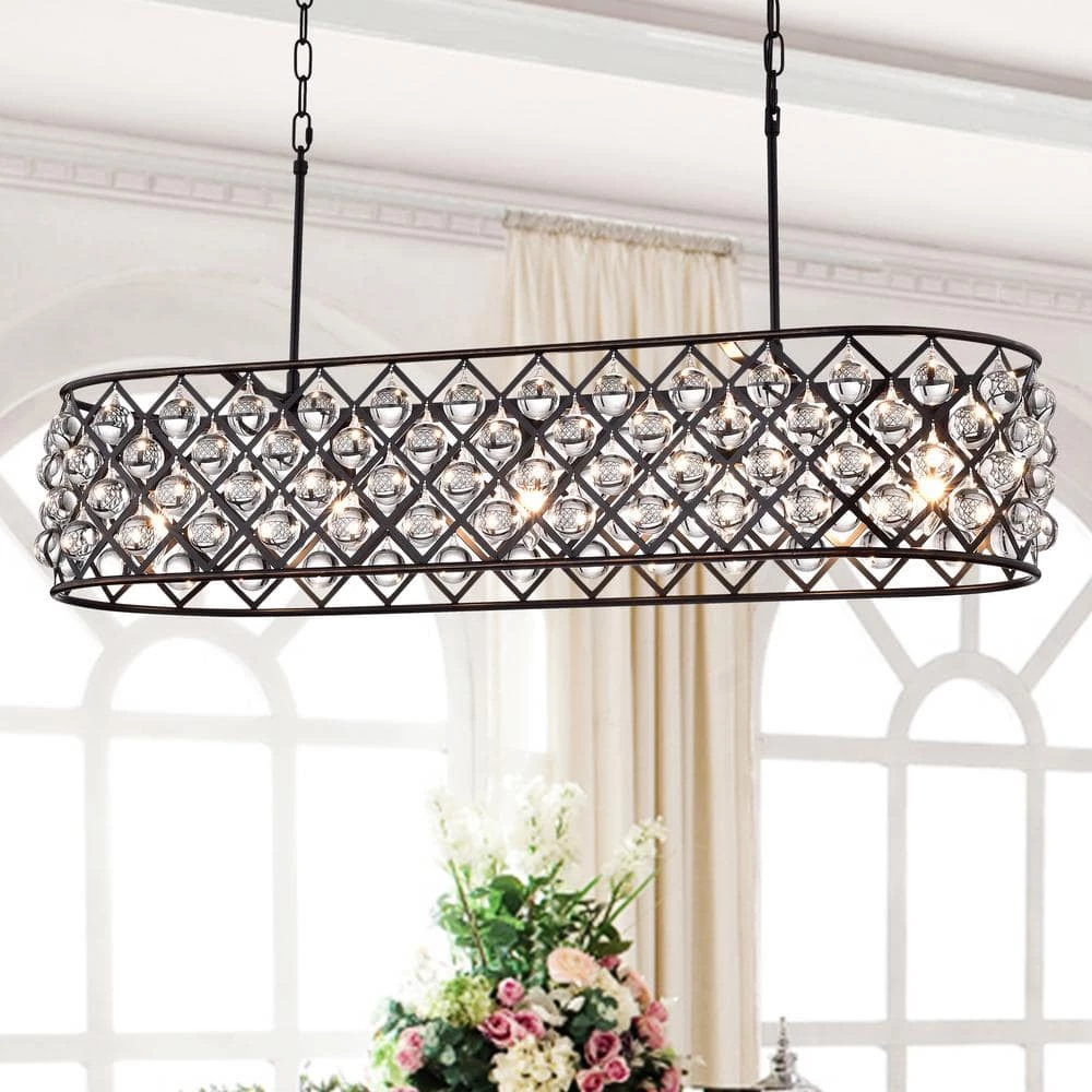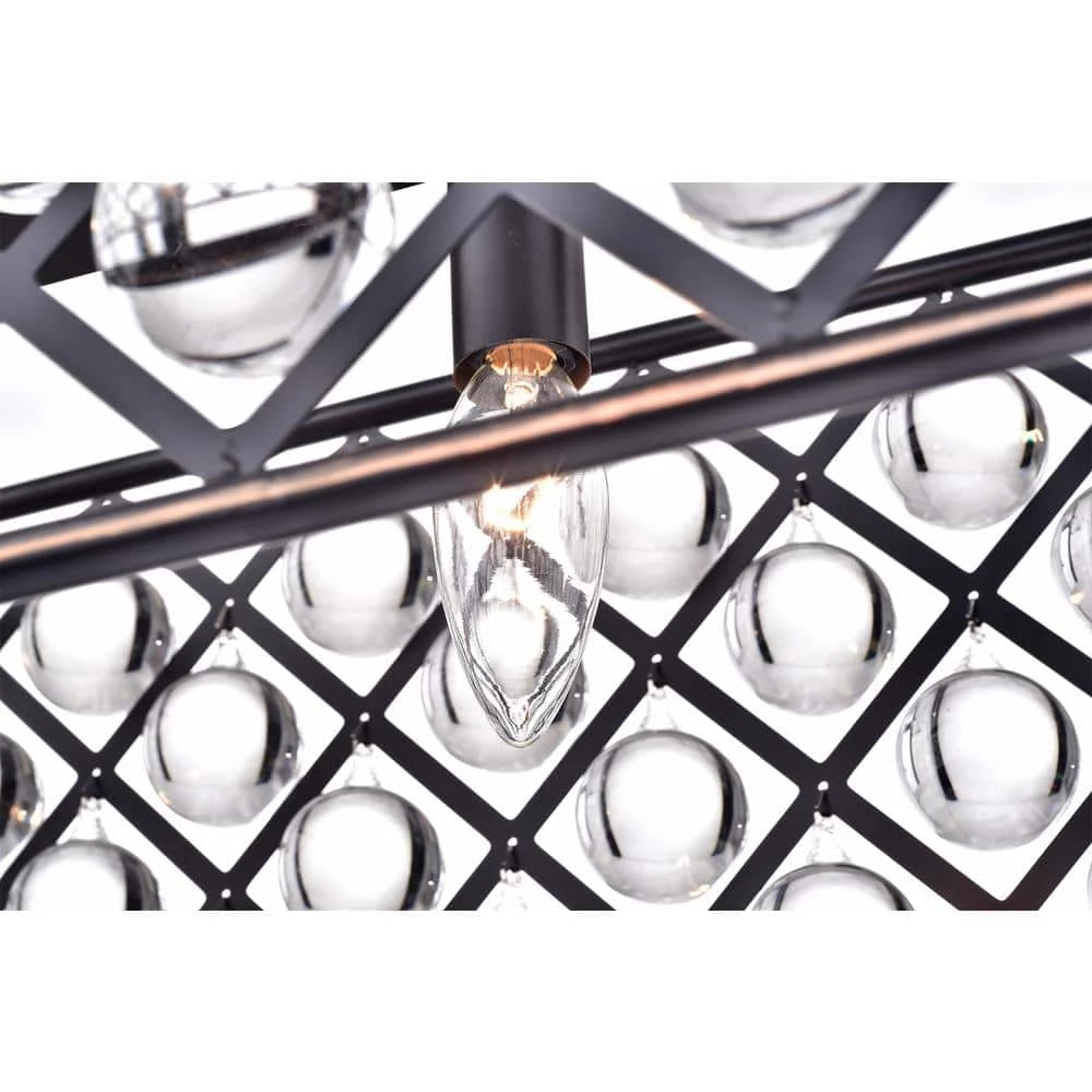 This beautifully opulent oval chandelier is the picture of contemporary perfection. The spherical crystals drip down from the oil rubbed bronze latticed hardware of this island chandelier. Another stunning piece in the Azha collection, this dining room chandelier takes 5 candelabra style bulbs. The chain is 39 in. L and is adjustable.