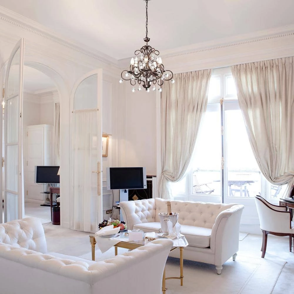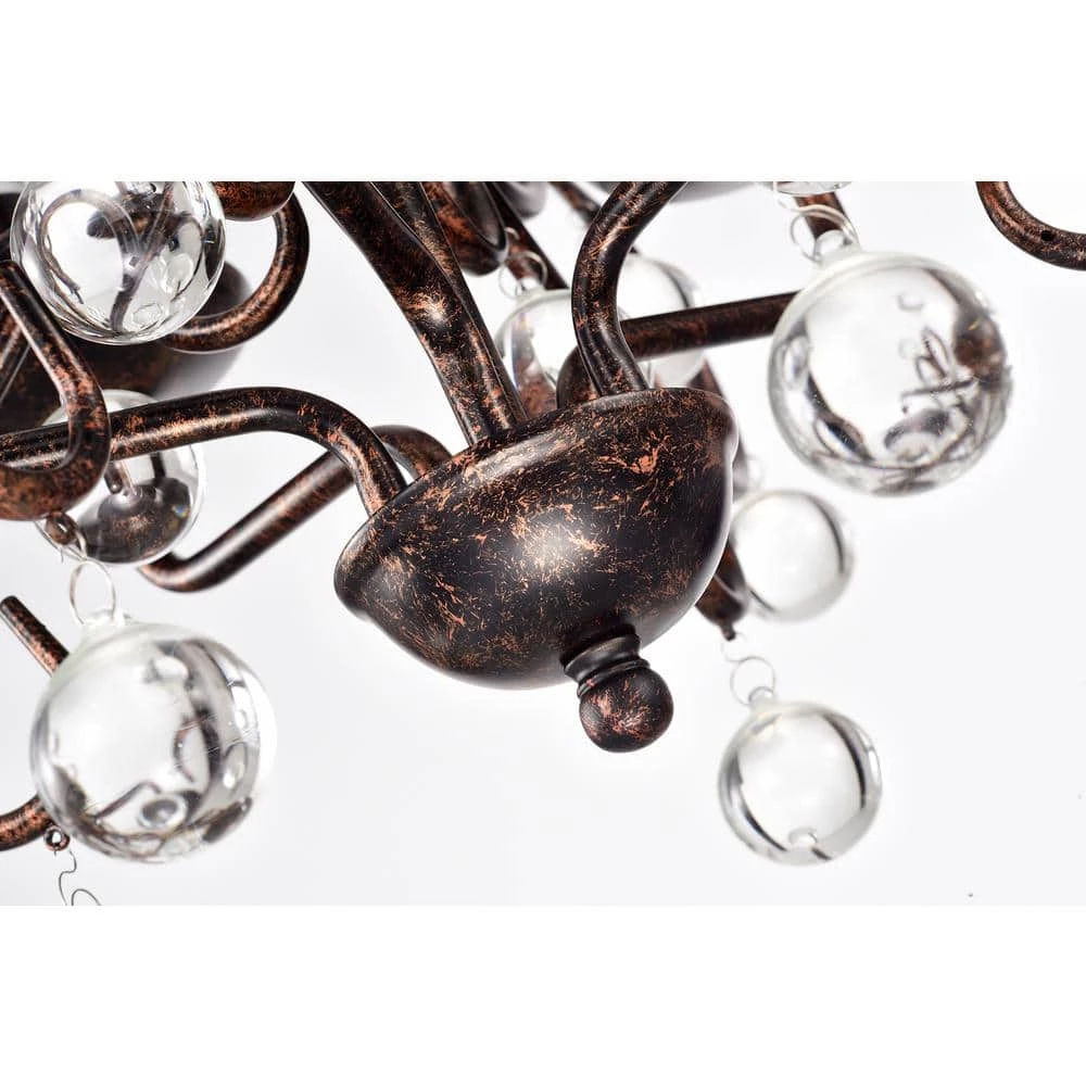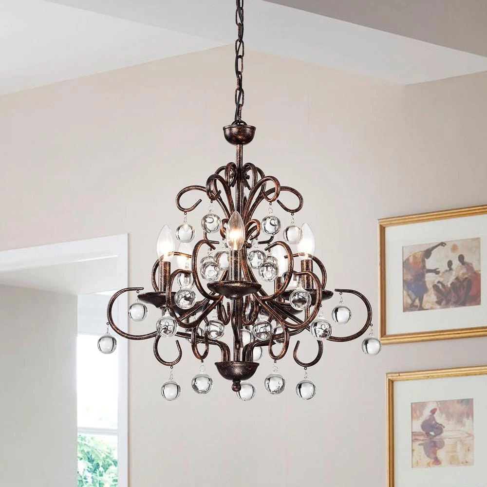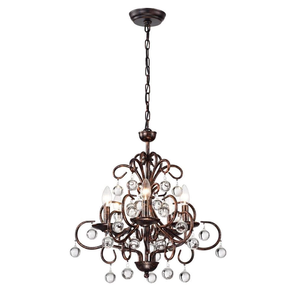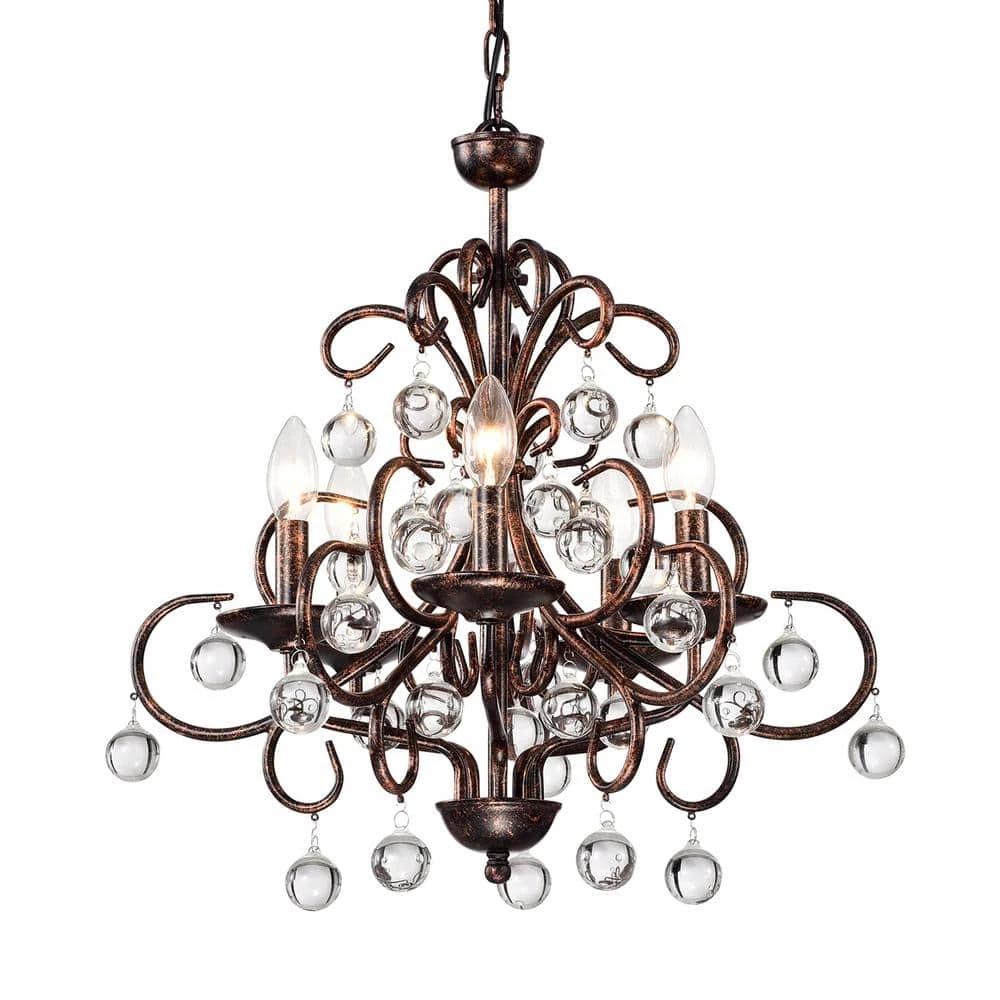 Curved antique copper tendrils drip with smooth crystal globes on this fabulous classic chandelier. This crystal chandelier features 5 candelabra style bulbs that emit light onto the crystals that drip from the beautiful curved antique copper metal. This bronze chandelier includes an adjustable 39-in. chain makes this piece a perfect choice for your home.