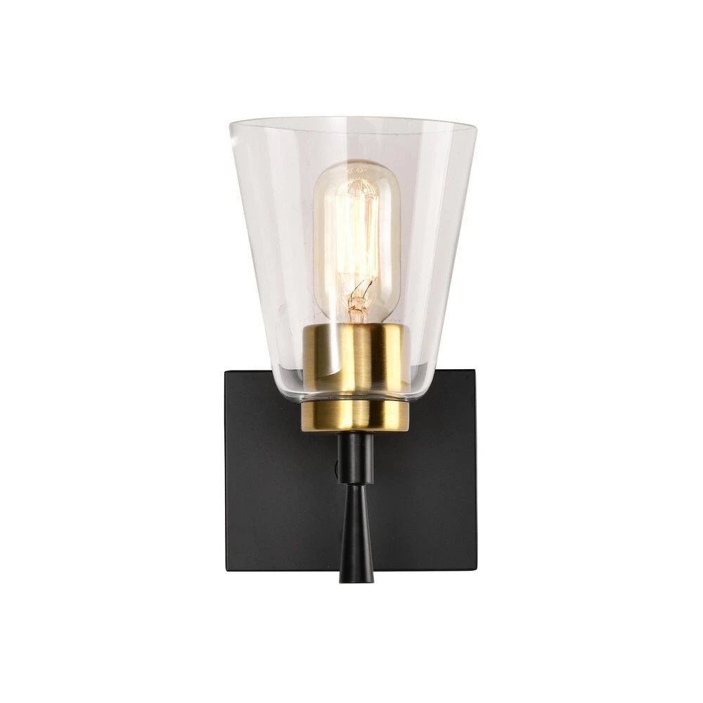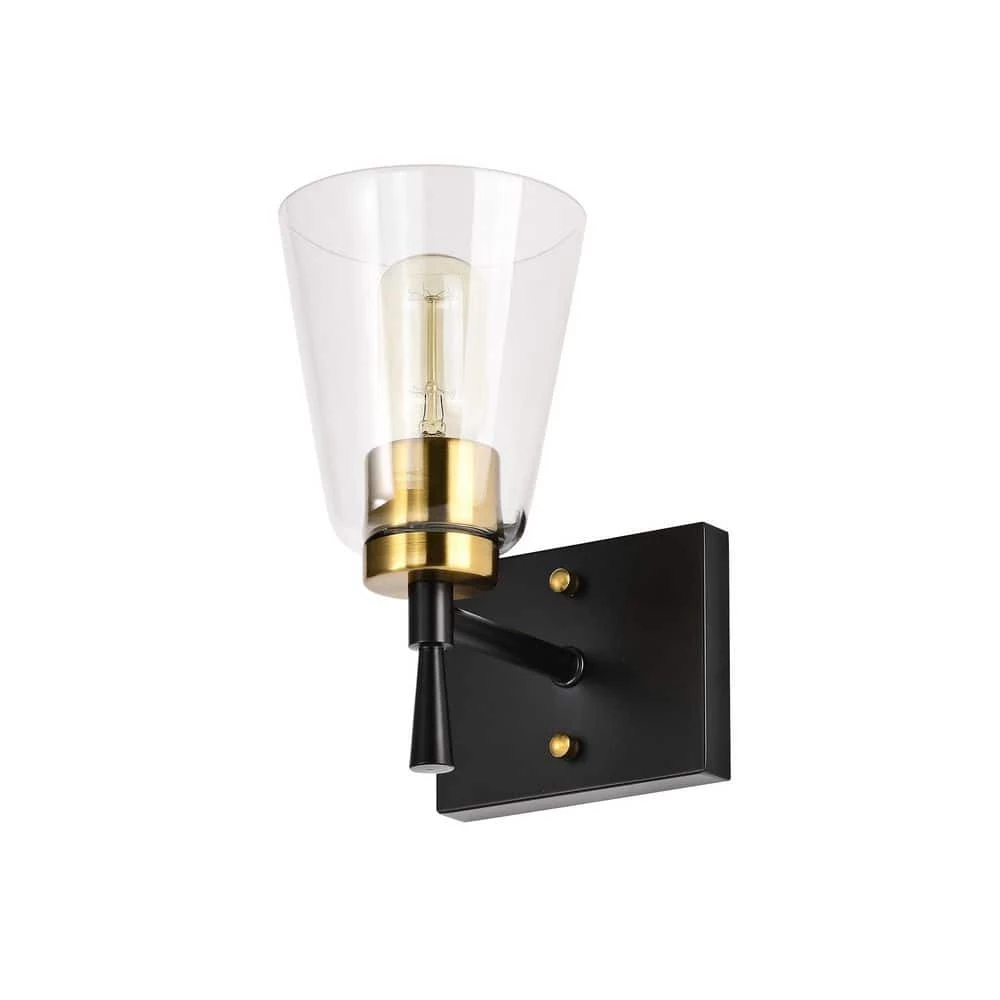 Decorate your home with the smooth finishes and classic silhouette of this elegant 1 light wall sconce. The black and antique brass finishes complement each other perfectly while supporting the clear glass shade. The stem holding the bulb socket and antique brass screws on the wall plate are subtle details that heighten the quality of this wall light. Place this wall sconce in the bathroom, hallway, living or bedroom to transform your space with contemporary style.