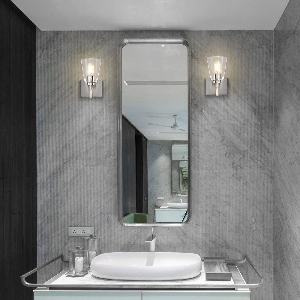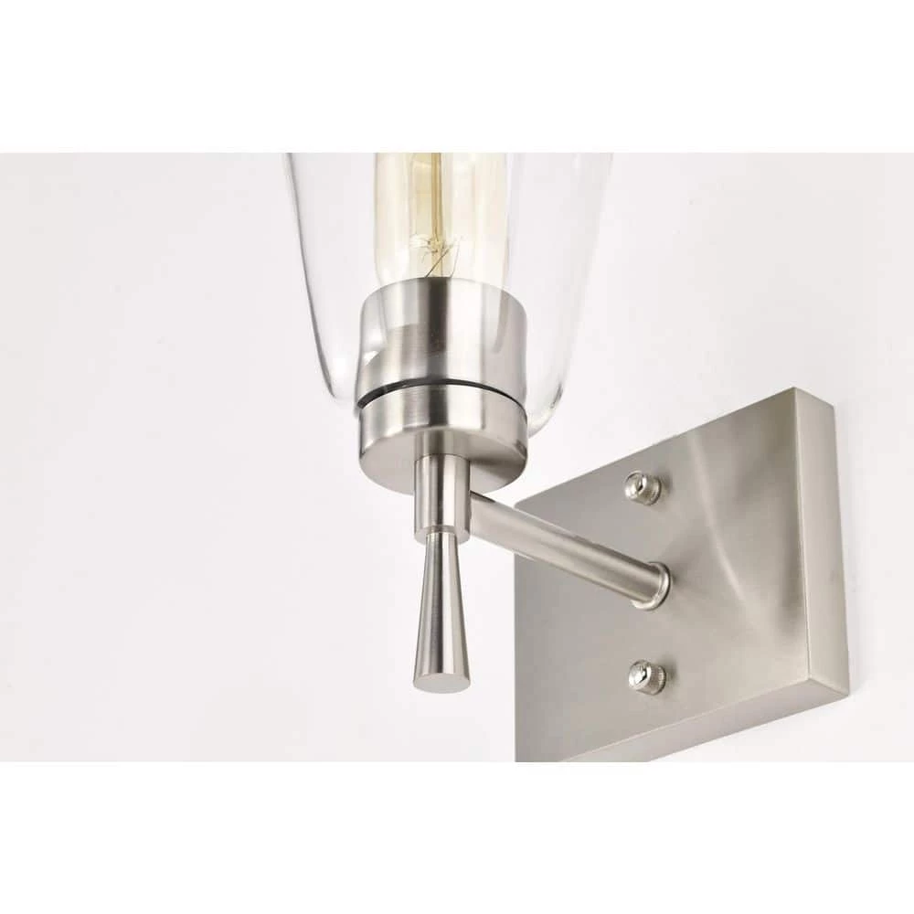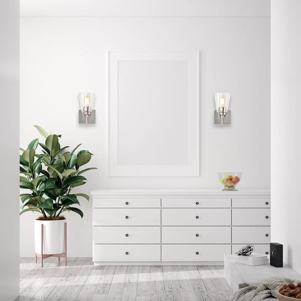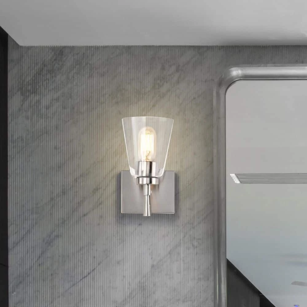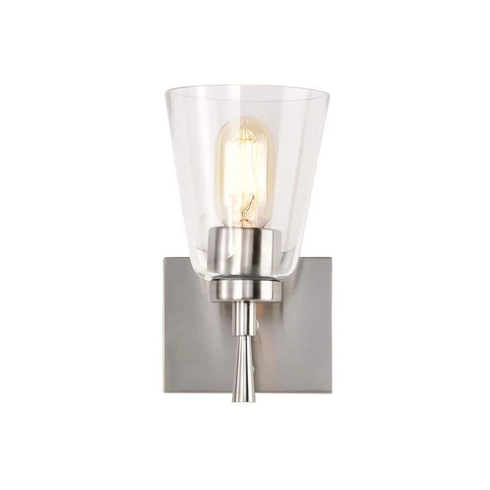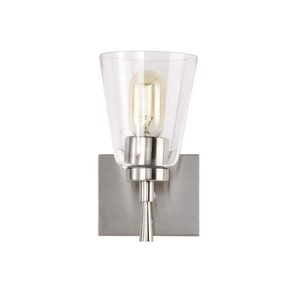 This 1 light brushed nickel wall sconce combines modern finishes with simplicity to form this timeless piece. An elegant stem supports the E26 bulb sleeve that peeks through under the clear glass shade. Place this wall light in the hallway, bathroom, living or bedroom as a stylish, yet abundant light source.
