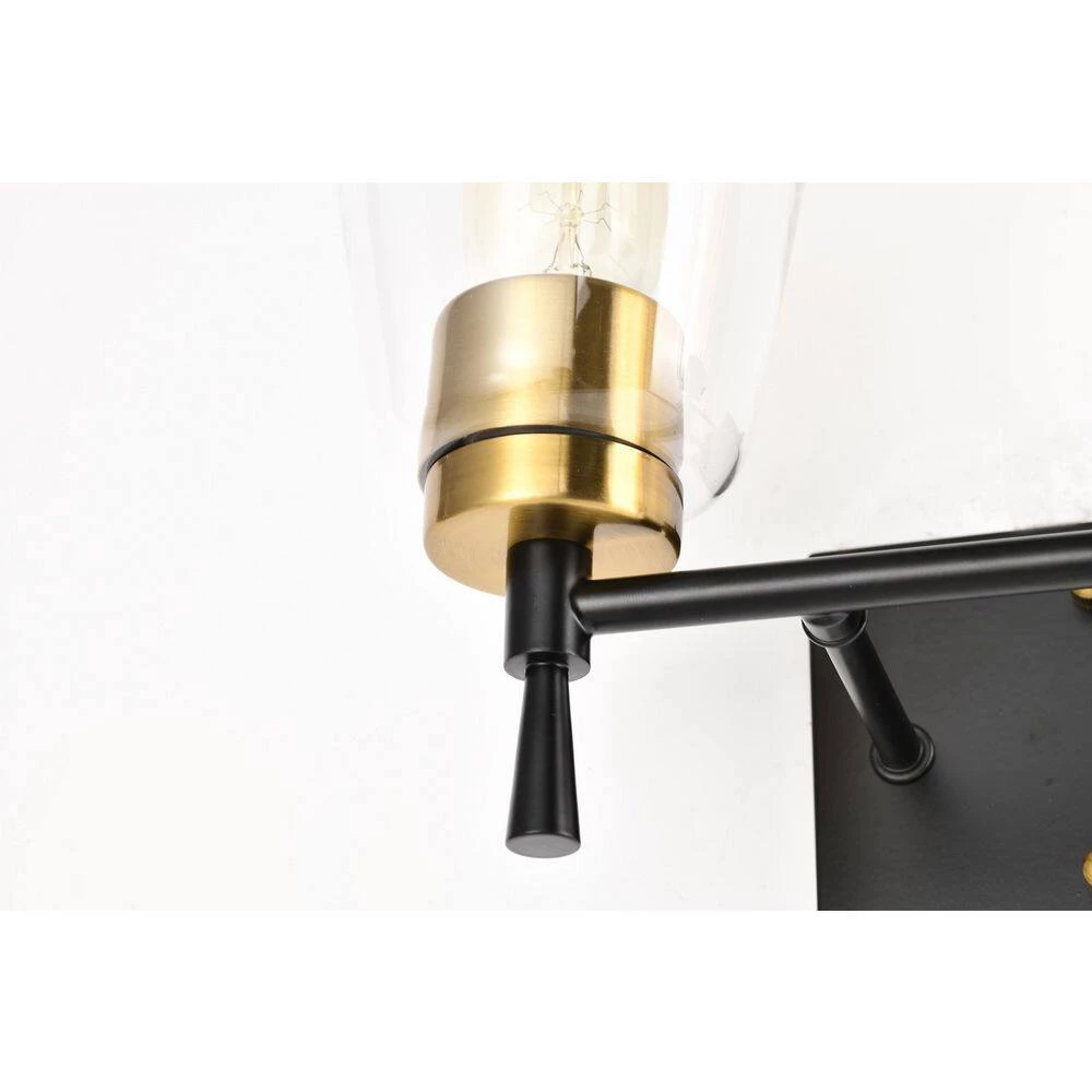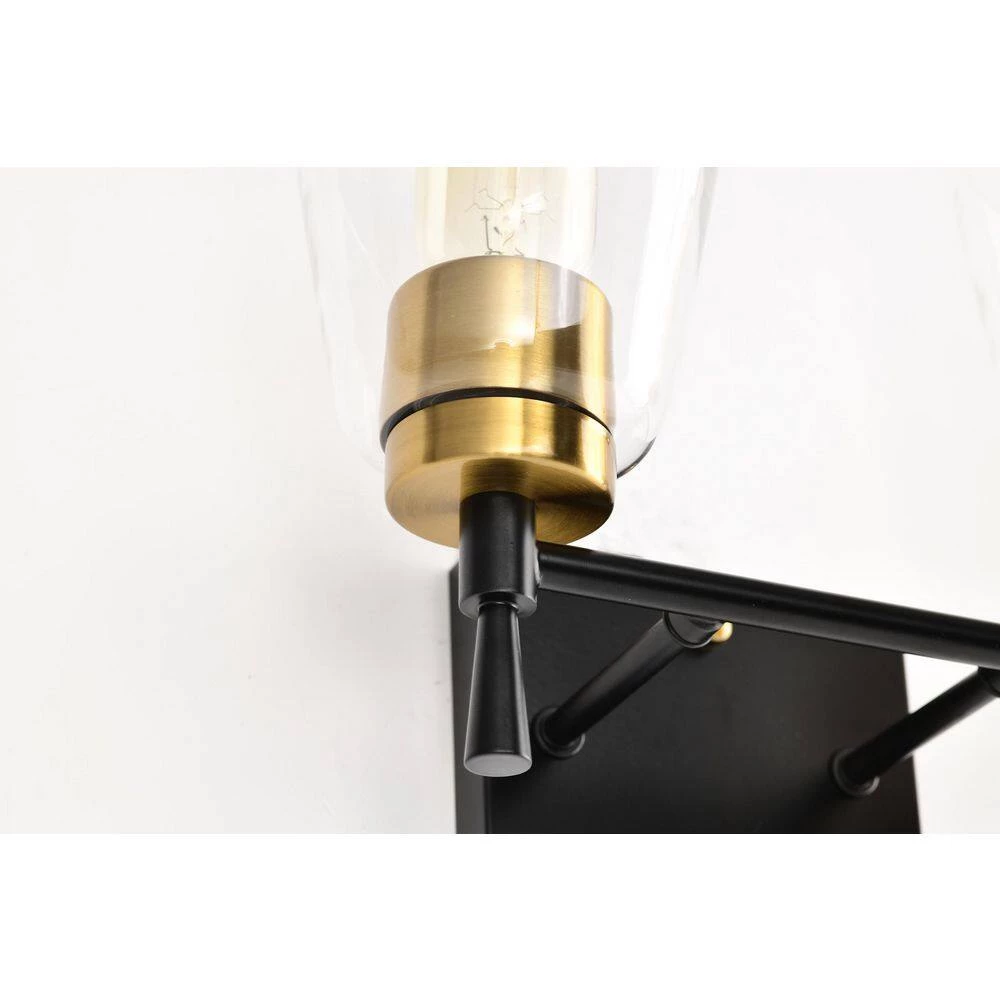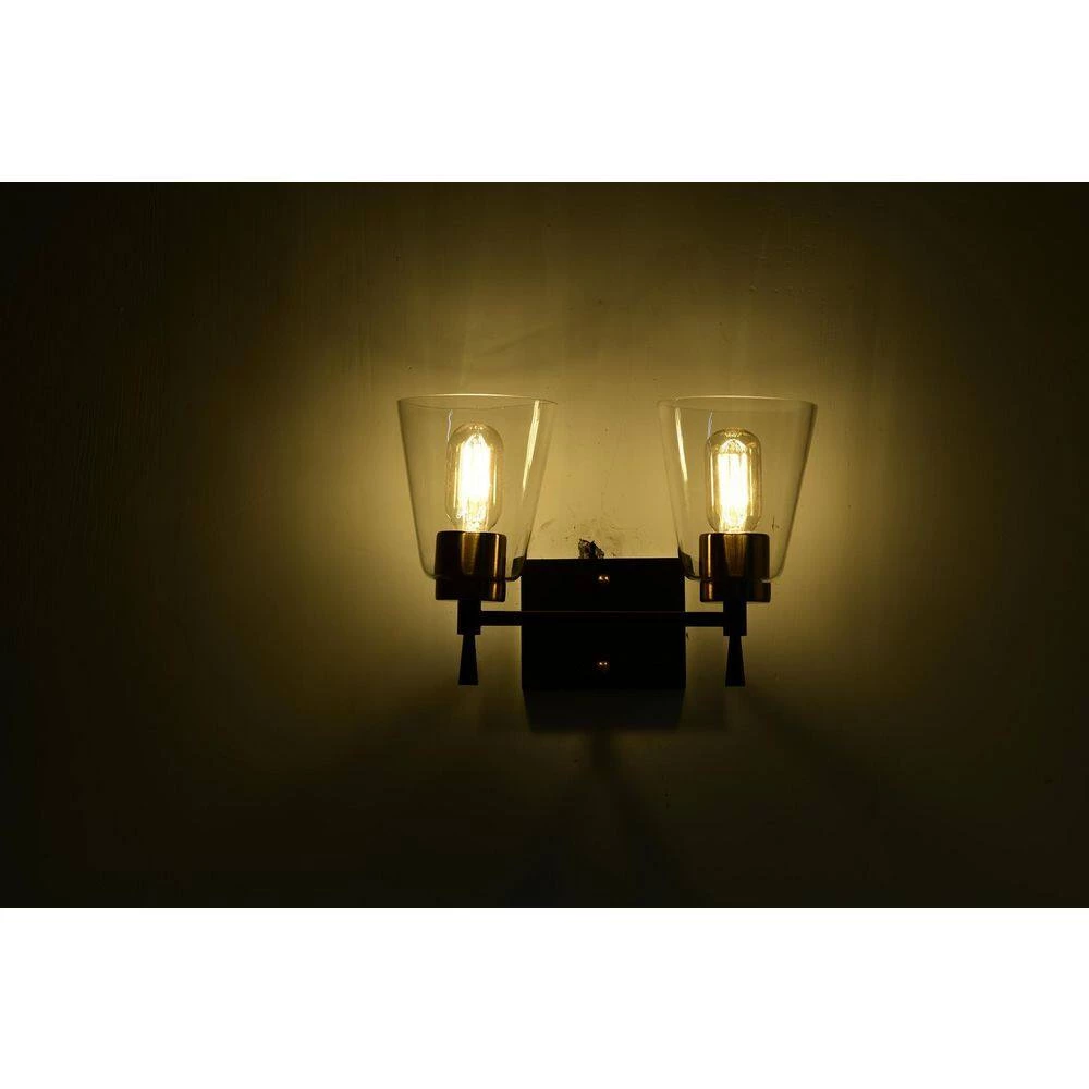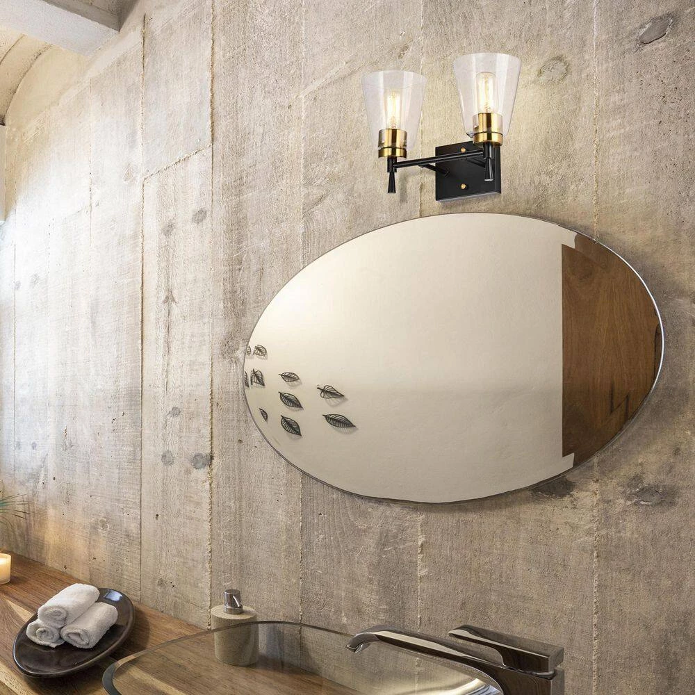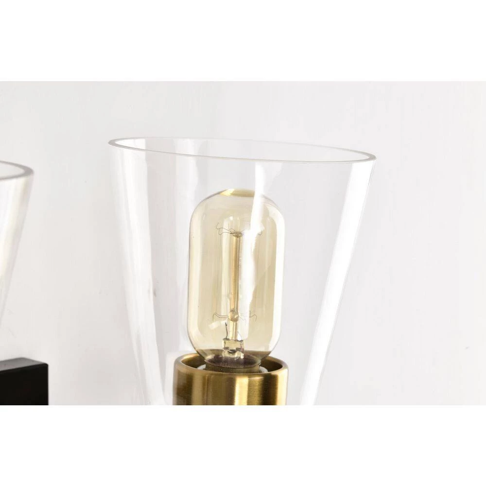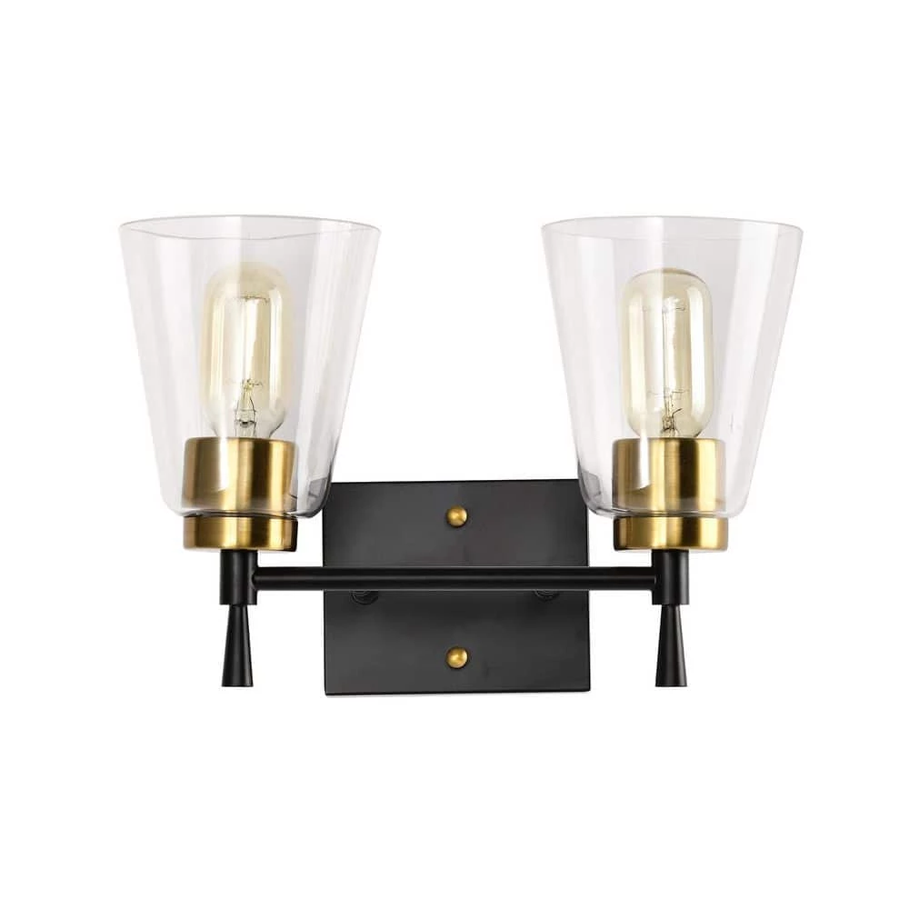 Bold finishes combine with fine details to create the elegant Briarwood 2 light vanity. This vanity light features a clean black finish that beautifully contrasts against the antique brass hardware. The clear glass cone shades allow light from 2 E26 base bulbs not included to shine through while showcasing the fine bulb sleeves underneath. Place this vanity light above the bathroom sink, hallway, living room or bedroom to accent and illuminate any room. We recommend adding a dimmer switch with dimmable bulbs to adjust the lighting accordingly.