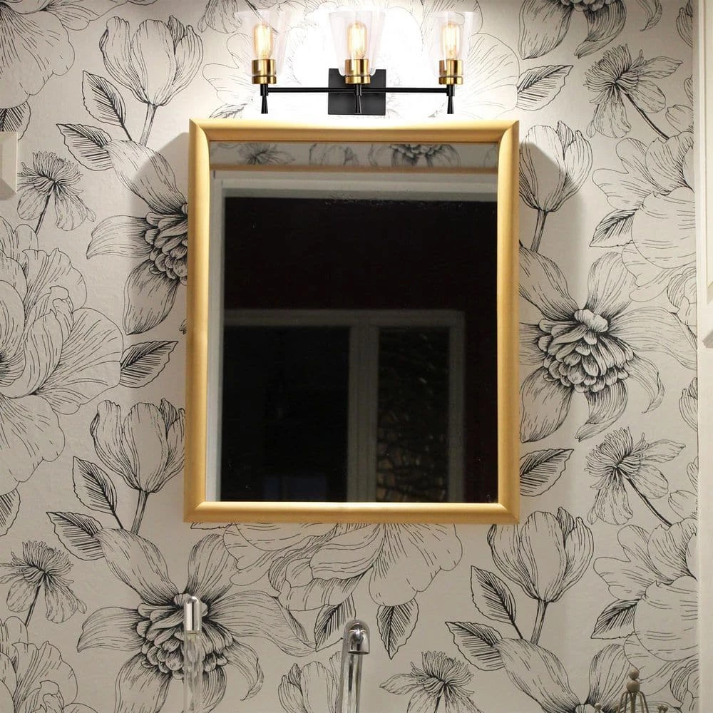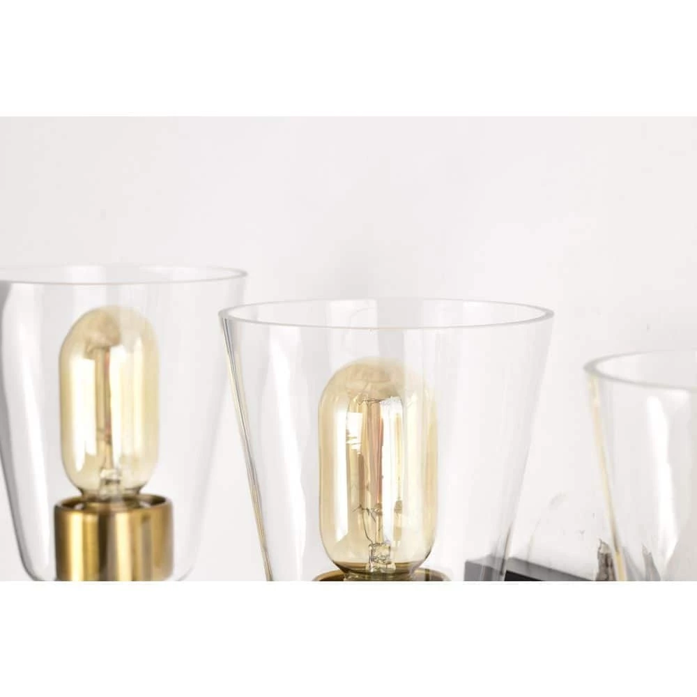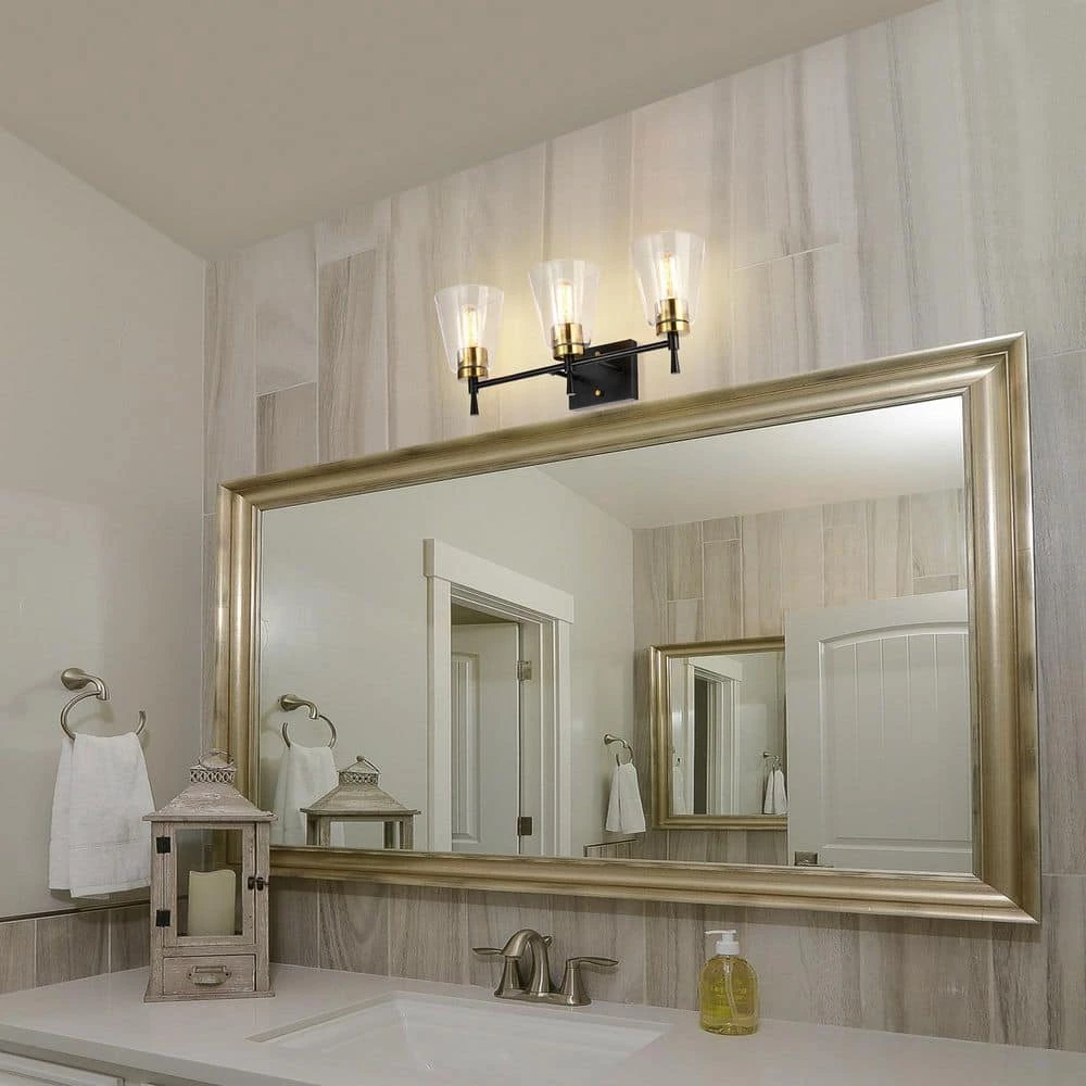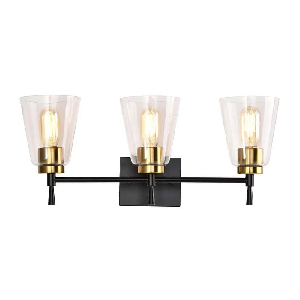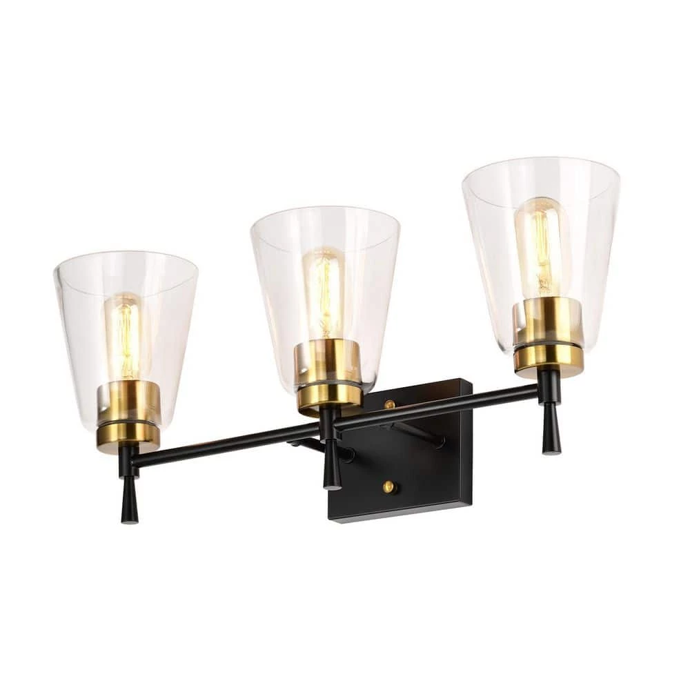 The Briarwood 3 light vanity graces the home with contemporary finishes and classic, yet updated silhouettes. Design elements such as the elegant tapered stems and contrasting black and antique brass finishes make this vanity light unique and visually appealing. The clear glass shades allow plenty of light to shine through while showcasing the fine hardware underneath. Place this vanity light above the bathroom sink, hallway, living room, or bedroom to accent and illuminate your home. We recommend adding a dimmer switch and dimmable to adjust the lighting accordingly.