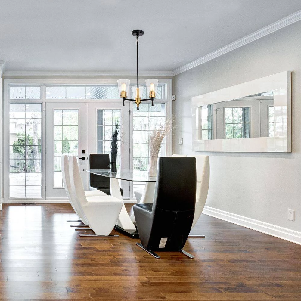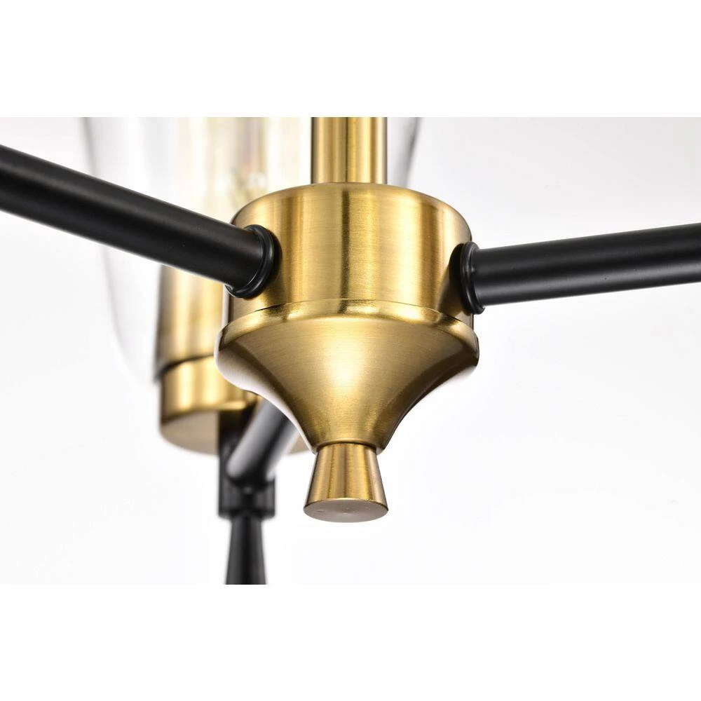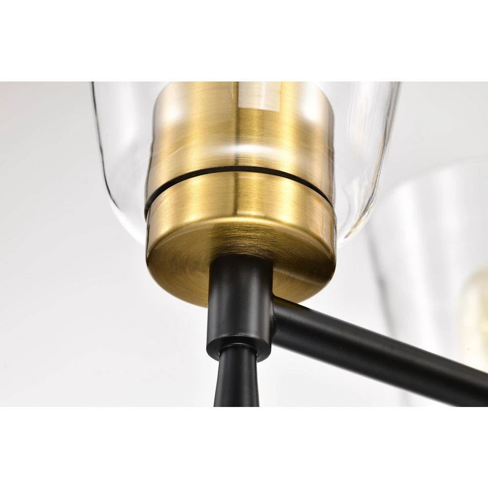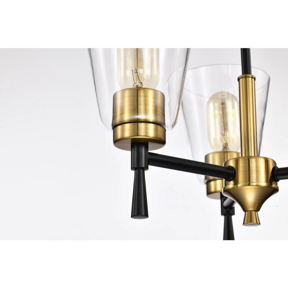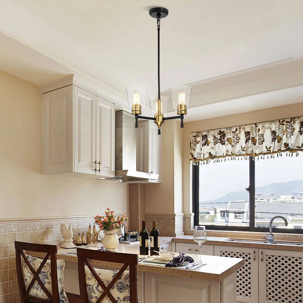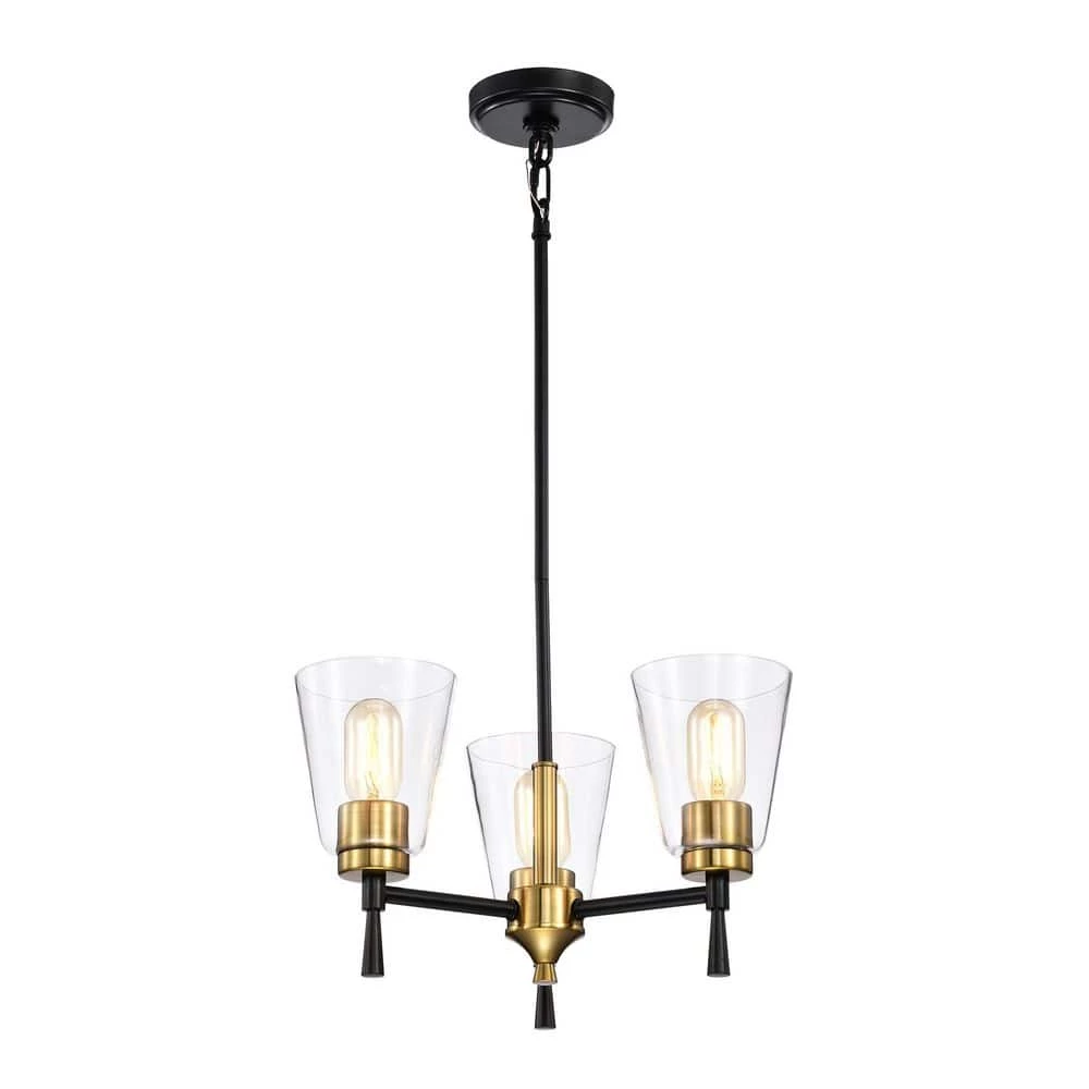 The contrast of the black and antique brass finishes add drama to this 3 light chandelier. The clear glass shades allow ample light to shine through from the three E26 bulbs (not included). Place this chandelier above the kitchen island, or dining room to instantly update the room. This timeless light fixture comes with three 12 in. and one 6 in. rod that may be used separately or all together to suit a variety of ceiling heights and room sizes.