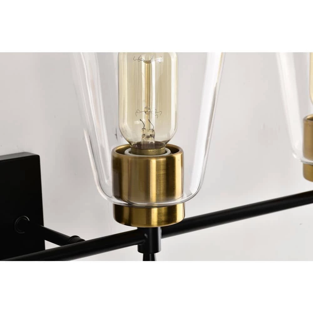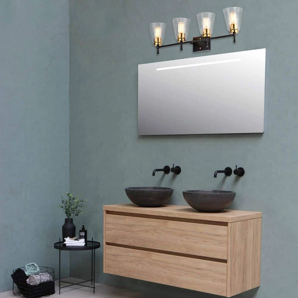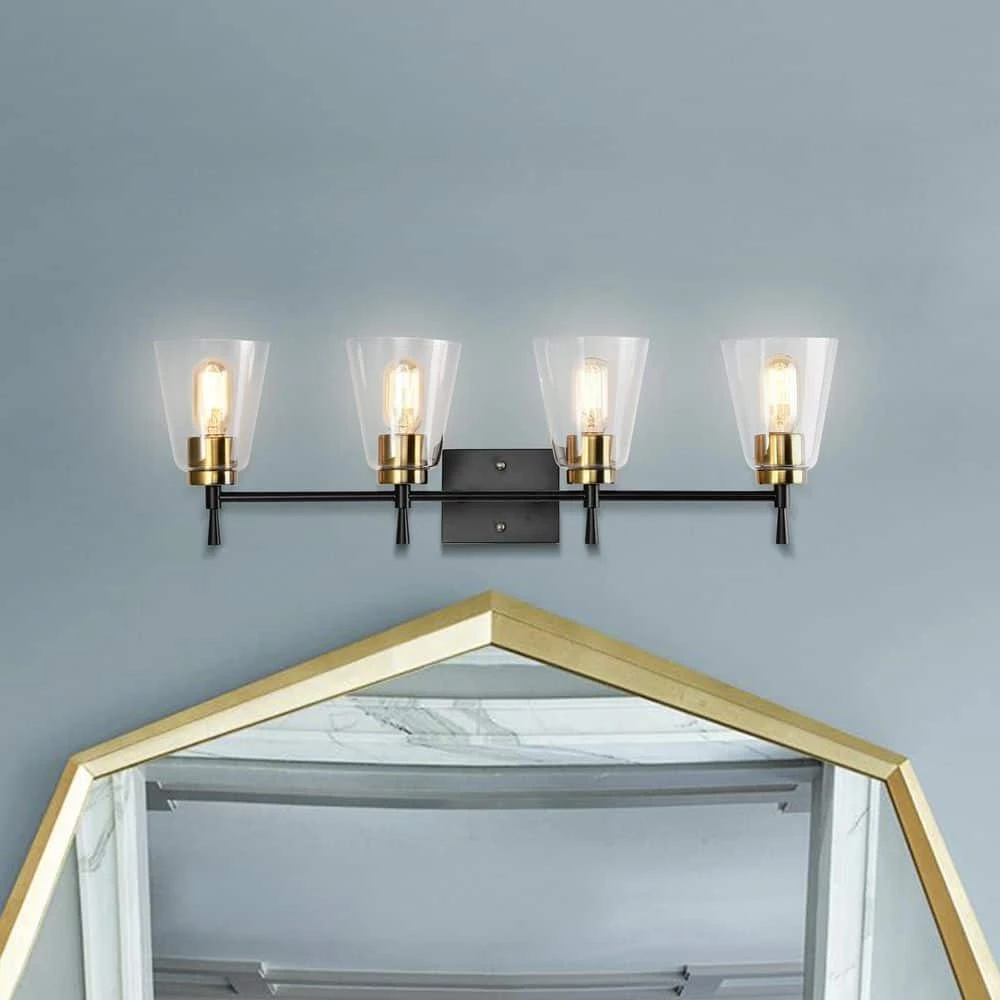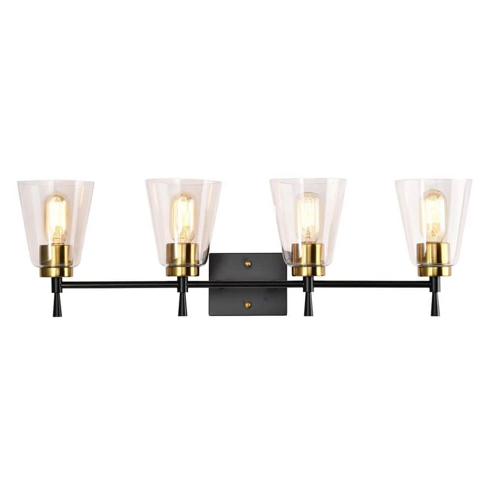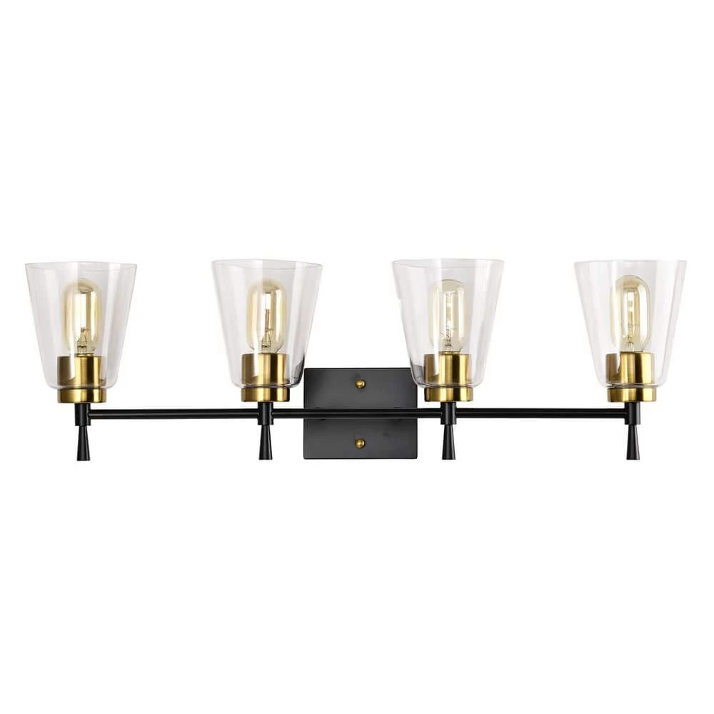 The vibrant hues and fine details of this Briarwood 4 light vanity illuminate your space in contemporary style. This vanity features elegant tapered stems that support four E26 base bulbs (not included) housed in a beautiful antique brass sleeve. The cone shaped clear glass shades allow plenty of light to shine through while allowing the hardware design to peek through. Place this vanity above the bathroom mirror, hallway, living room, or bedroom to accent and illuminate any room. We recommend adding a dimmer switch and dimmable bulbs to adjust the light accordingly.