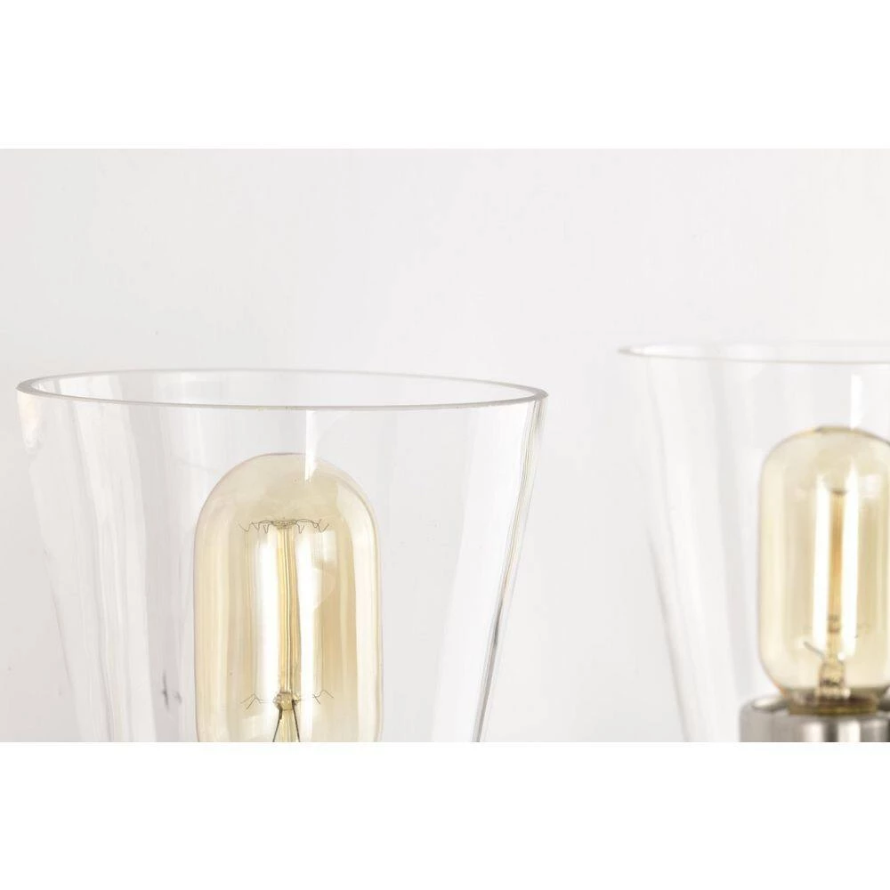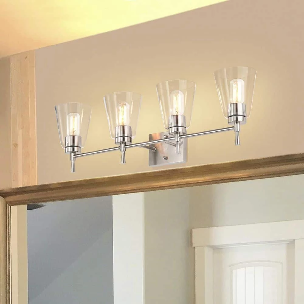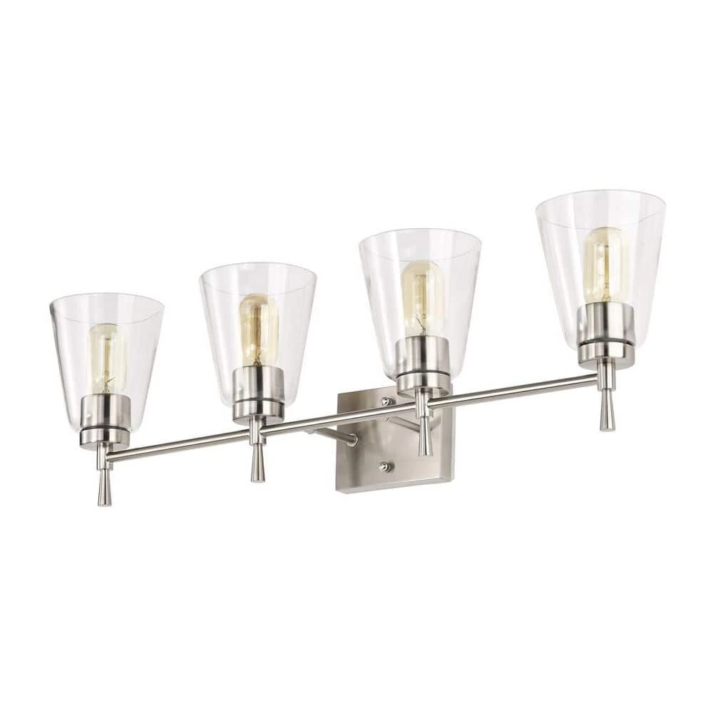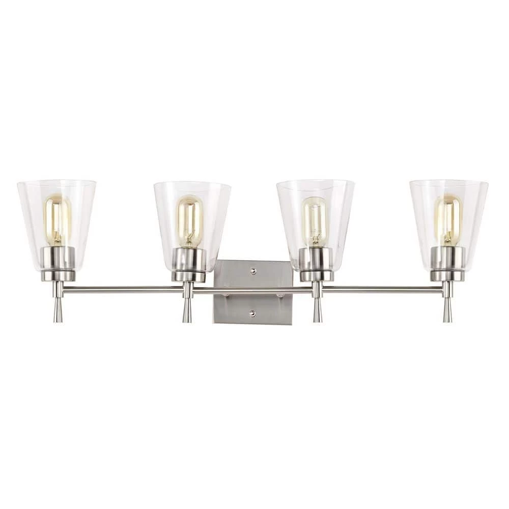 The Briarwood 4 light vanity exudes elegance with its clean lines and subtle details. This vanity light features finely tapered stems that support four E26 bulbs (not included) in a shiny brushed nickel finish. The tapered style extends to the cone shaped clear glass shades that allow plenty of light to shine through while revealing the beautiful hardware underneath. Place this light above the bathroom mirror, hallway, living room, or bedroom to accent and illuminate any room. We recommend adding a dimmer switch with dimmable bulbs to adjust the light accordingly.