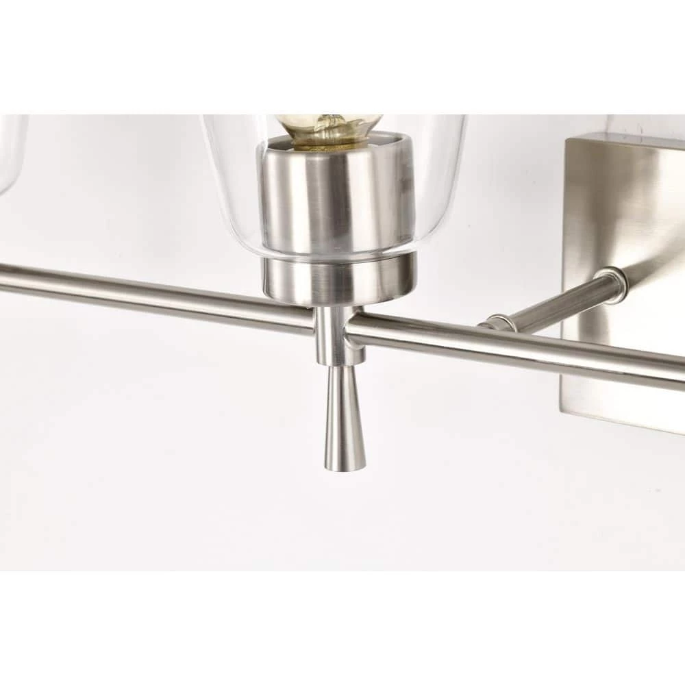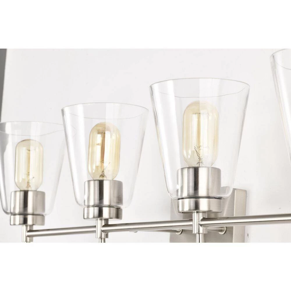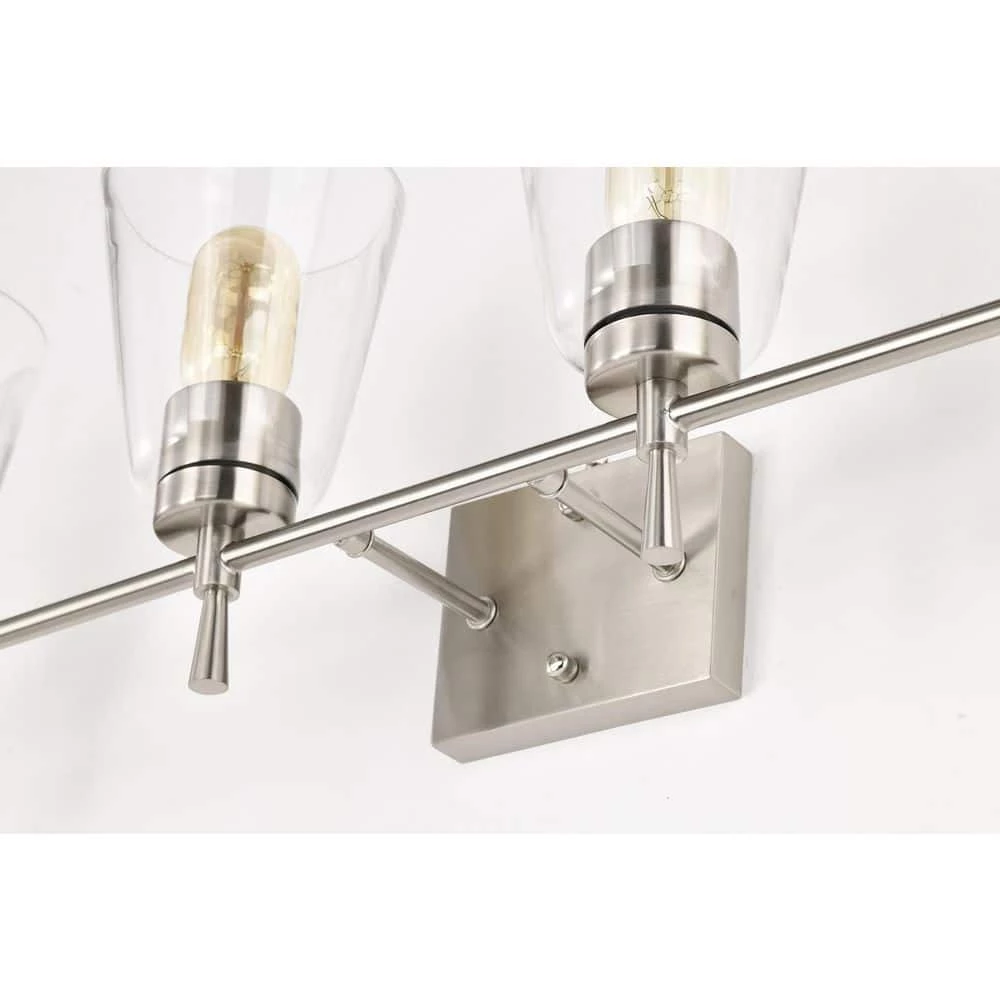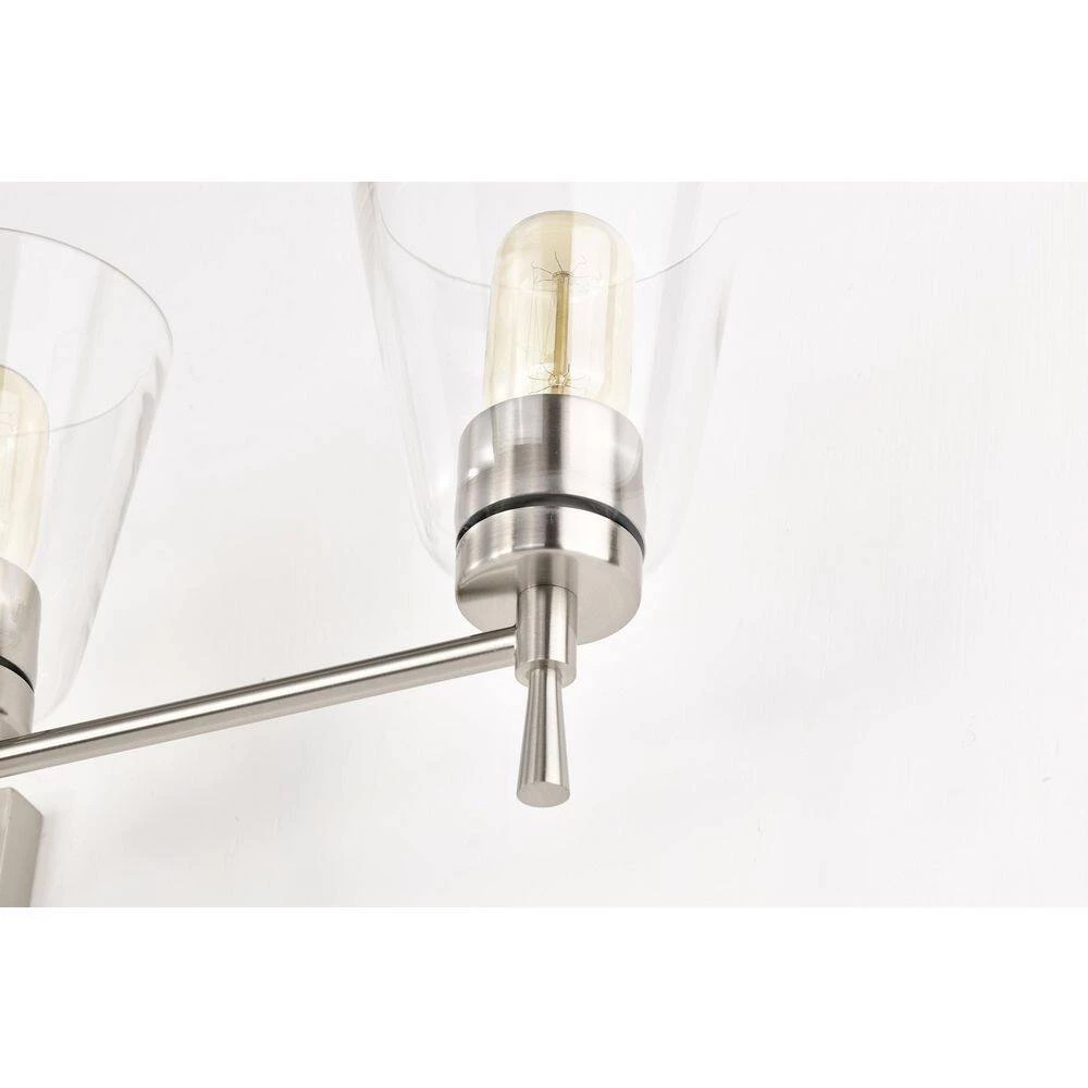 The Briarwood 4 light vanity exudes elegance with its clean lines and subtle details. This vanity light features finely tapered stems that support four E26 bulbs (not included) in a shiny brushed nickel finish. The tapered style extends to the cone shaped clear glass shades that allow plenty of light to shine through while revealing the beautiful hardware underneath. Place this light above the bathroom mirror, hallway, living room, or bedroom to accent and illuminate any room. We recommend adding a dimmer switch with dimmable bulbs to adjust the light accordingly.