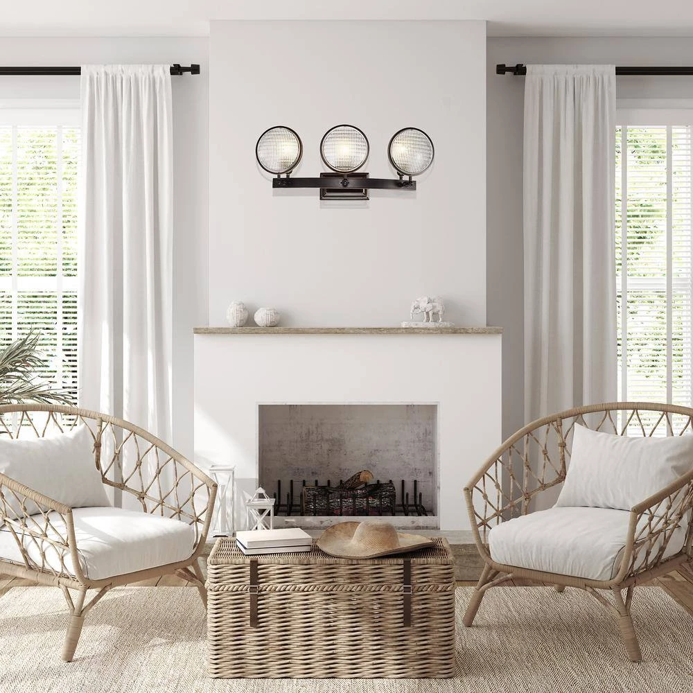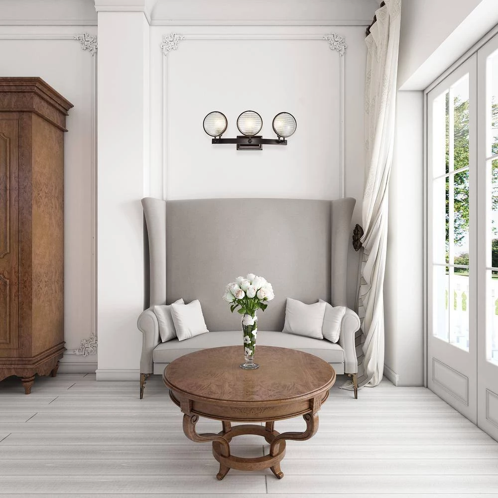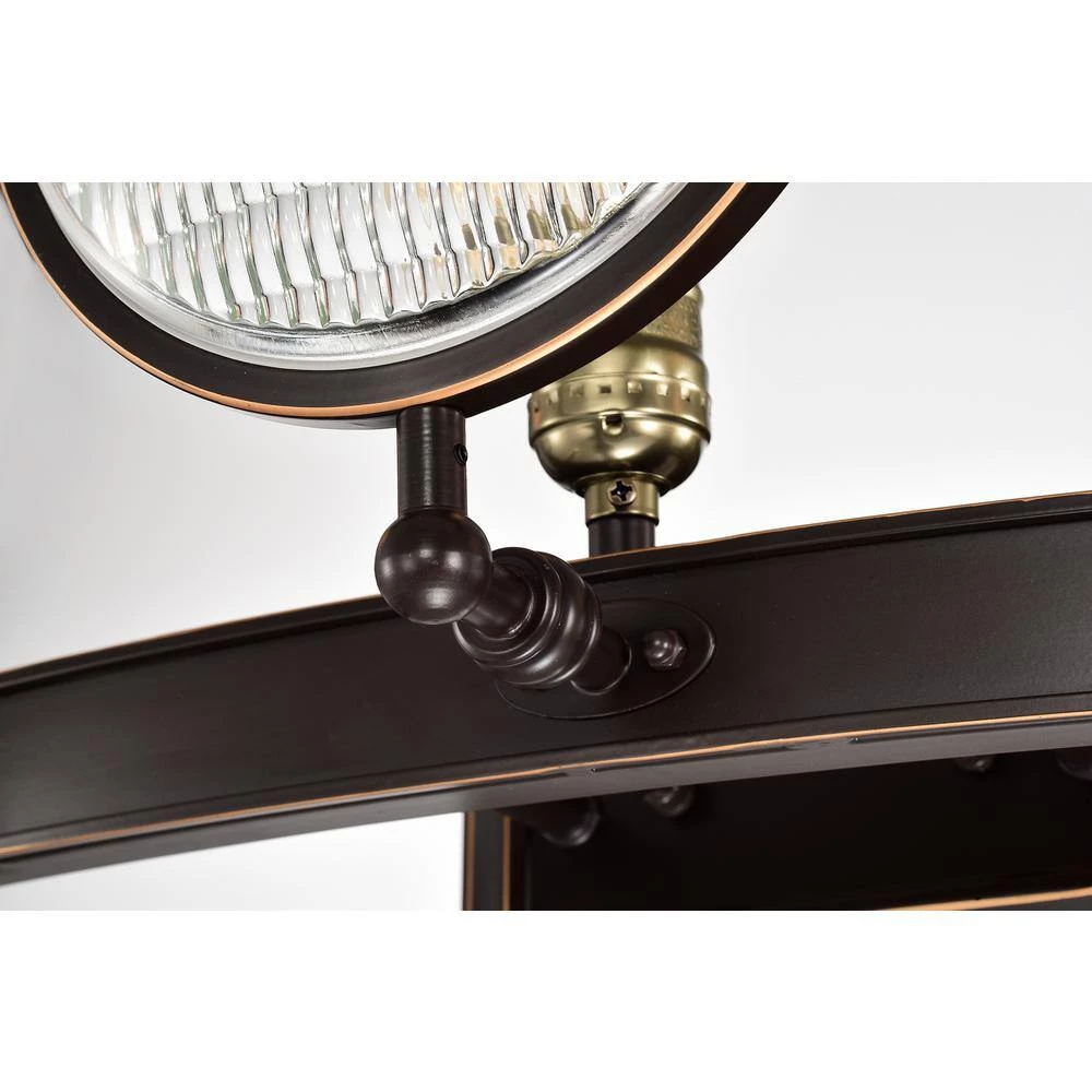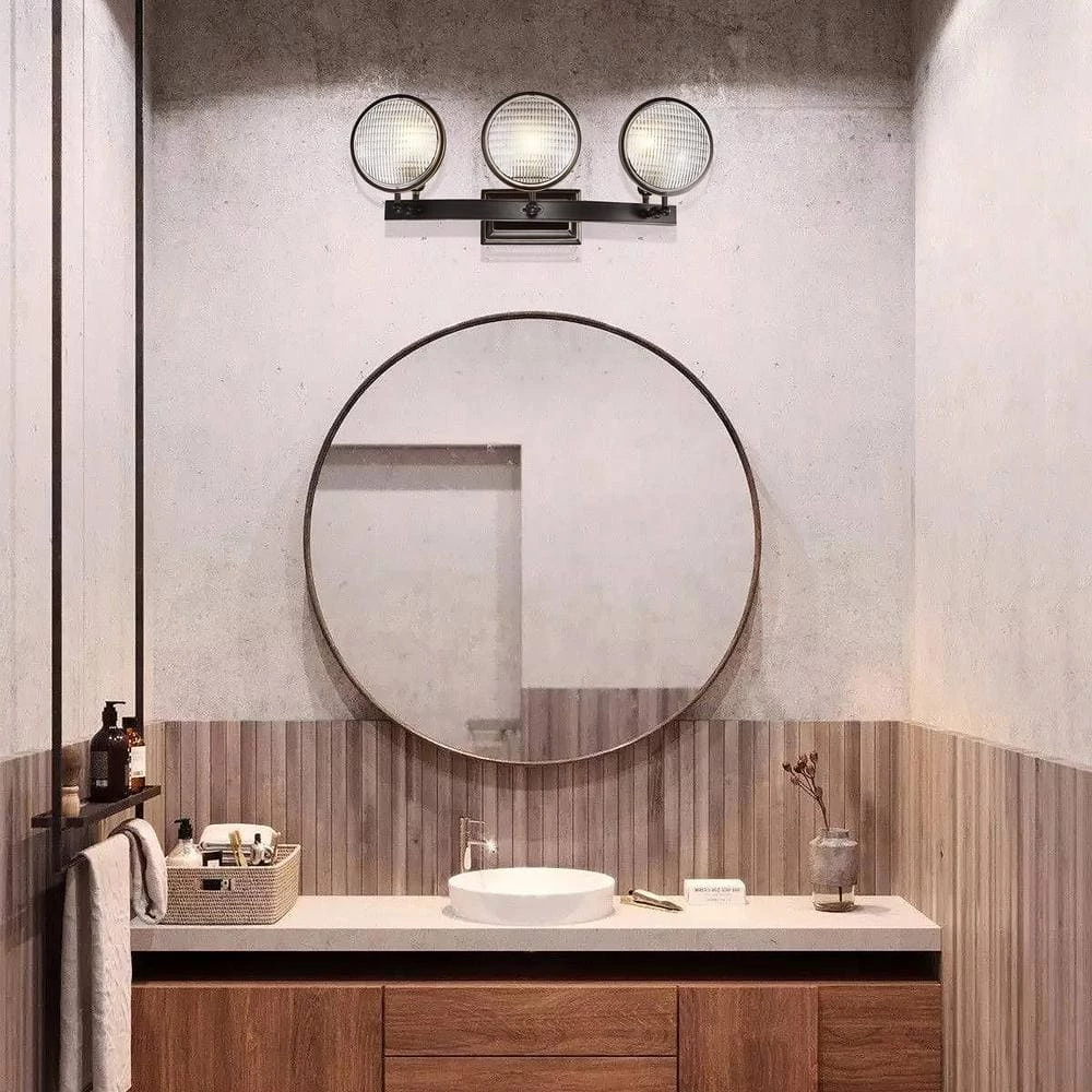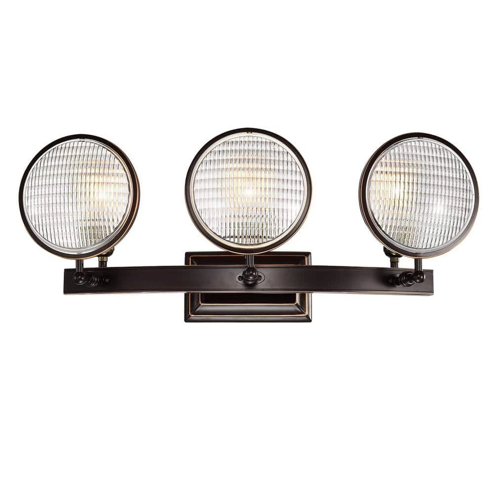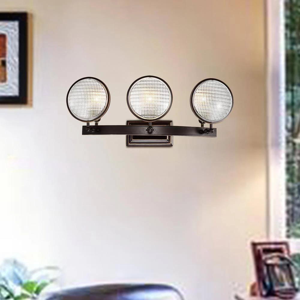 The authentic automobile headlight glass in this modern vanity light makes this piece bold and dramatic, perfect for kitchens and man caves. Modern blends with industrial as the 3-lights shine through the textured round glass of this bronze vanity light. The oil rubbed bronze hardware finishes off this wall sconce and makes it a conversation starter.
