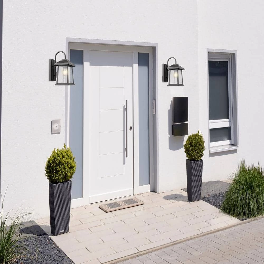 This wall lantern combines textured black metal with clear seeded glass to create a geometric pattern. The lantern housing of this outdoor wall sconce is held in place by a curved arm that connects to a matching rectangular wall plate. The open bottom of this transitional wall light allows you to easily change bulbs while the black finish fits into any design. Easy install.