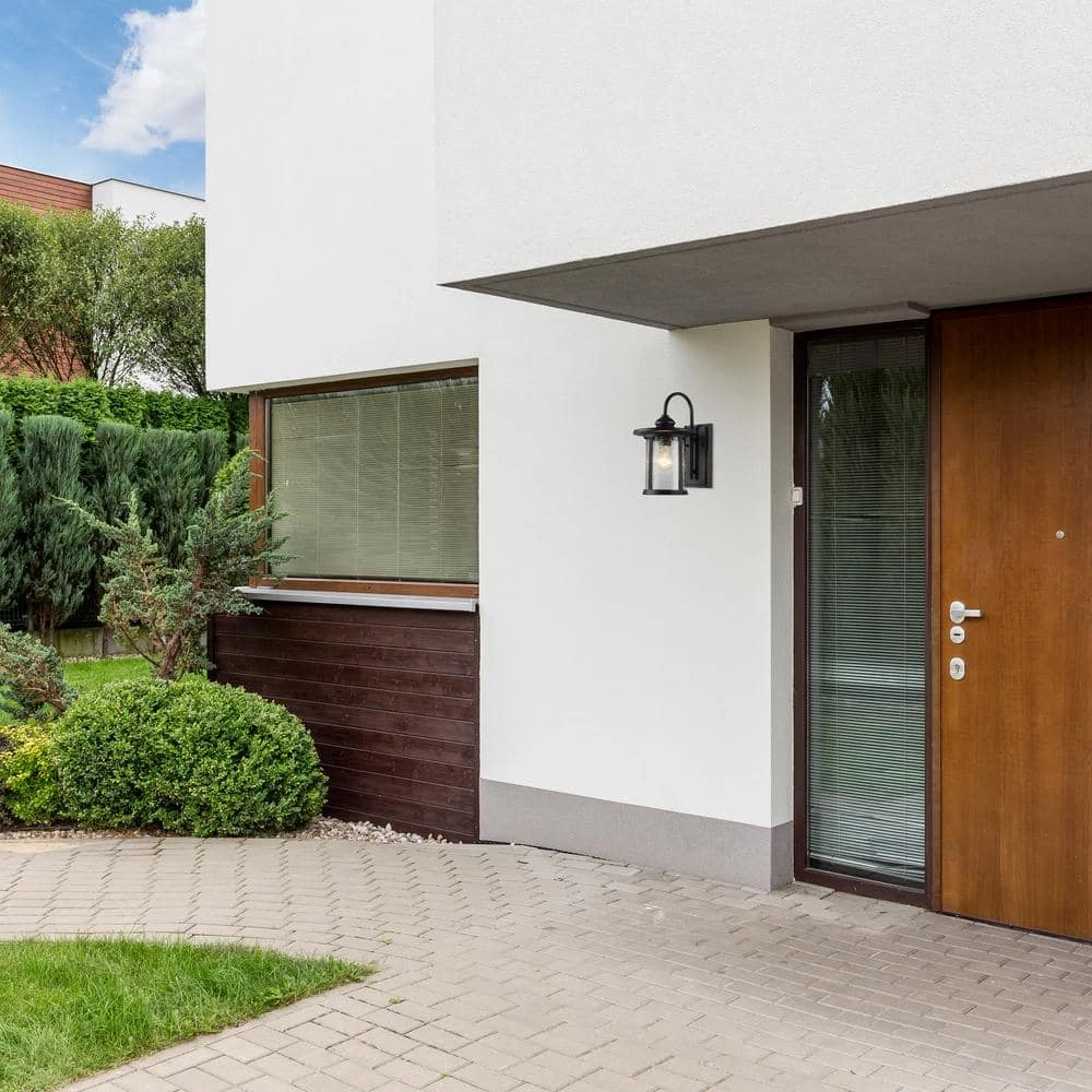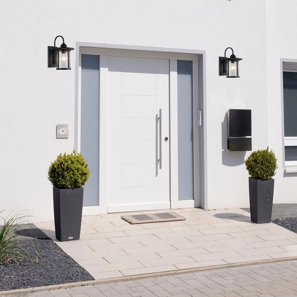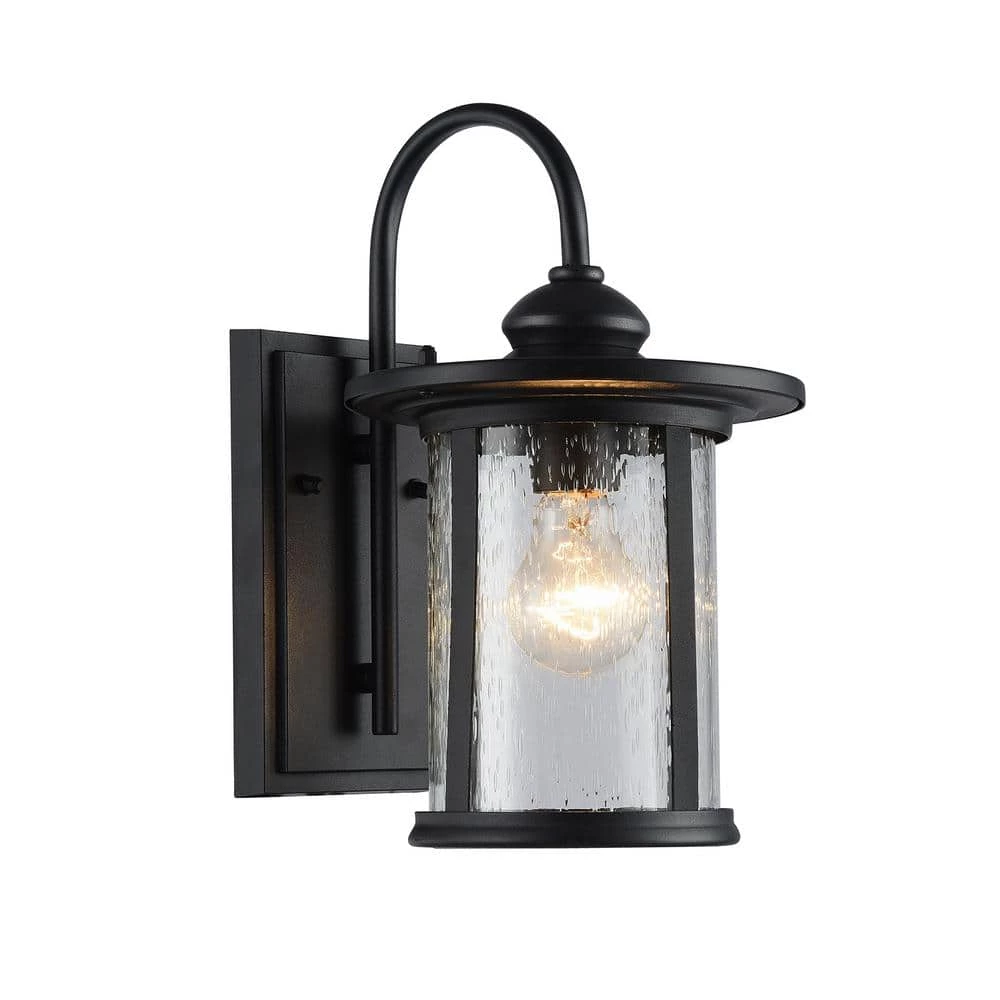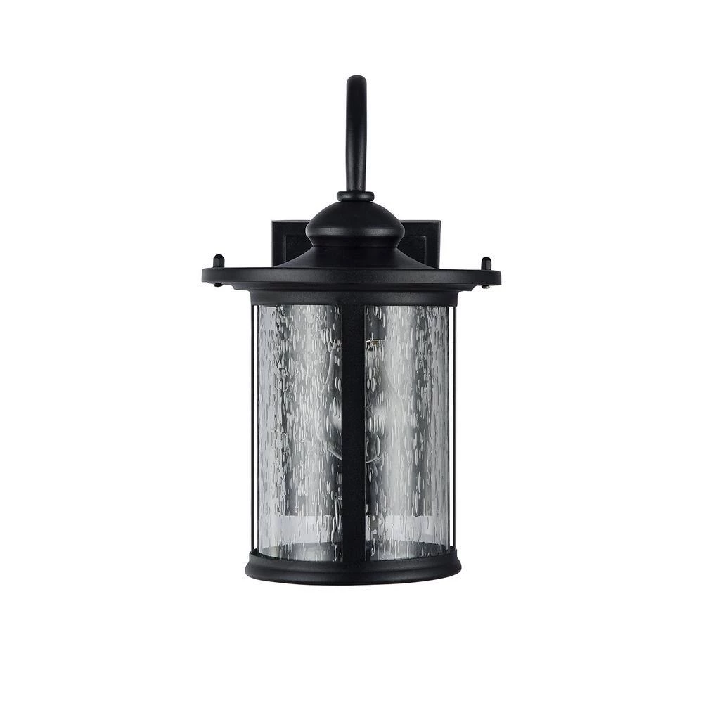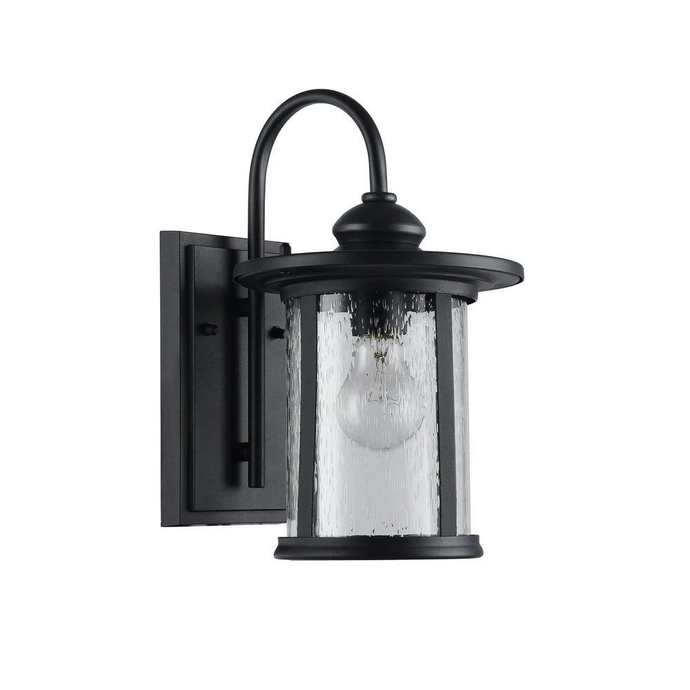 This cylindrical wall sconce will welcome guests to the entrance and front of your home. This wall lantern combines textured black metal with clear seeded glass to create a warm, friendly first impression. Black metal lines create a design element in this outdoor wall light that is eye-catching. The open bottom allows you to easily change bulbs while the black finish fits into any design.