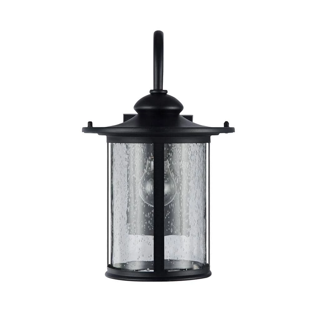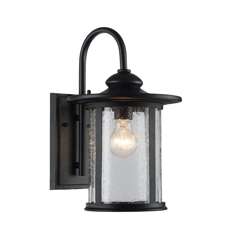 This Gemma classic outdoor wall sconce will surely create a welcome glow to the entrance of your home. Available in a smaller size, this wall lantern combines textured black metal with clear seeded glass to create a warm, friendly first impression. Black metal lines create a design element to this outdoor wall light that iseye-catching. The open bottom allows you to easily change bulbs while the black finish fits into any design.