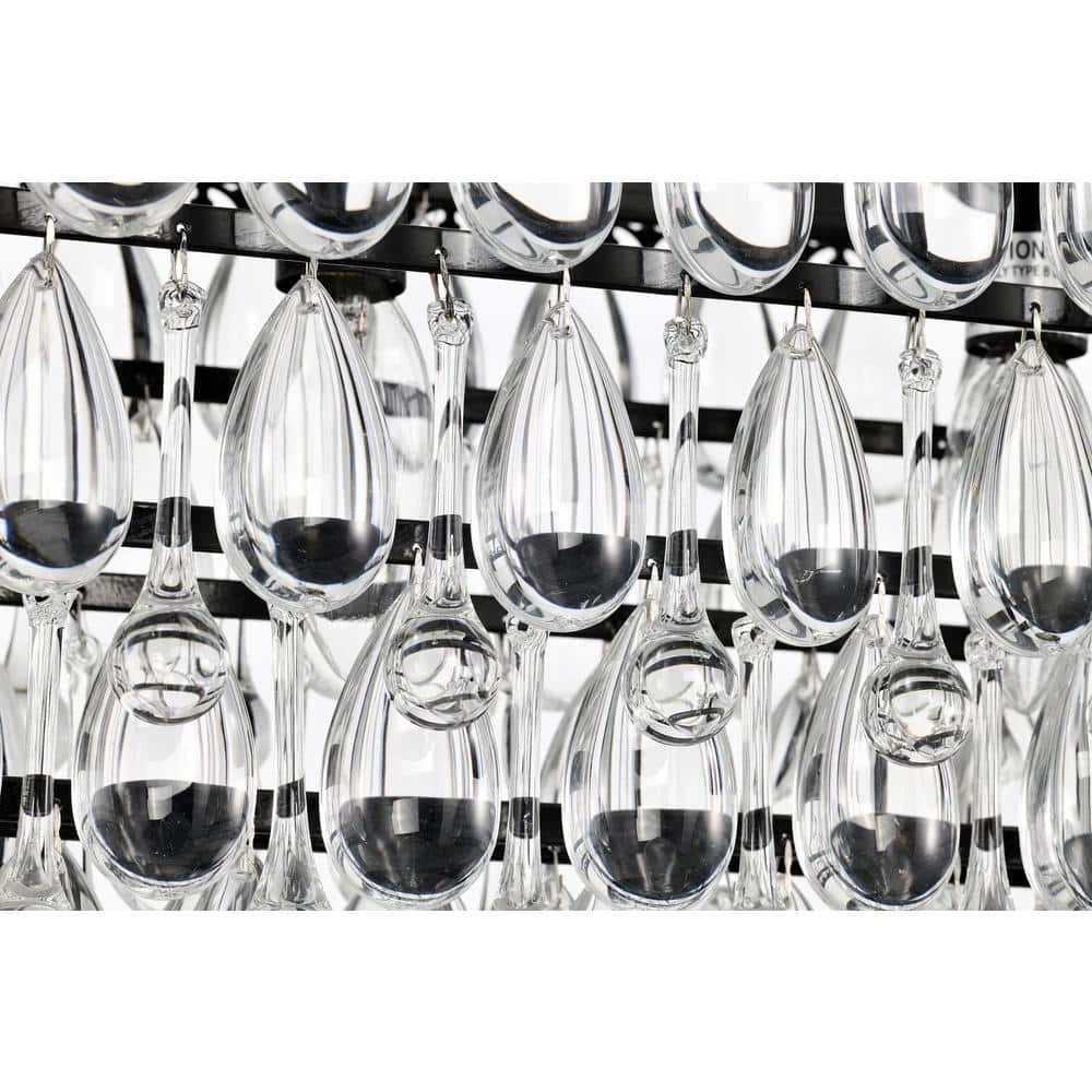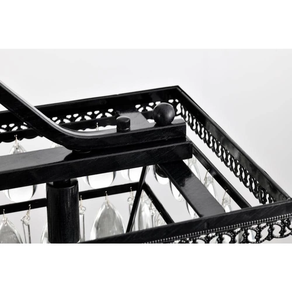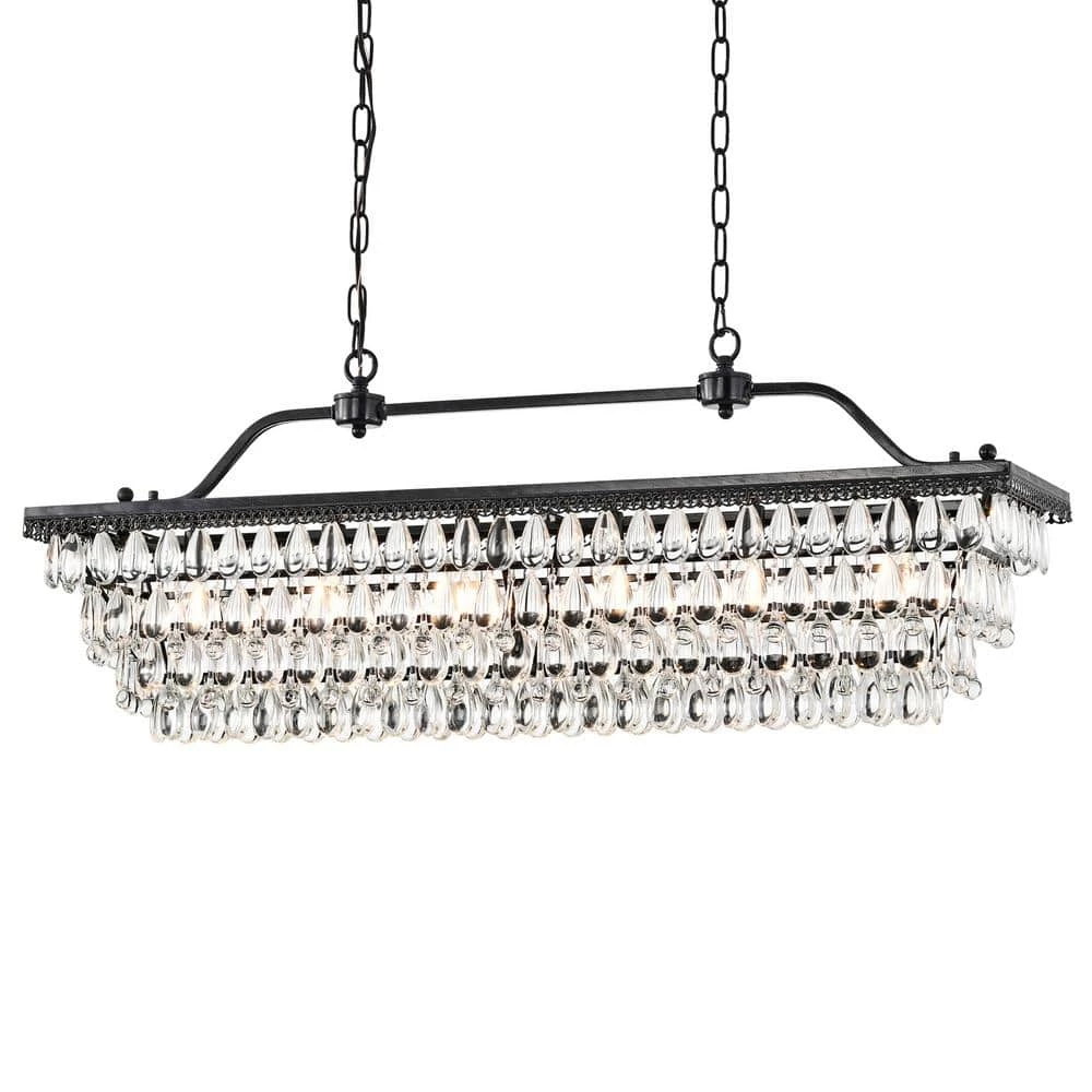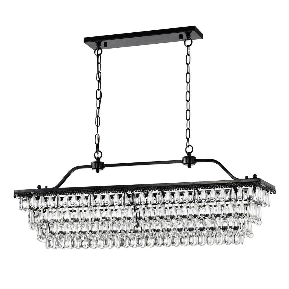 From the beloved Chiara collection, the 6 light rectangular crystal chandelier is now available in a black finish to suit any interior design style. The rectangular and linear shape of this light makes it perfect as an over the island chandelier or dining room chandelier. The 4-tiers of alternating teardrop and raindrop crystals form a beautiful cascading effect. The 6 light design allows for plenty of light to filter through the crystals and brighten the home. Hanging from a 40 in. adjustable chain, the hanging height may be shortened to suit lower ceilings.
