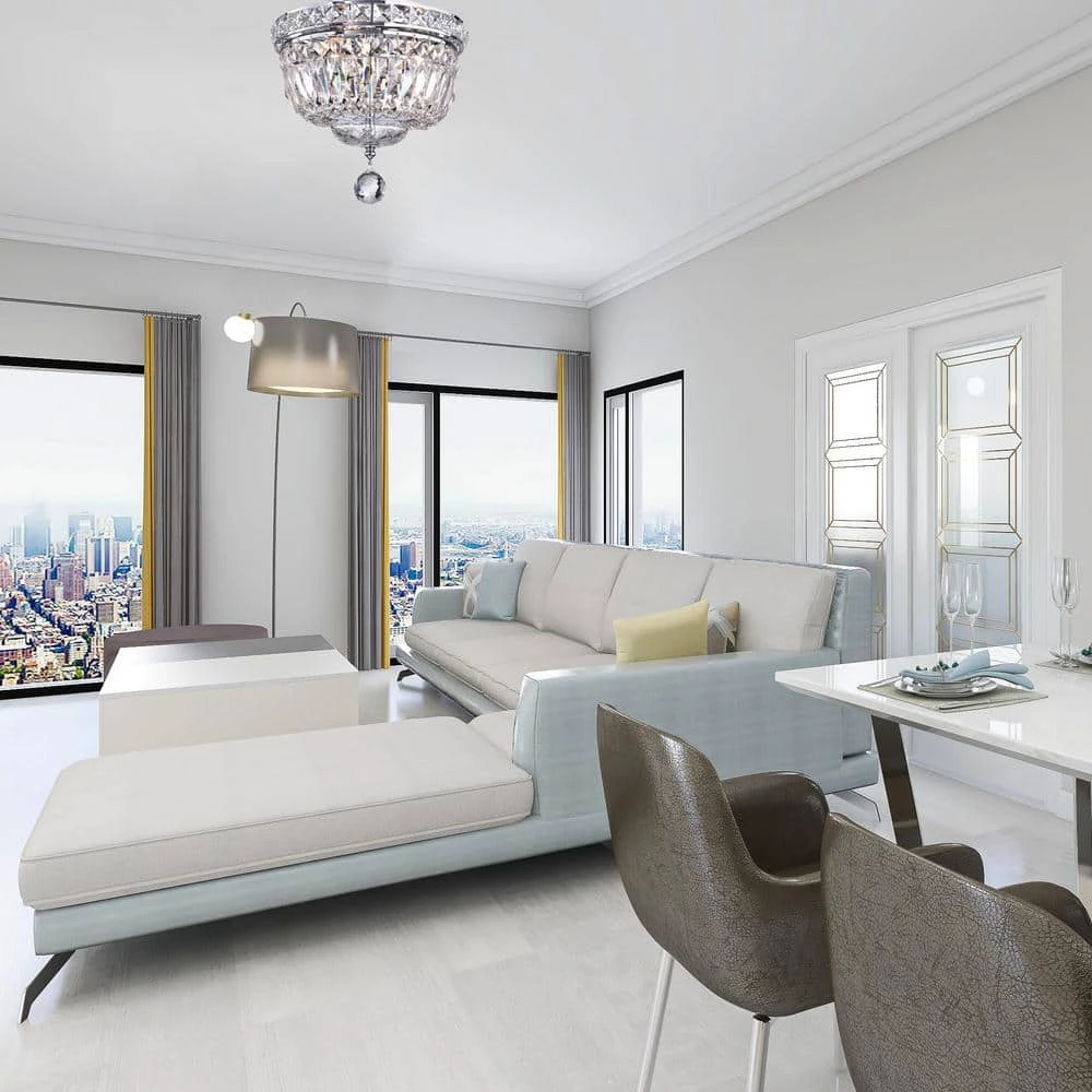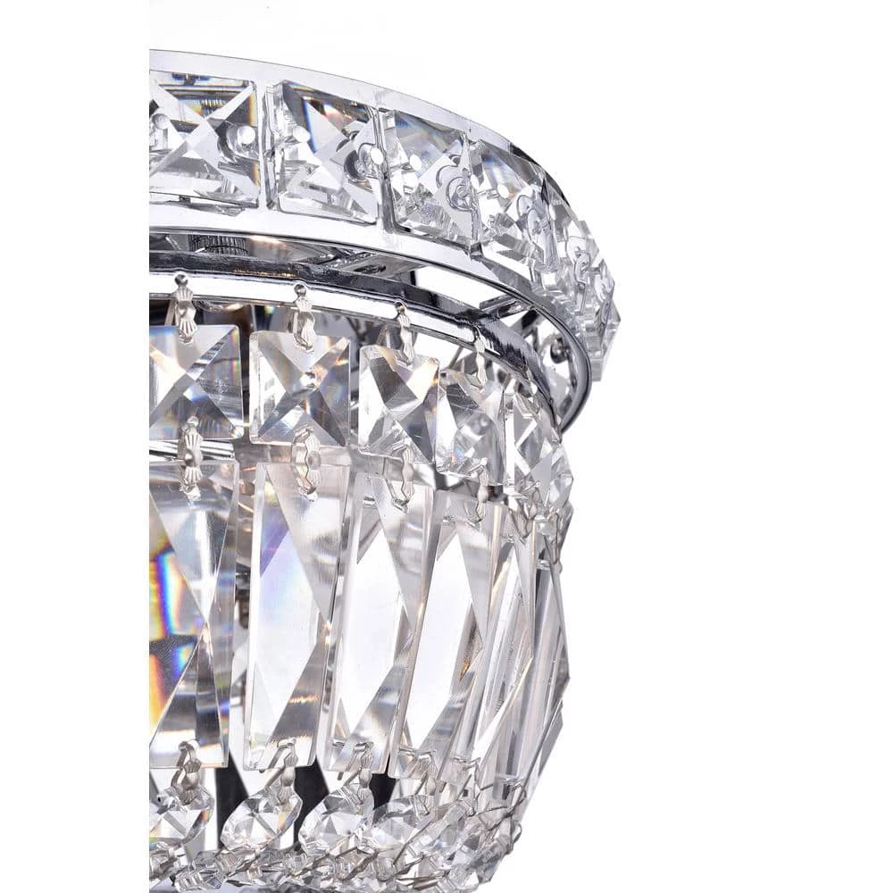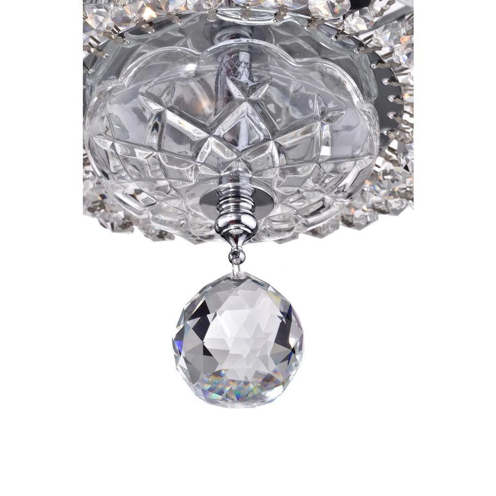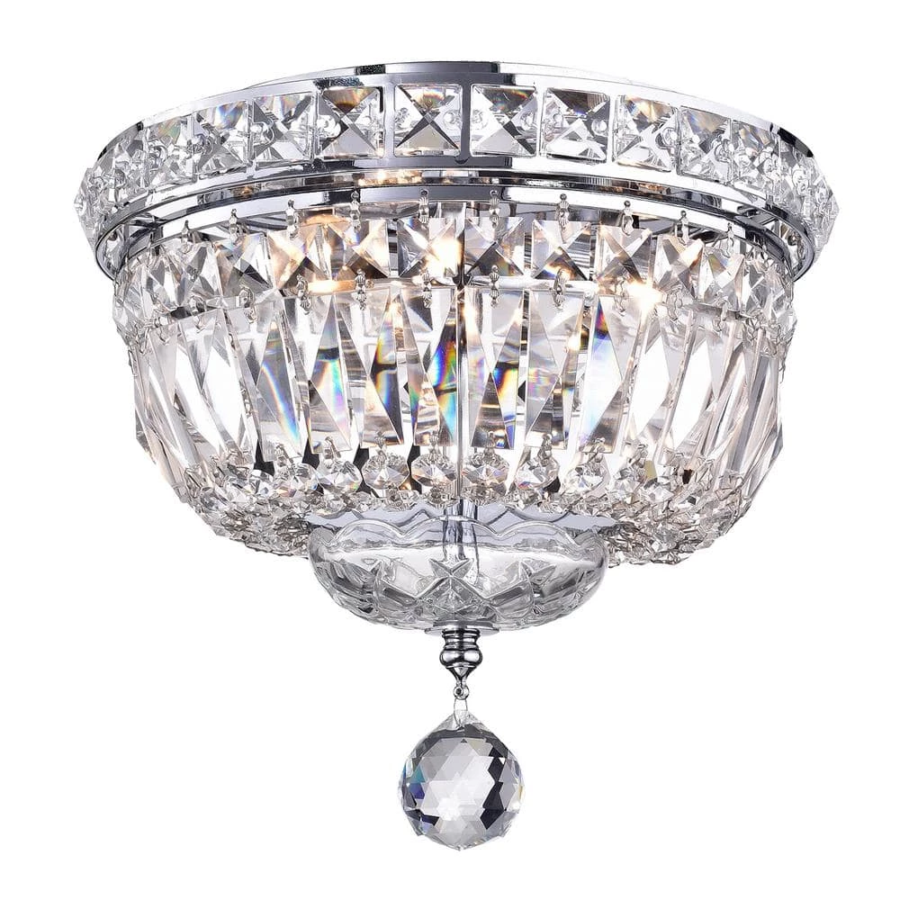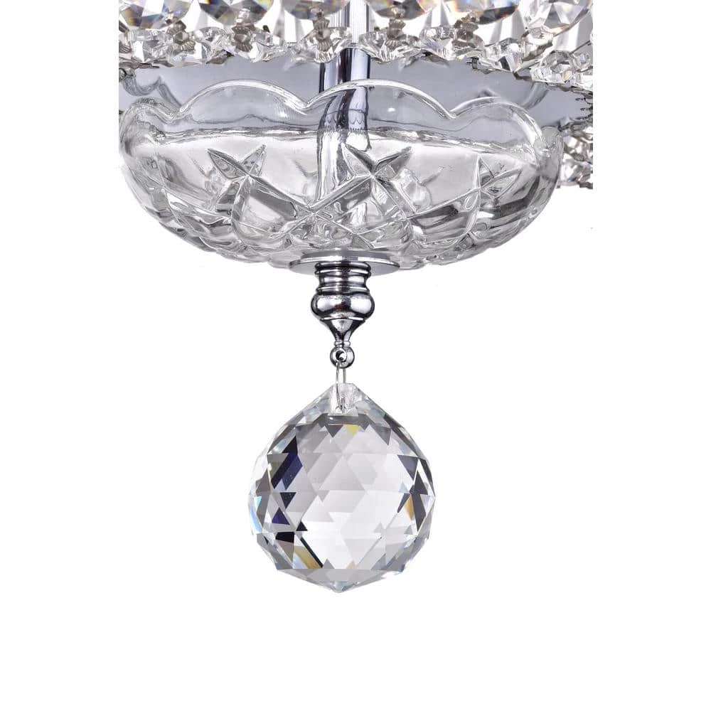 This dazzling flush mount chandelier creates an ambient glow. The cascading crystal strands cover 3 bulbs and combined with the chrome finish, creates a shimmering effect. This gorgeous light is finished off with a large diamond cut crystal bulb attached to a chrome finial surrounded by a cut-glass plate. At 9.7 in. in Dia and 9.2 in. H this beautiful fixture makes a statement in even the smallest of spaces.