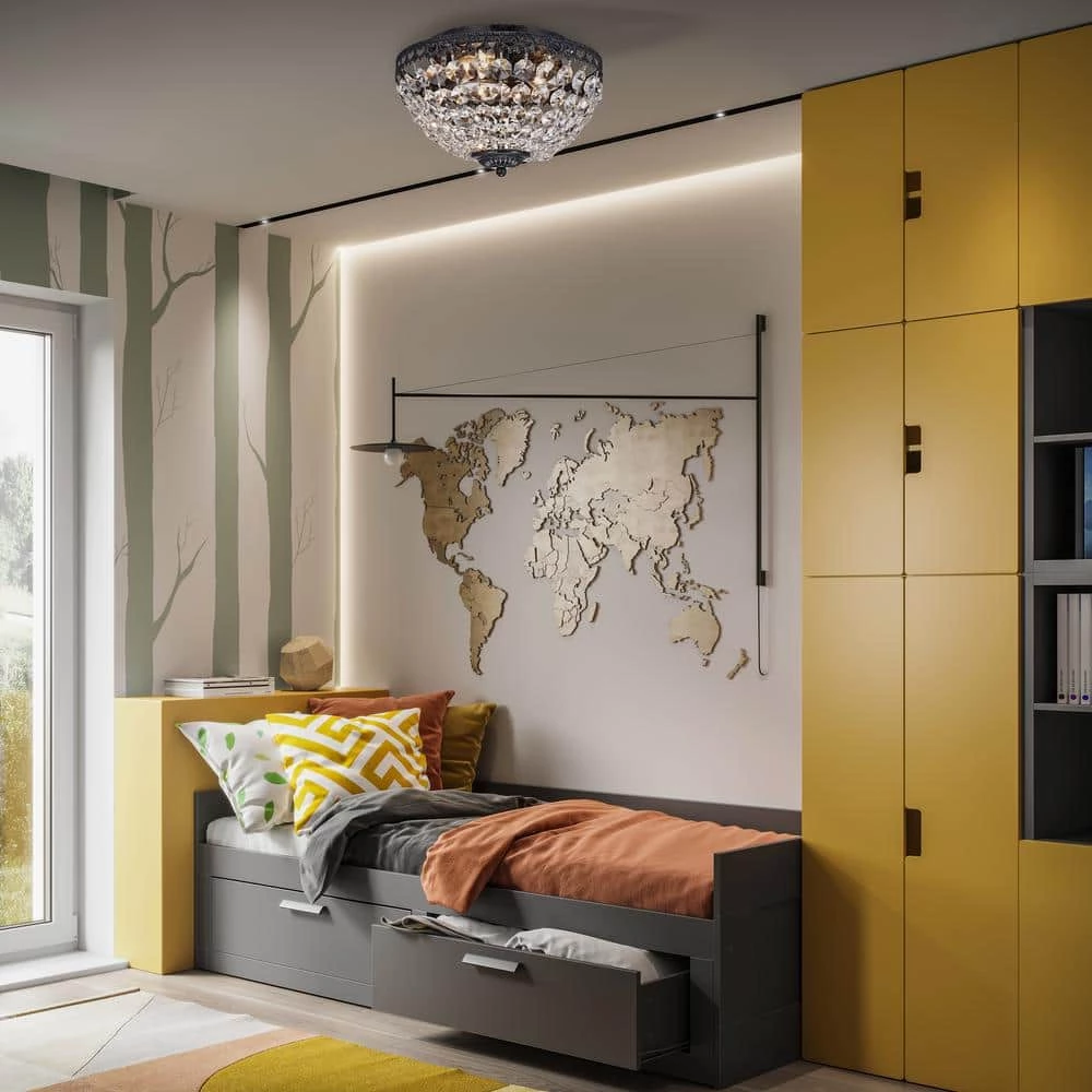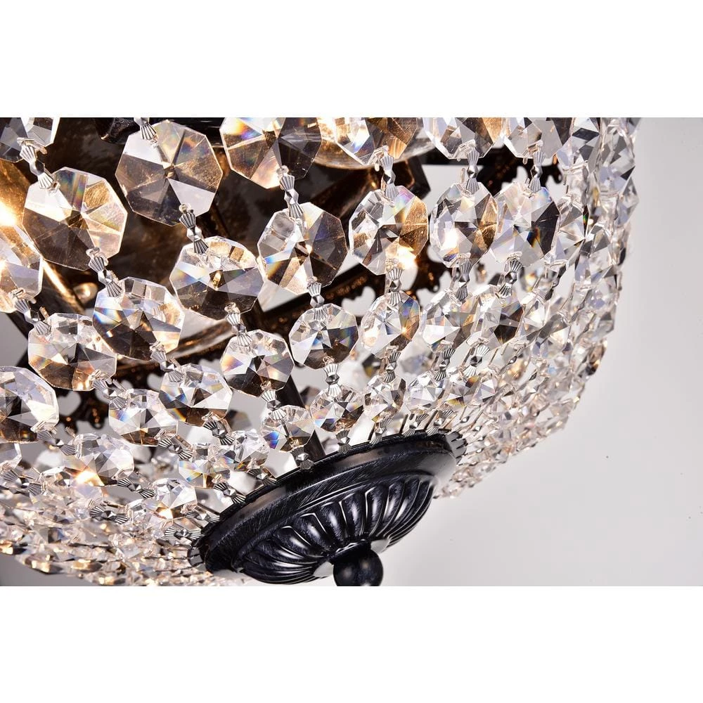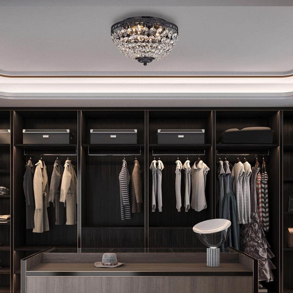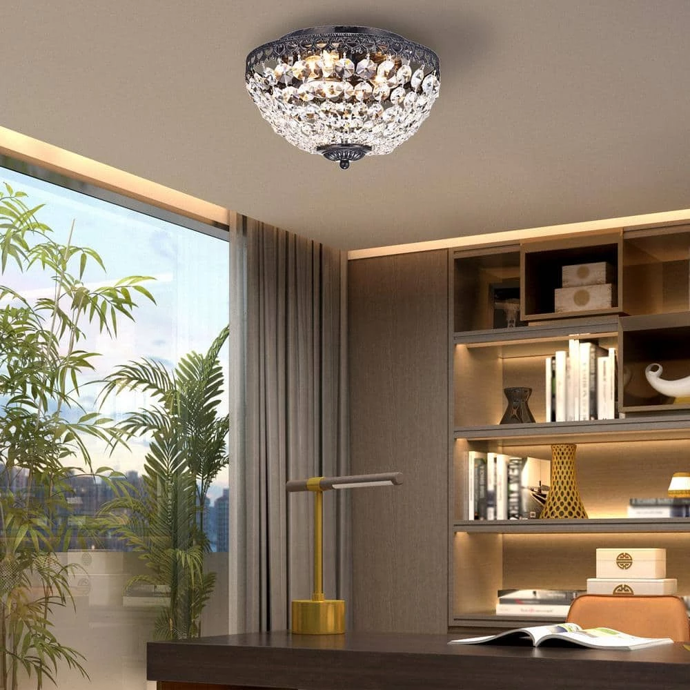 This beautiful and traditional black crystal chandelier is flush mounted, perfect for tight spaces or low ceilings. This glam flush mount features 3-lights and creates a glow of light around it that adds an ambiance to any room. The dazzling crystals contrast with its black metal design and creates a gleaming sparkle. It is 12 in. W, 7.5 in. H making this crystal flush mount the perfect size for an entryway, hallway, dining room, closet or girls room.